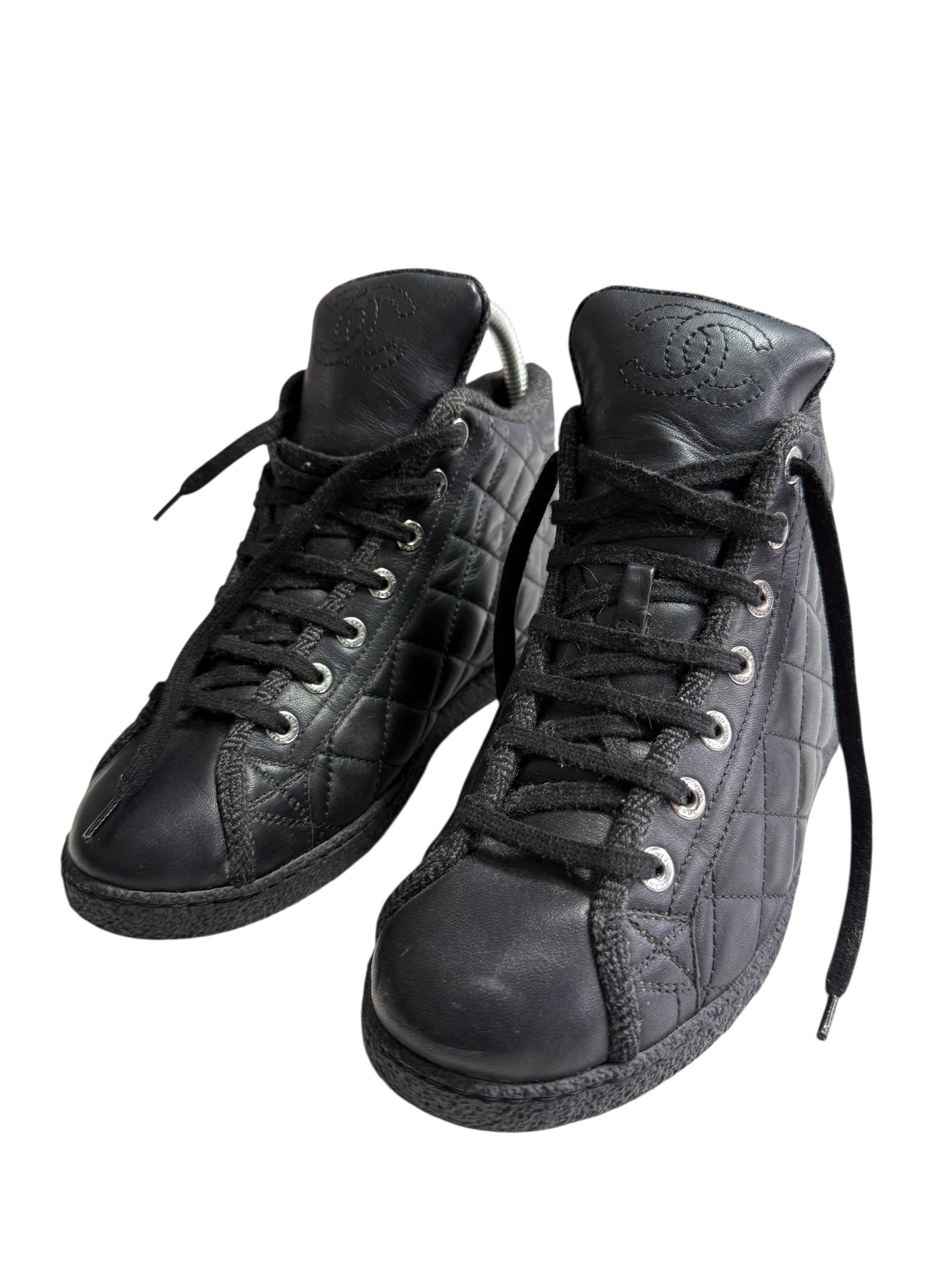 Vintage Chanel Black Quilted Leather High Top Sneakers CC Logo