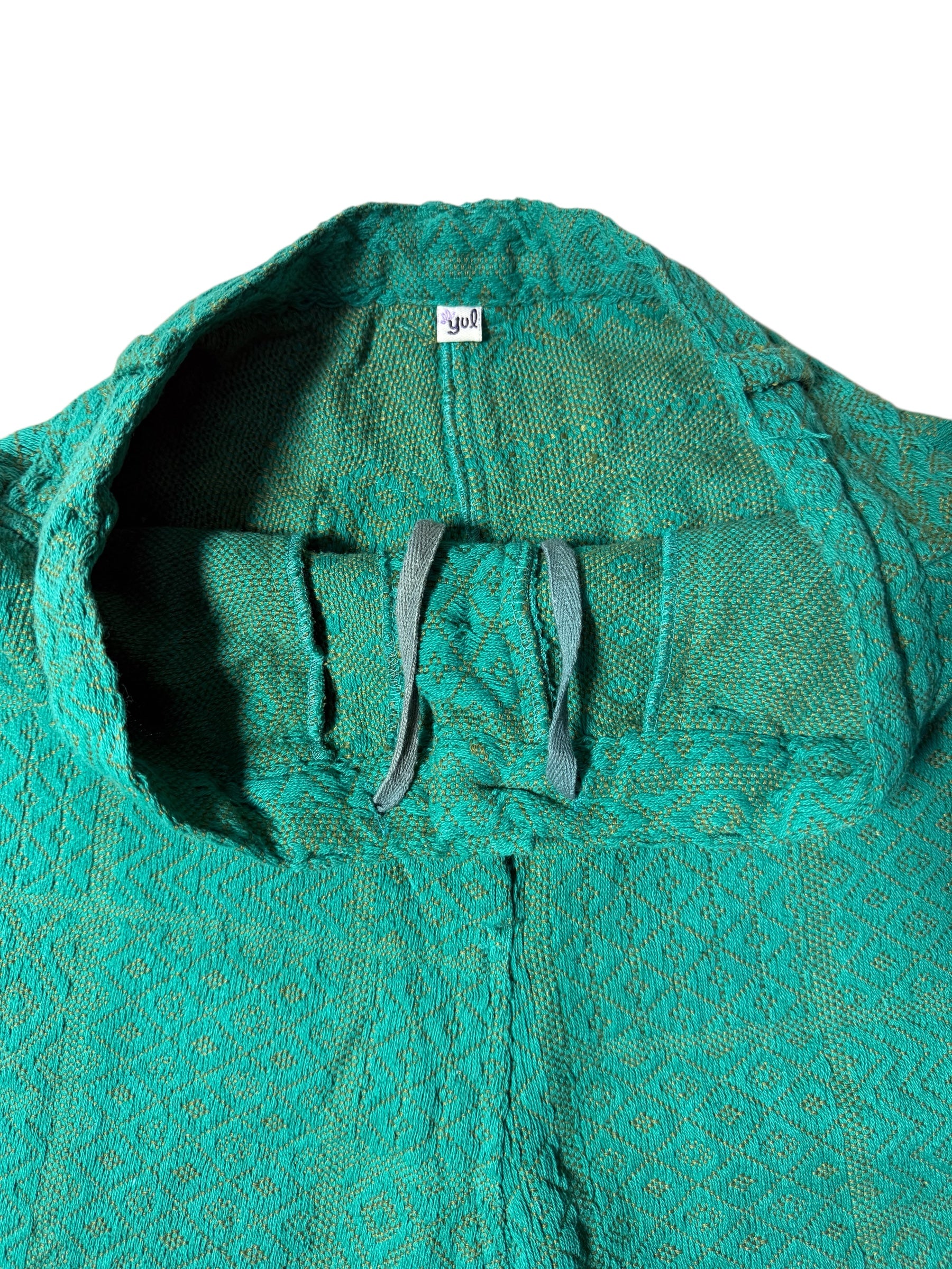 Japanese-import woven textured pants by Yul (Amina Collection) featuring a rich emerald green base with an artisanal diamond-and-chevron weave pattern. Made in India for the Japanese market, early-2000s production. Button-fly front, thick woven fabric, rear pockets, and adjustable button tabs at the cuffs, giving it a craft, boho, and folkloric vibe.