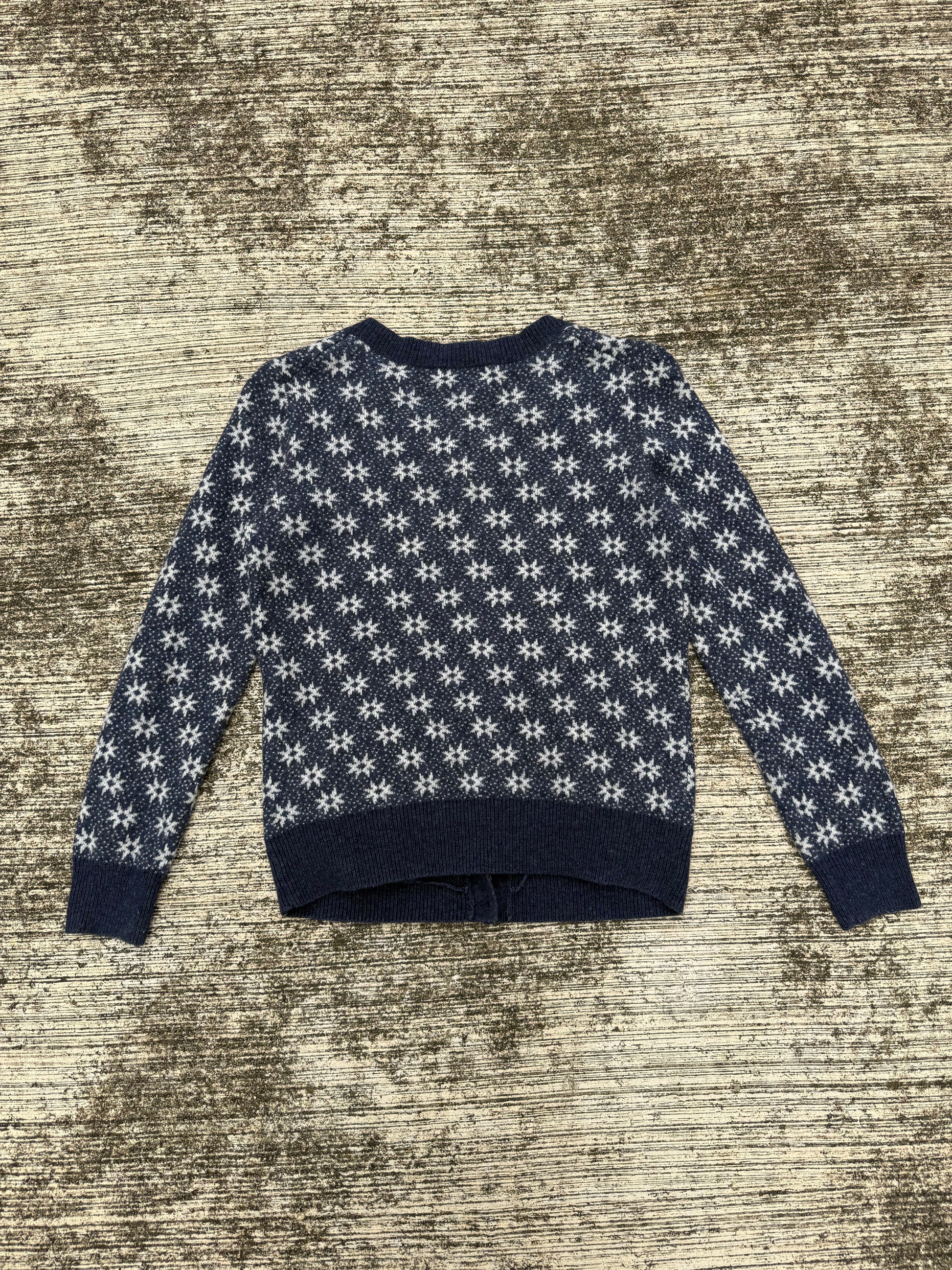 Original A.P.C. Rue Madame Paris cardigan featuring all-over snowflake jacquard pattern in navy and off-white. Crafted in France from soft wool-blend knit with ribbed cuffs, hem, and button-up front. Minimal, classic Parisian design perfectly captures early-2000s A.P.C. simplicity and understated elegance.