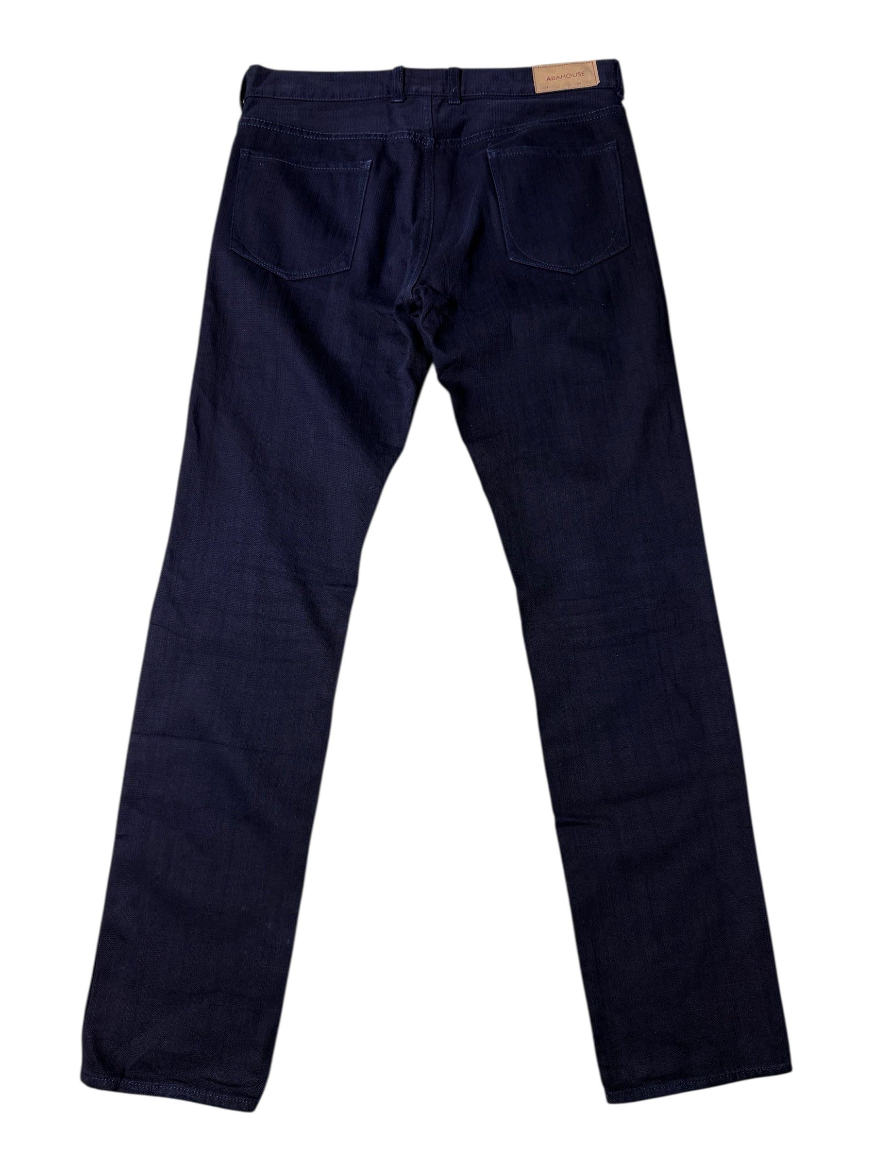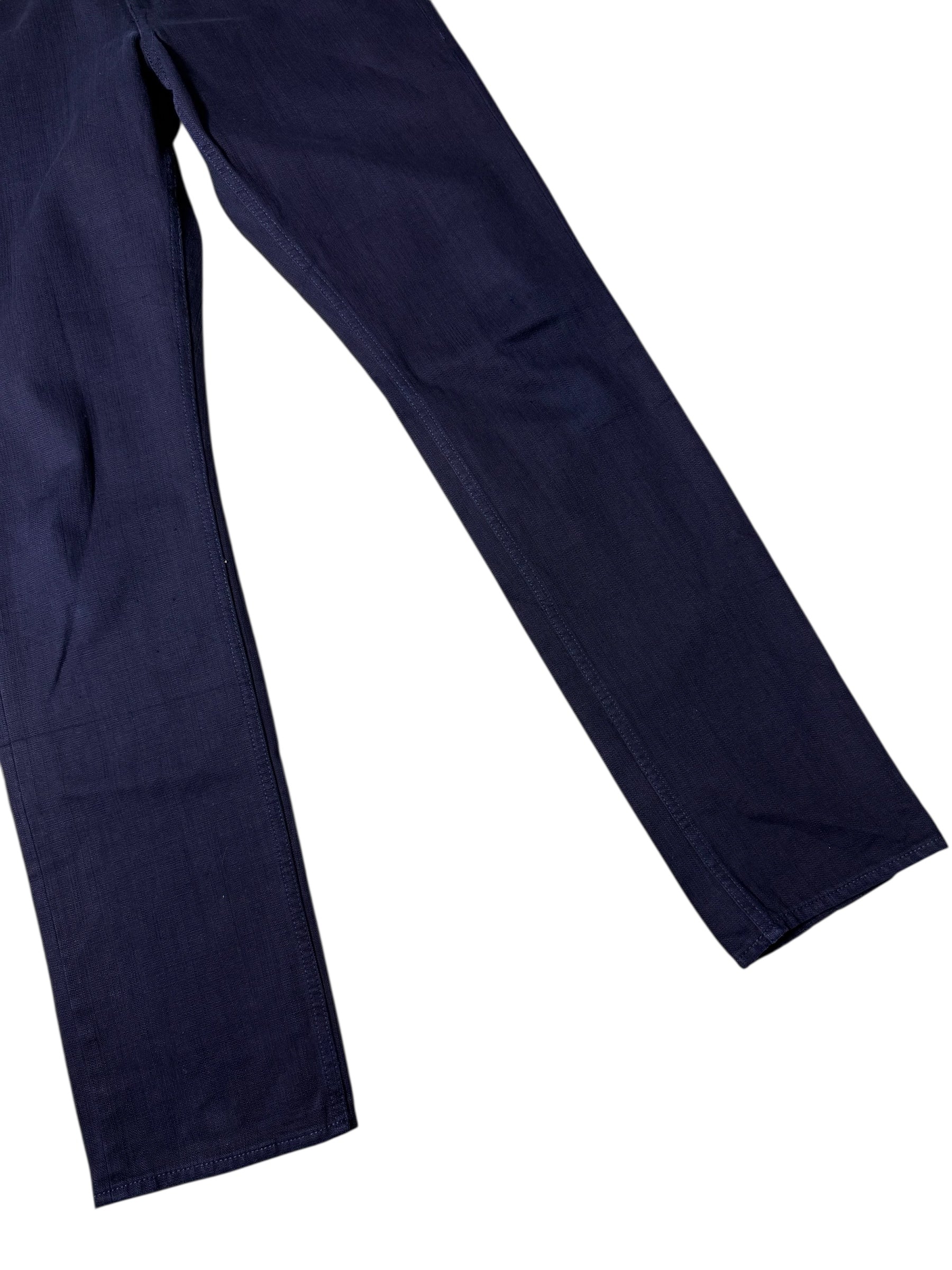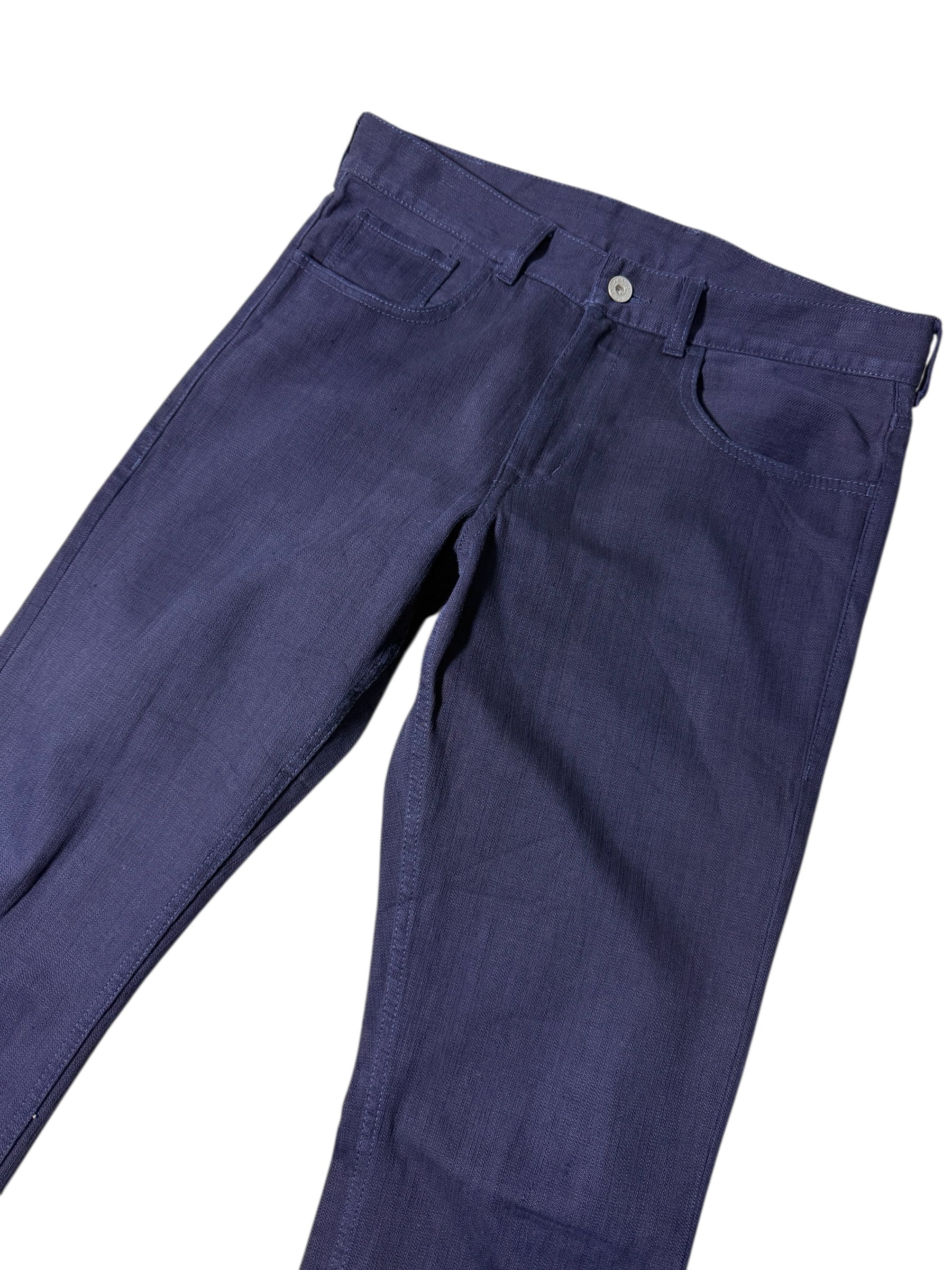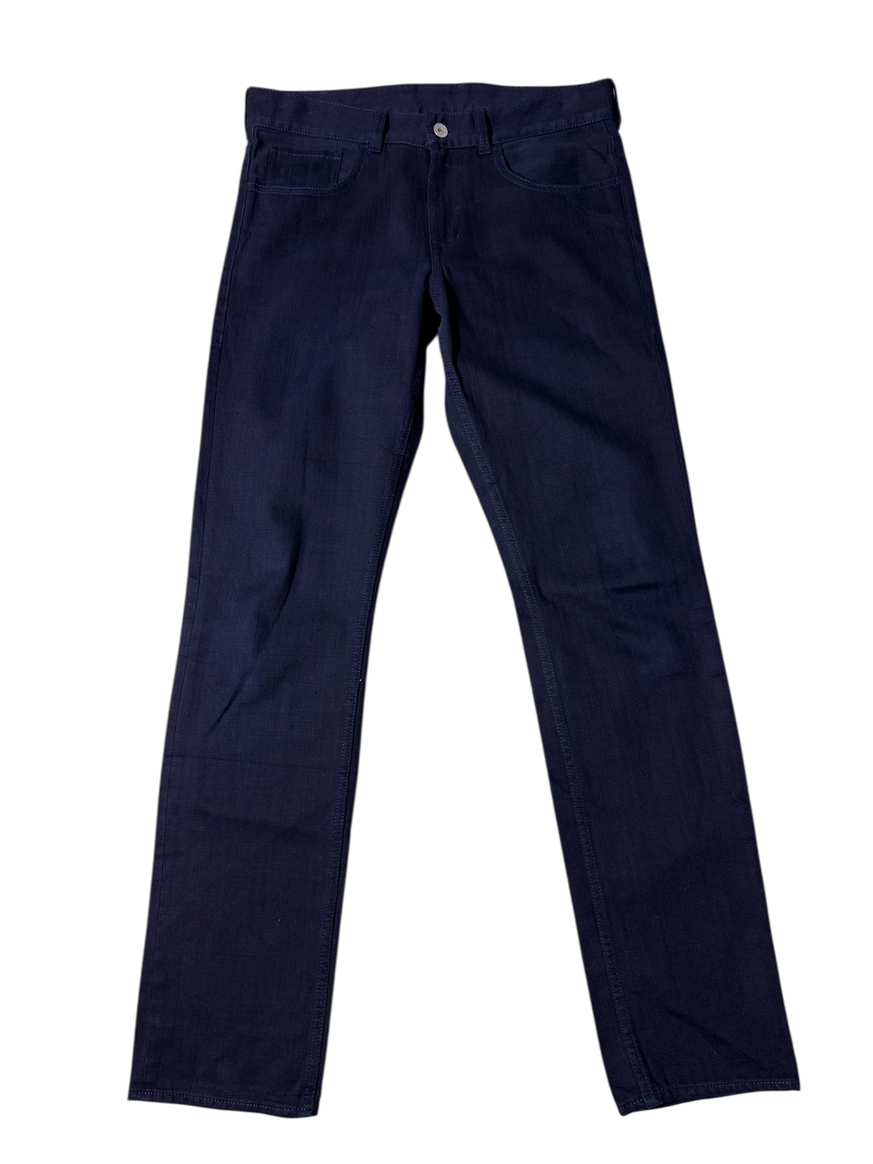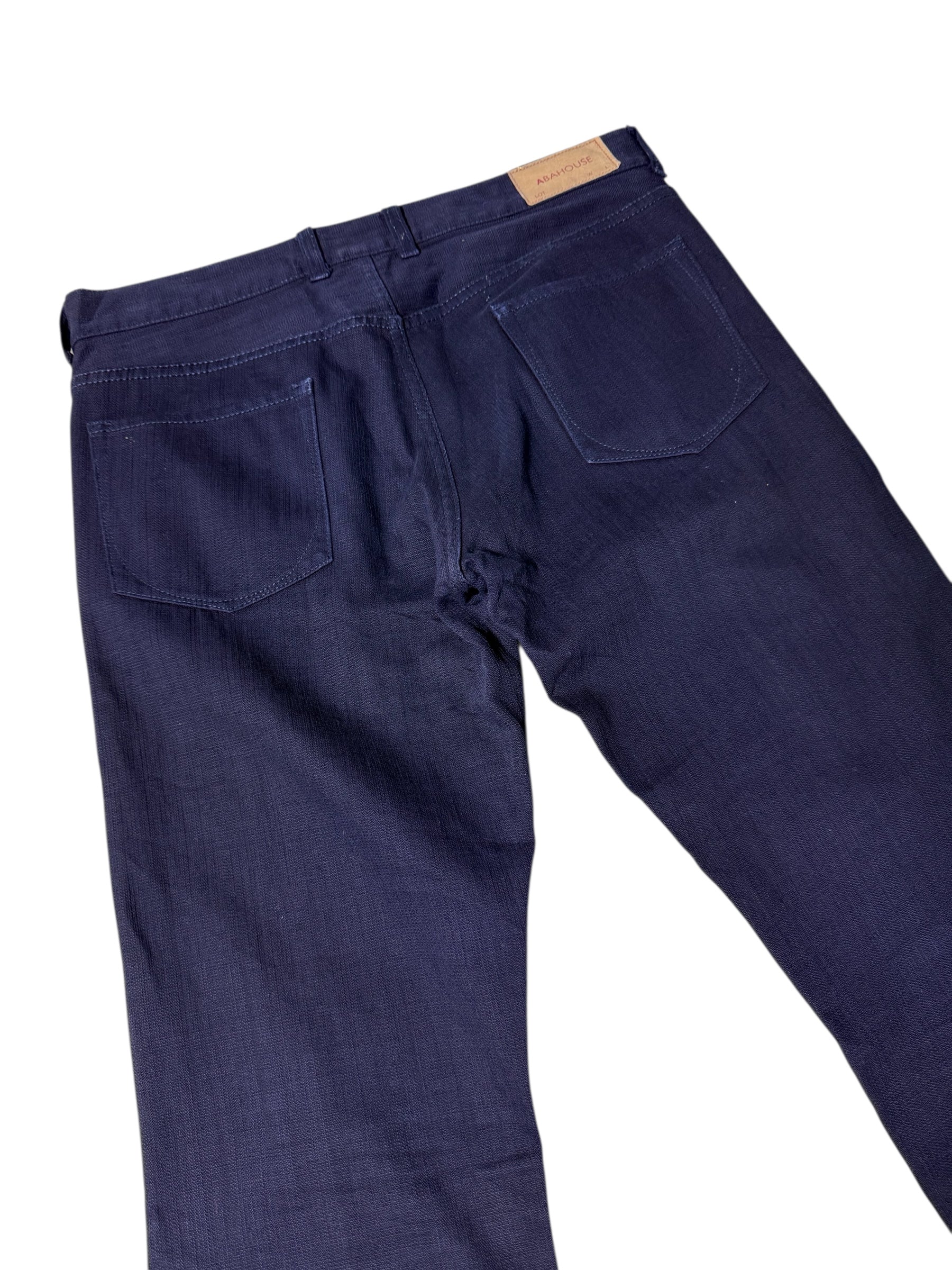 2000s ABAHOUSE Japan textured cotton twill pants in deep navy. Clean minimal design with a straight leg cut and lightweight woven twill fabric, smooth, breathable, and structured. Simple 5-pocket style with zip fly and subtle Japanese contemporary aesthetic.