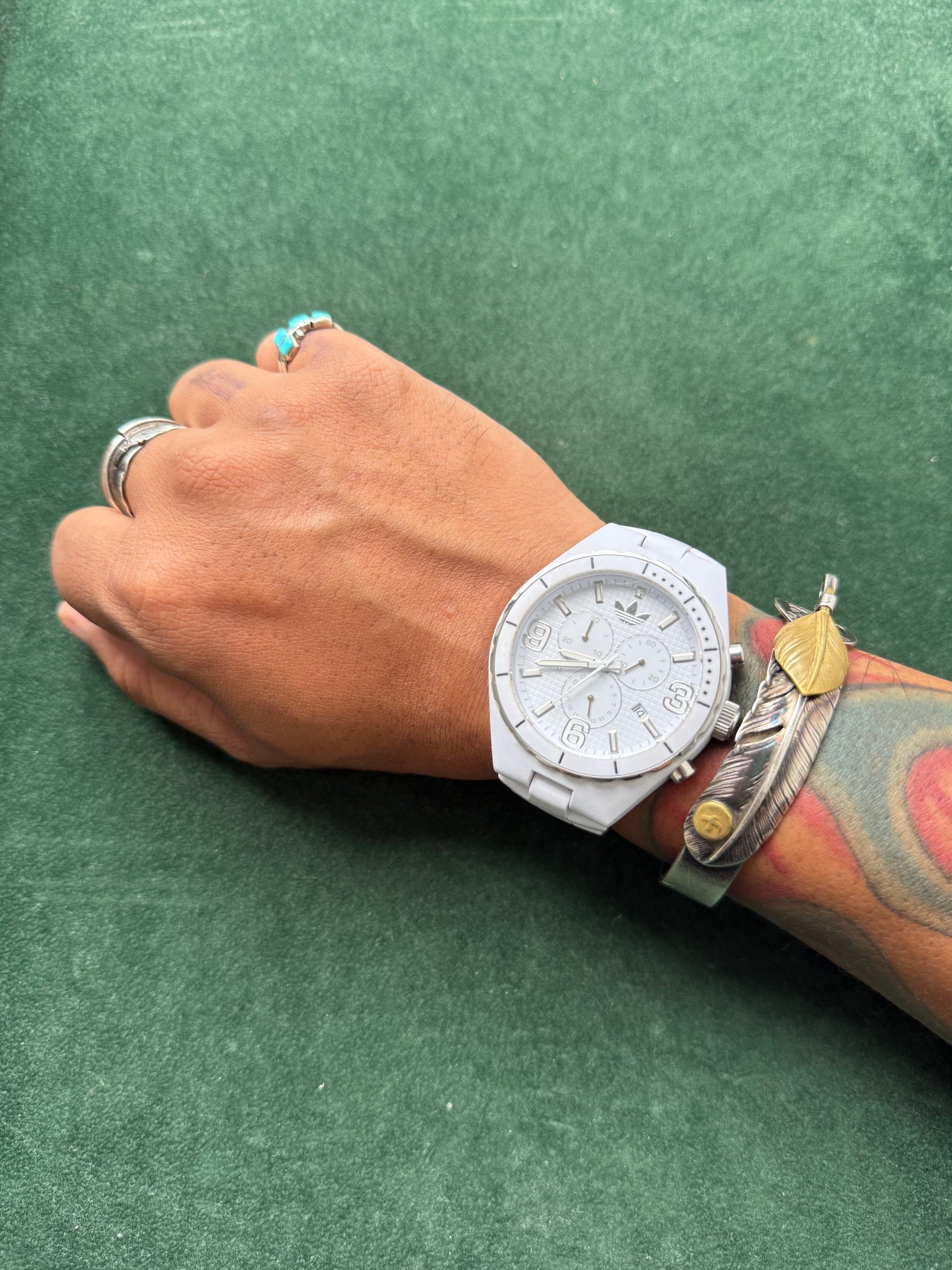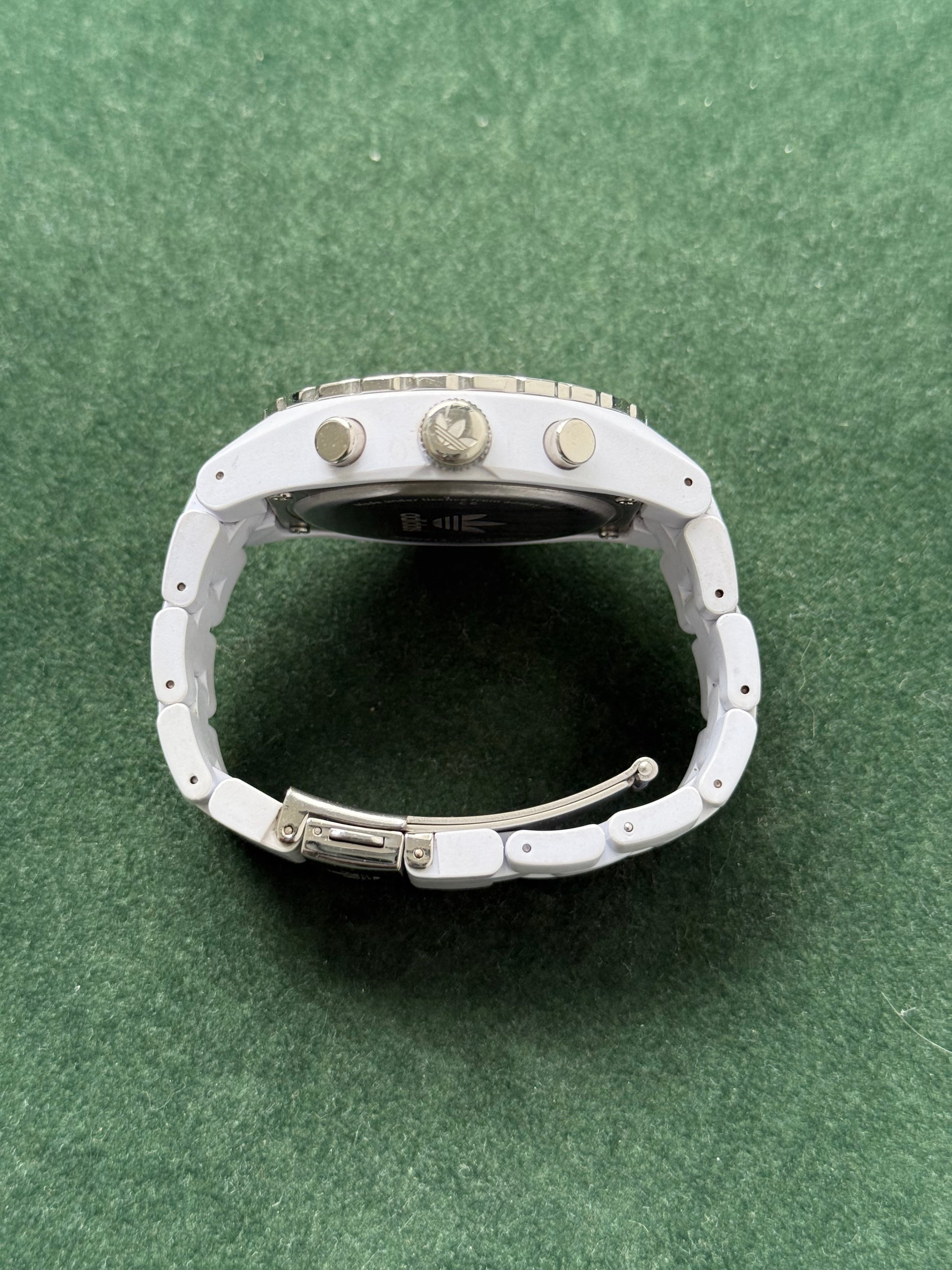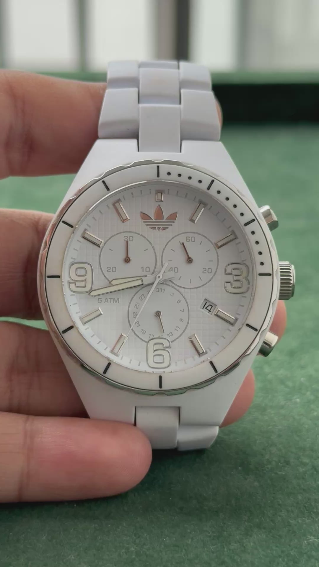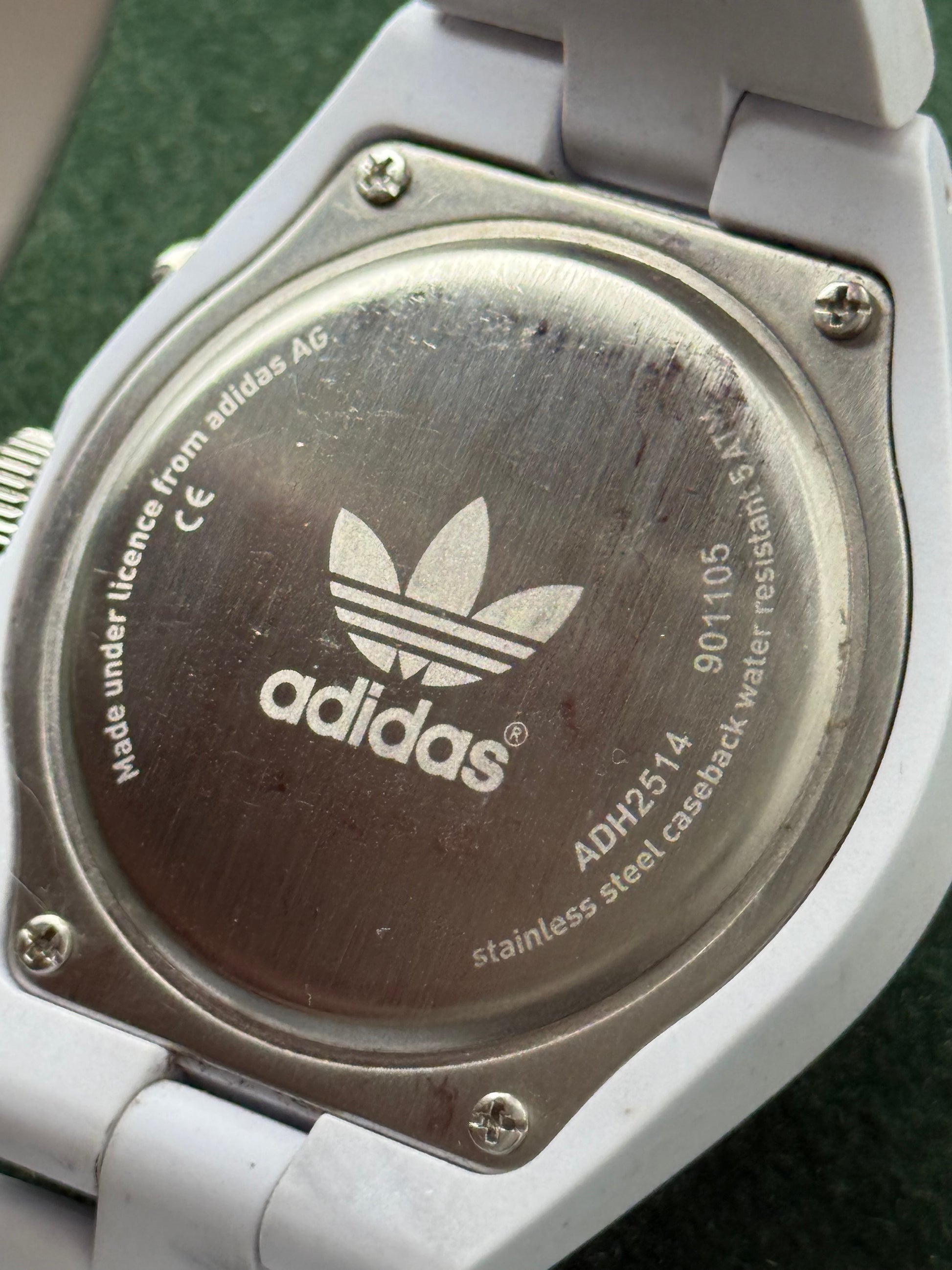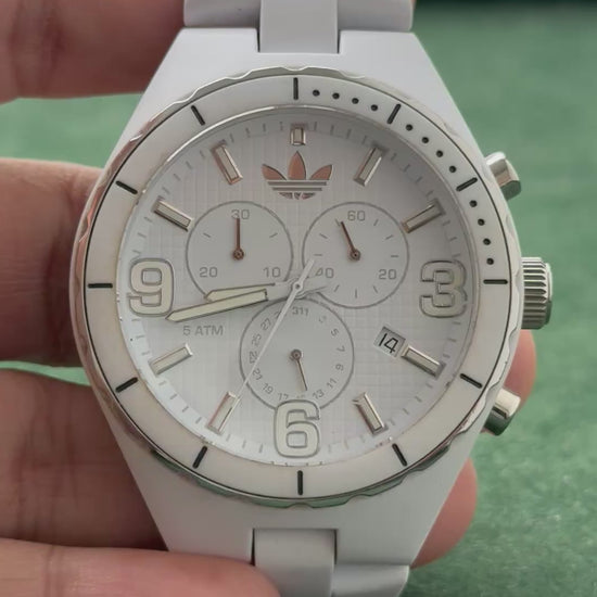 Original Adidas Originals wristwatch featuring a bold white case and bracelet design, with textured dial, luminous hands, and three sub-dial chronograph function. Stainless steel caseback signed “Adidas ADH2514.” Rated water resistant 5 ATM. Large sporty 44mm case with Adidas trefoil branding at 12 o’clock.