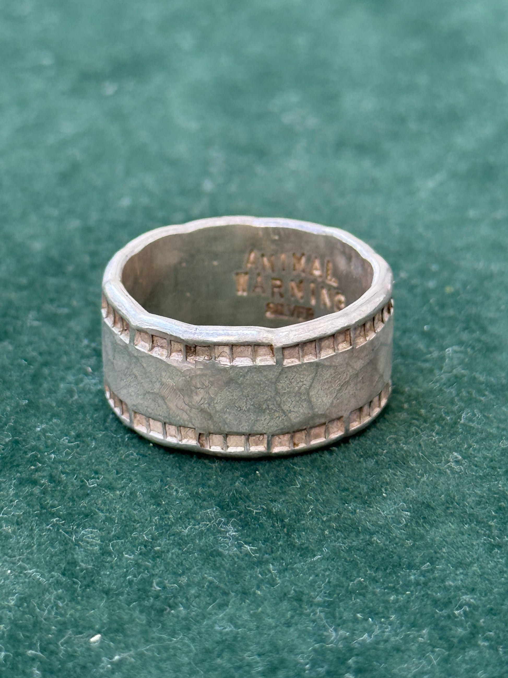 Bold contemporary sterling silver ring by Animal Warning, a Japanese silver jewelry brand known for its streetwear and biker-inspired designs. This wide band features a textured hammered finish with decorative edging, giving it a rugged artisanal character. Stamped “ANIMAL WARNING SILVER” inside the band, confirming authenticity. A solid unisex statement piece that reflects the Japanese street silver heritage.