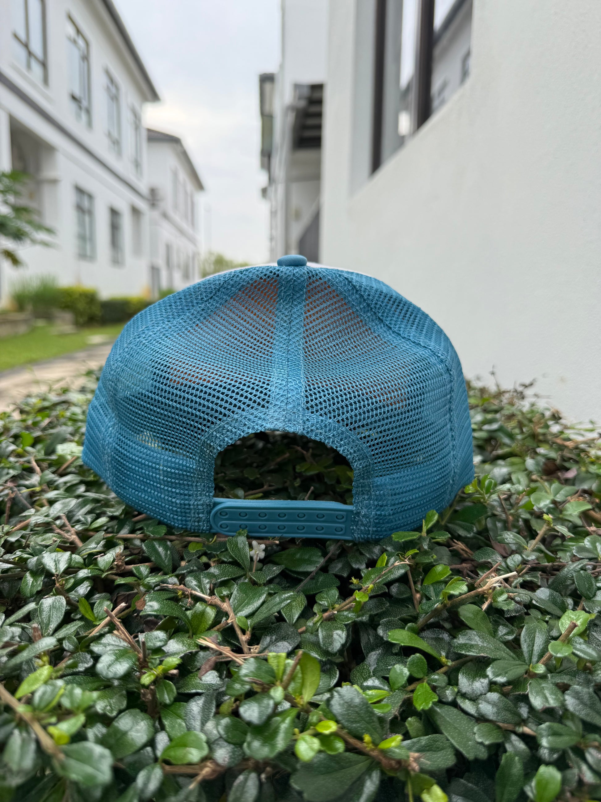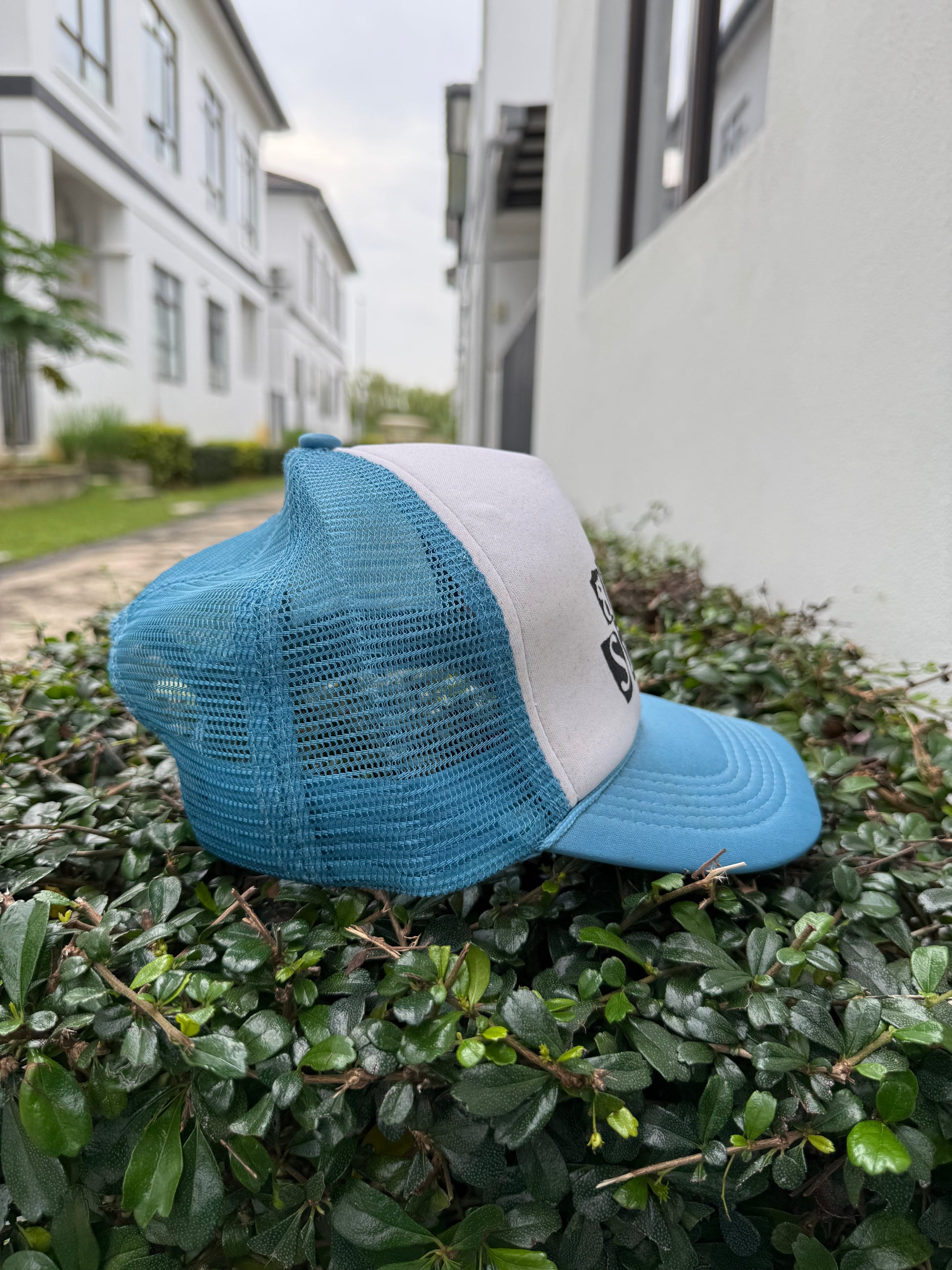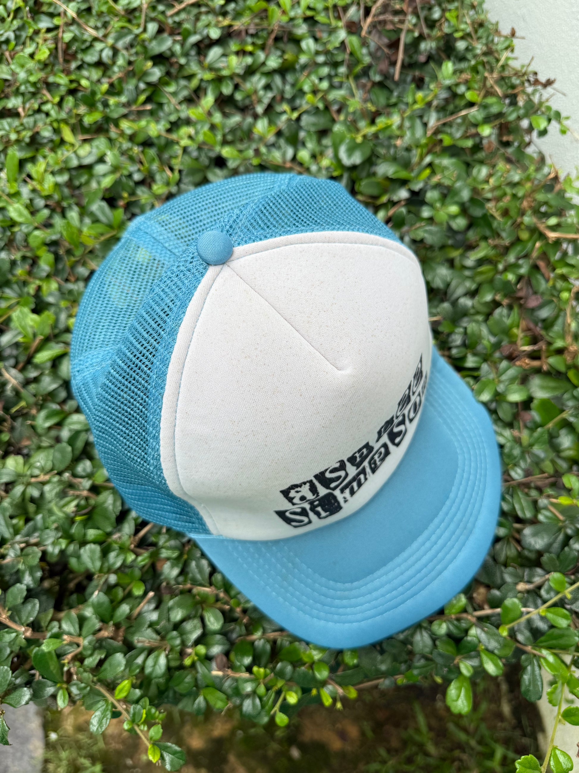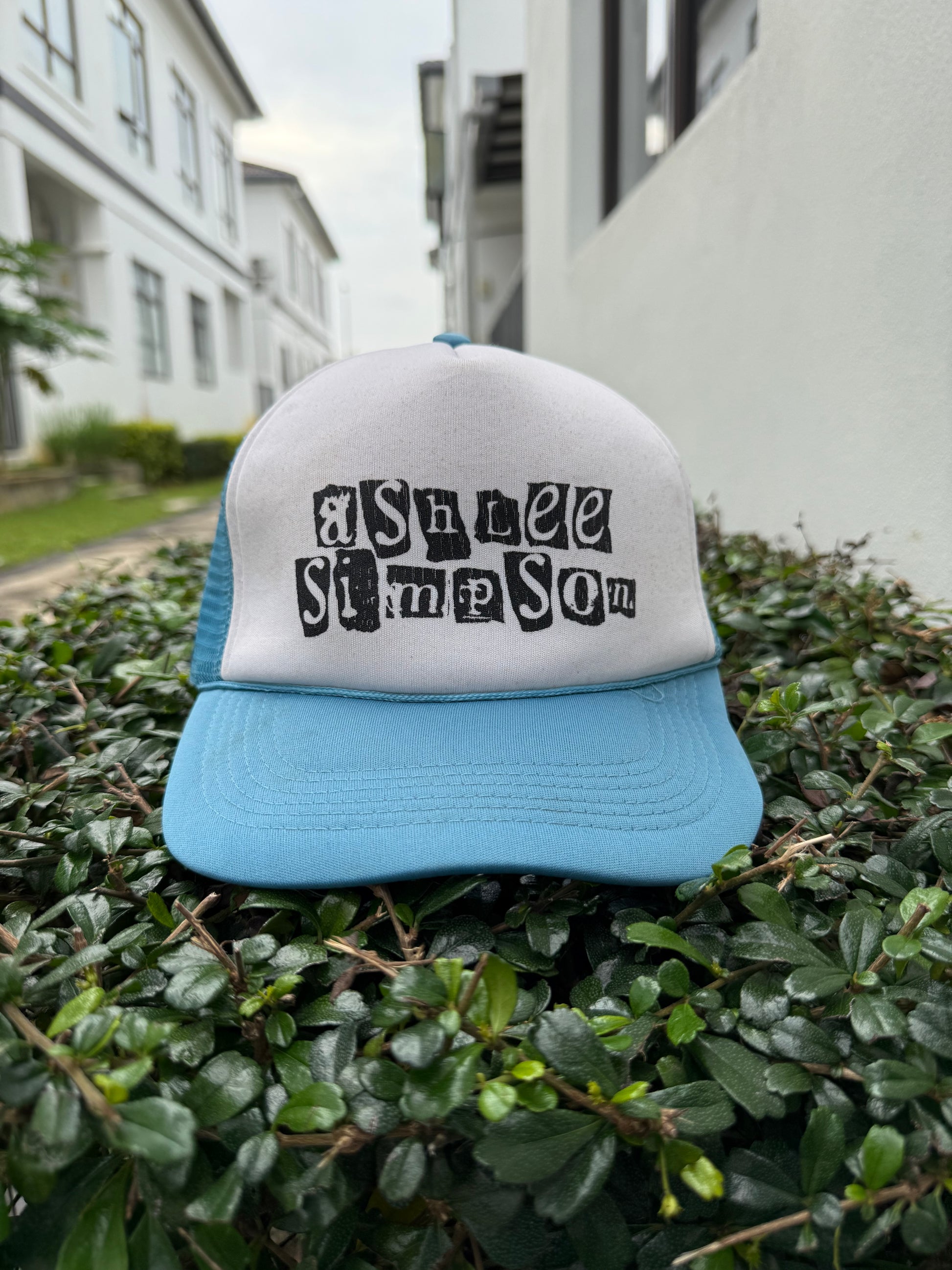 Vintage style Ashlee Simpson trucker cap, early 2000s pop-punk aesthetic. White front panel with ransom-note style stencil logo print, paired with aqua blue brim and mesh back. Adjustable snapback closure. Classic throwback to the 2004–2006 pop-punk / emo-pop boom.