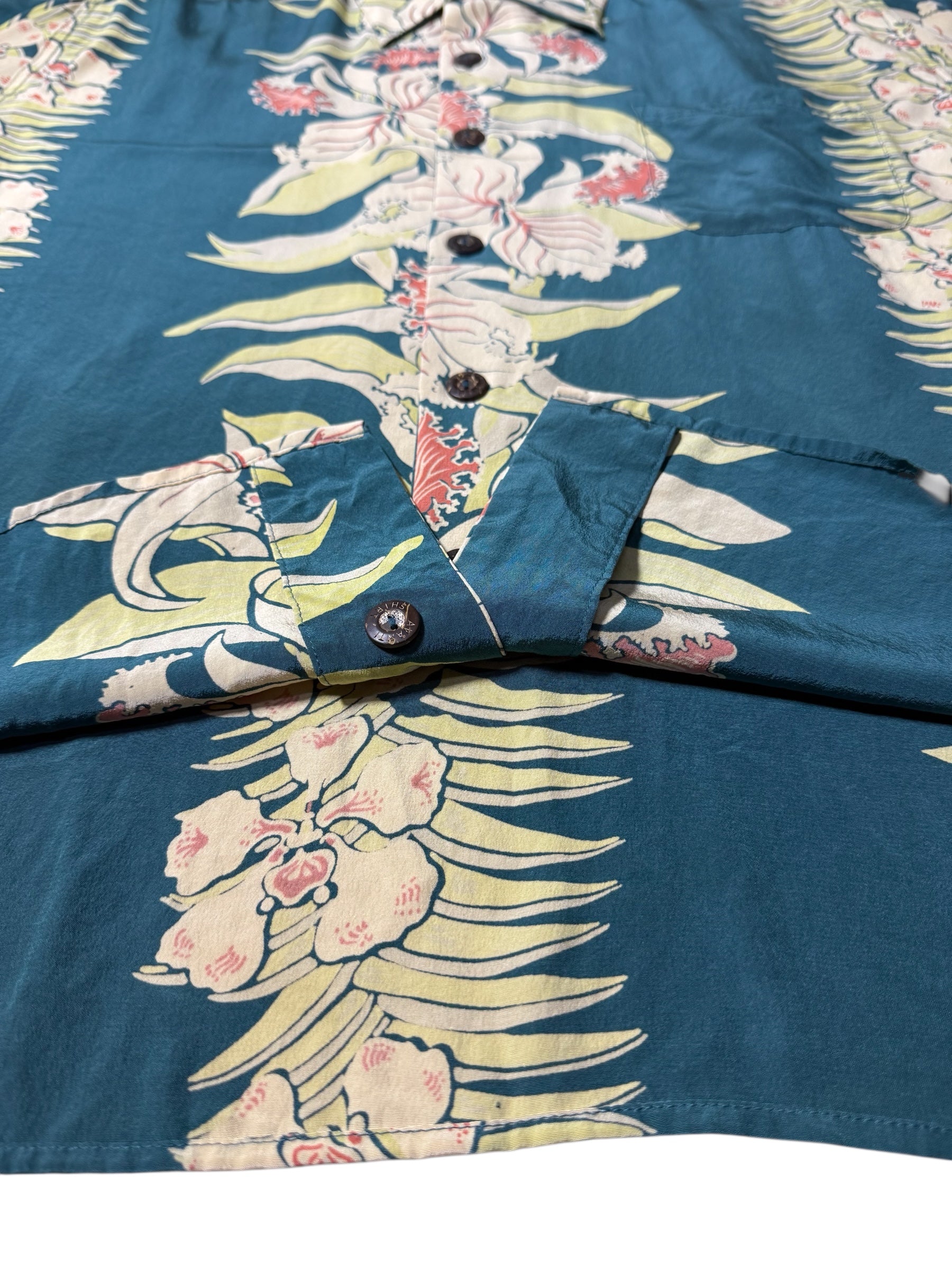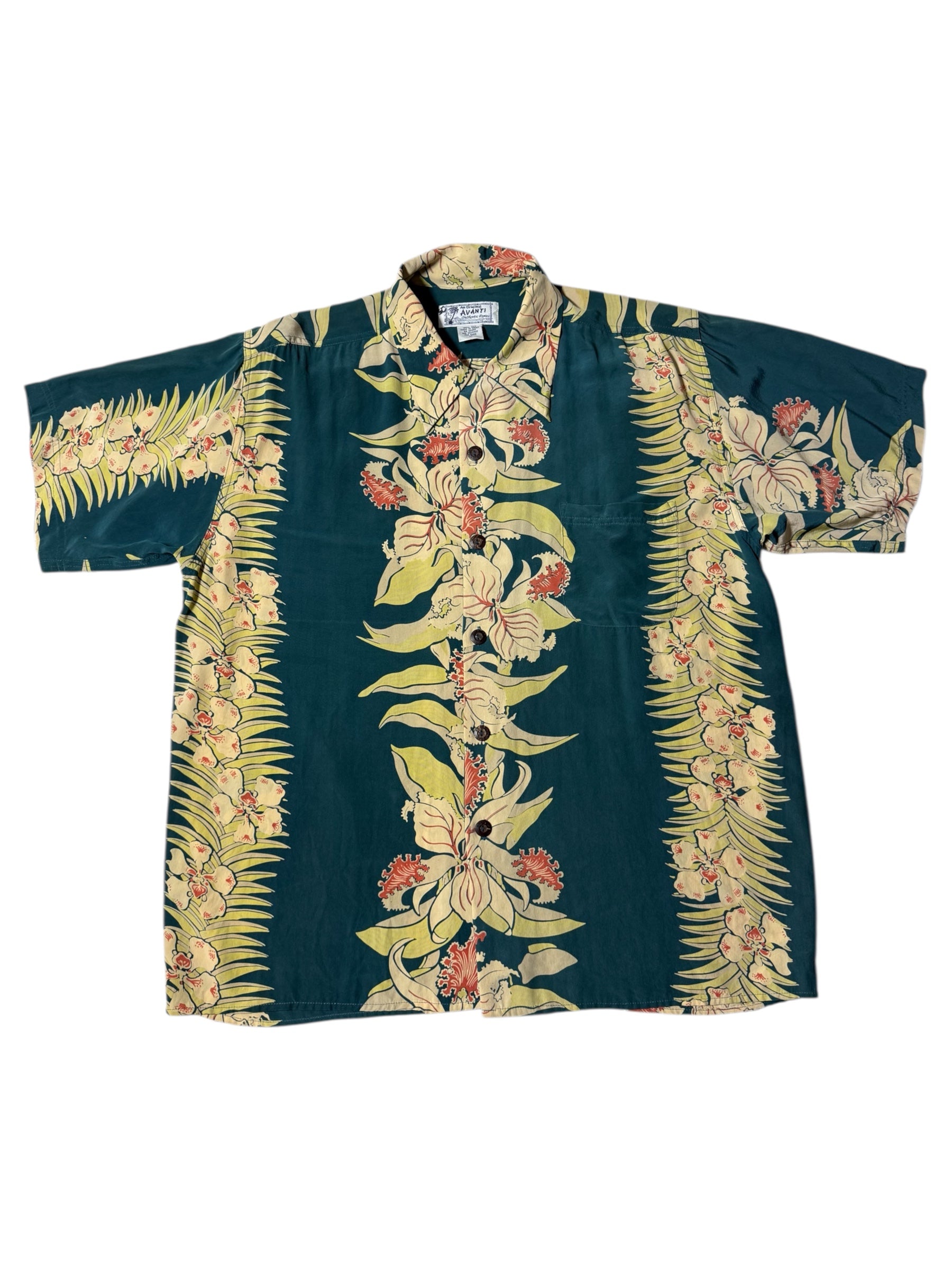 Avanti Silk Hawaiian Aloha Shirt Orchid Botanical Panel Print Teal Green