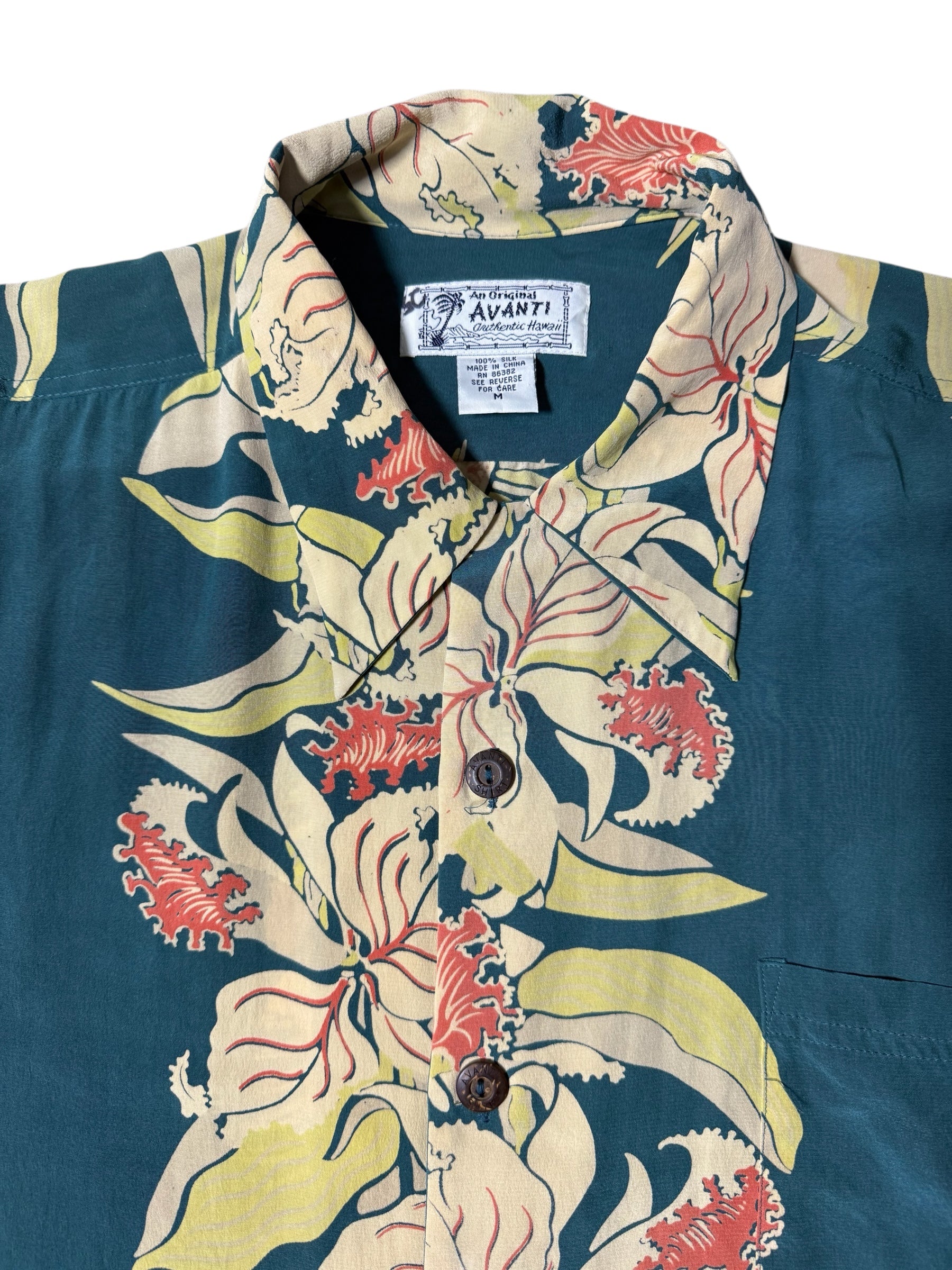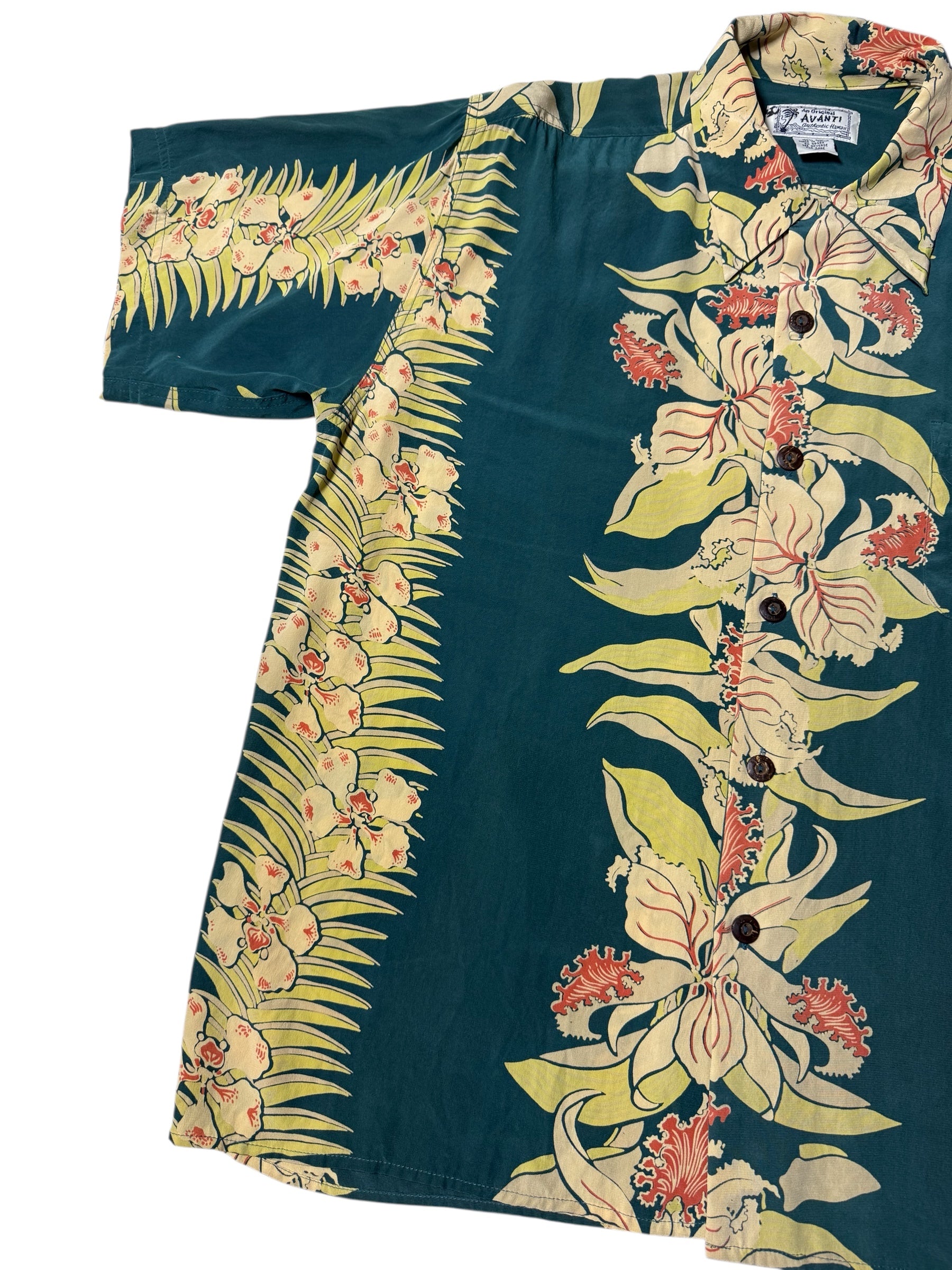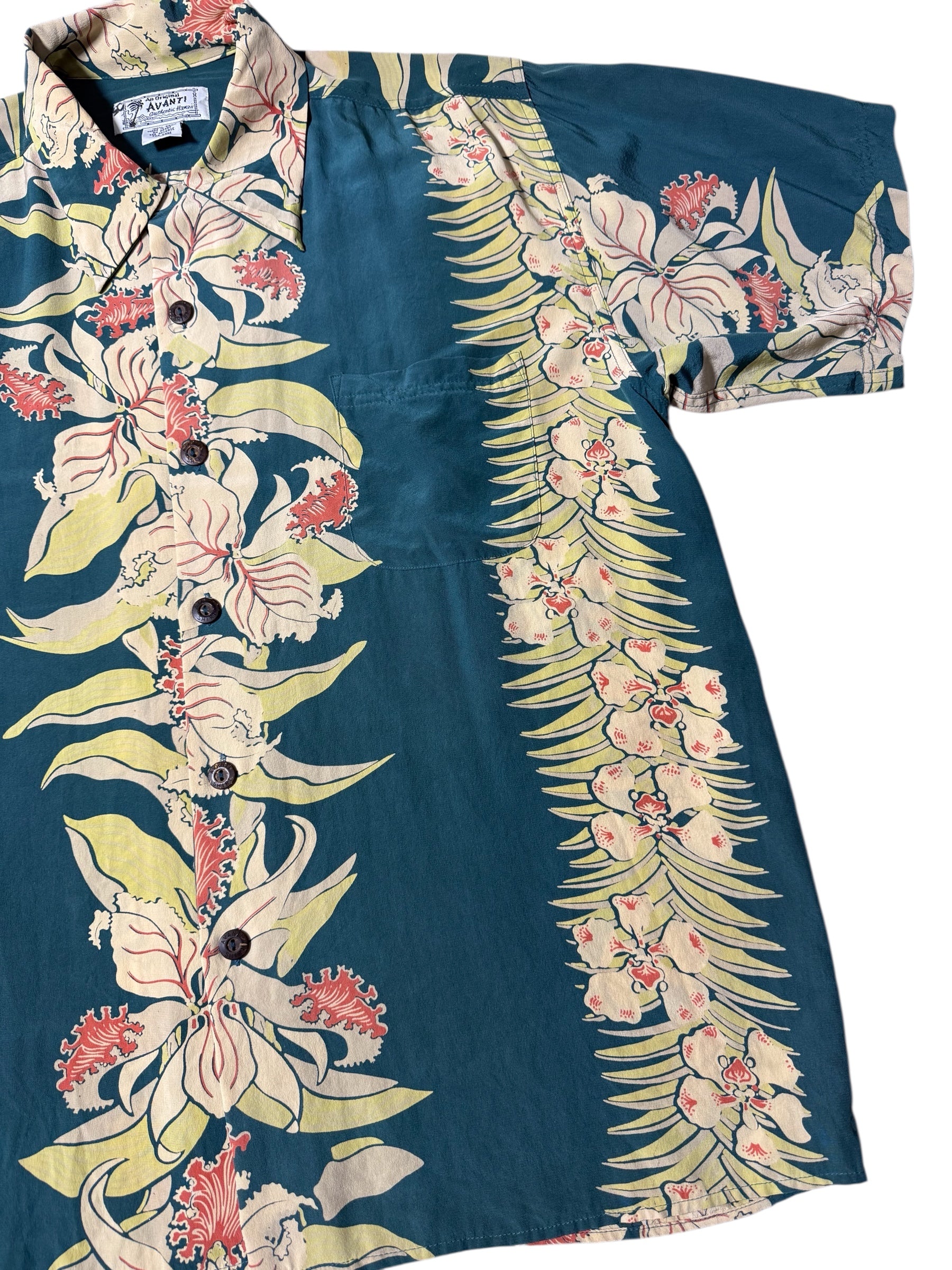 Avanti 100% silk Aloha shirt featuring a bold orchid botanical artwork arranged in vertical panel prints along the front and back. Deep teal-green base with cream, yellow, and red floral detailing. Lightweight, soft drape, and that classic silky Avanti feel.