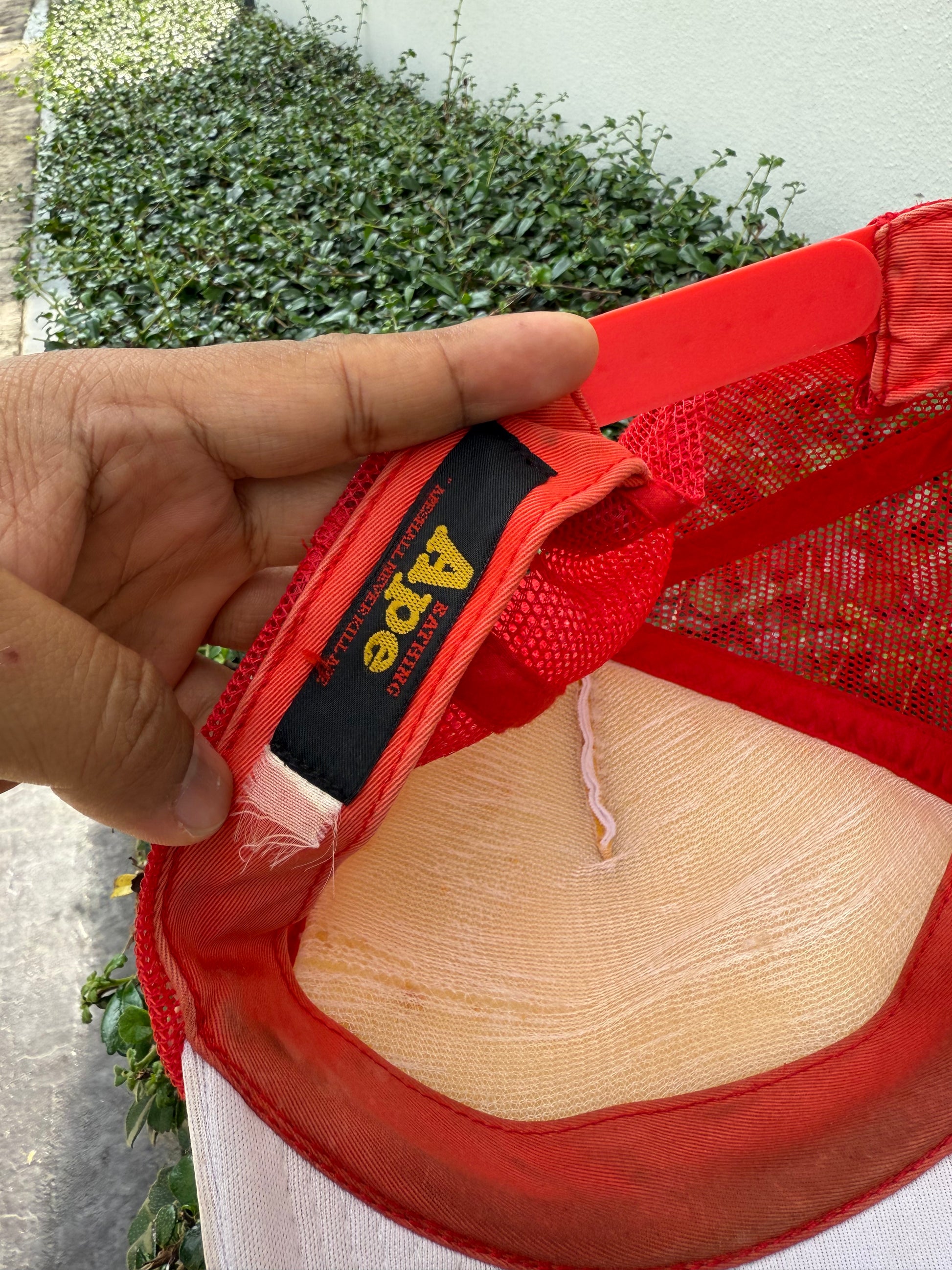 Rare collaboration piece between A Bathing Ape (BAPE) and KAWS, released in the early 2000s. Features the classic Ape Head logo reinterpreted with KAWS’ signature “X” eyes, screen-printed in bold red across a white front panel. Breathable red mesh back with adjustable snapback closure and curved brim construction. Interior label reads “Ape Shall Never Kill Ape.”
