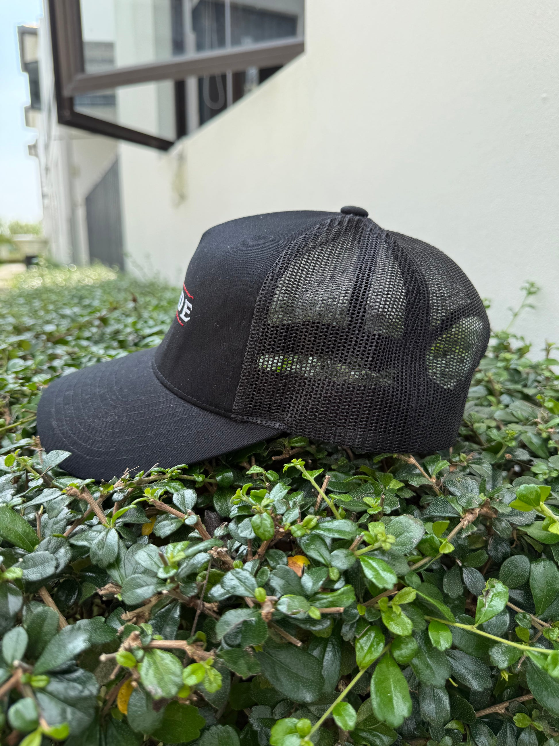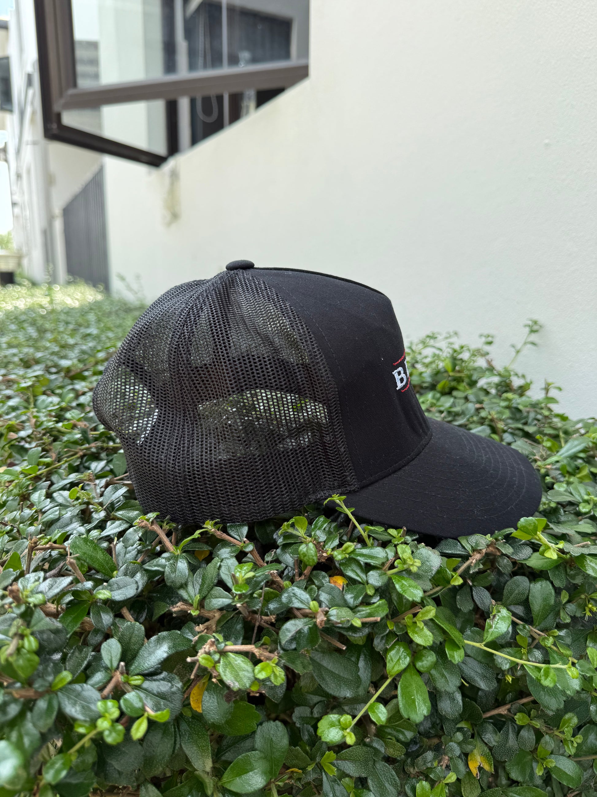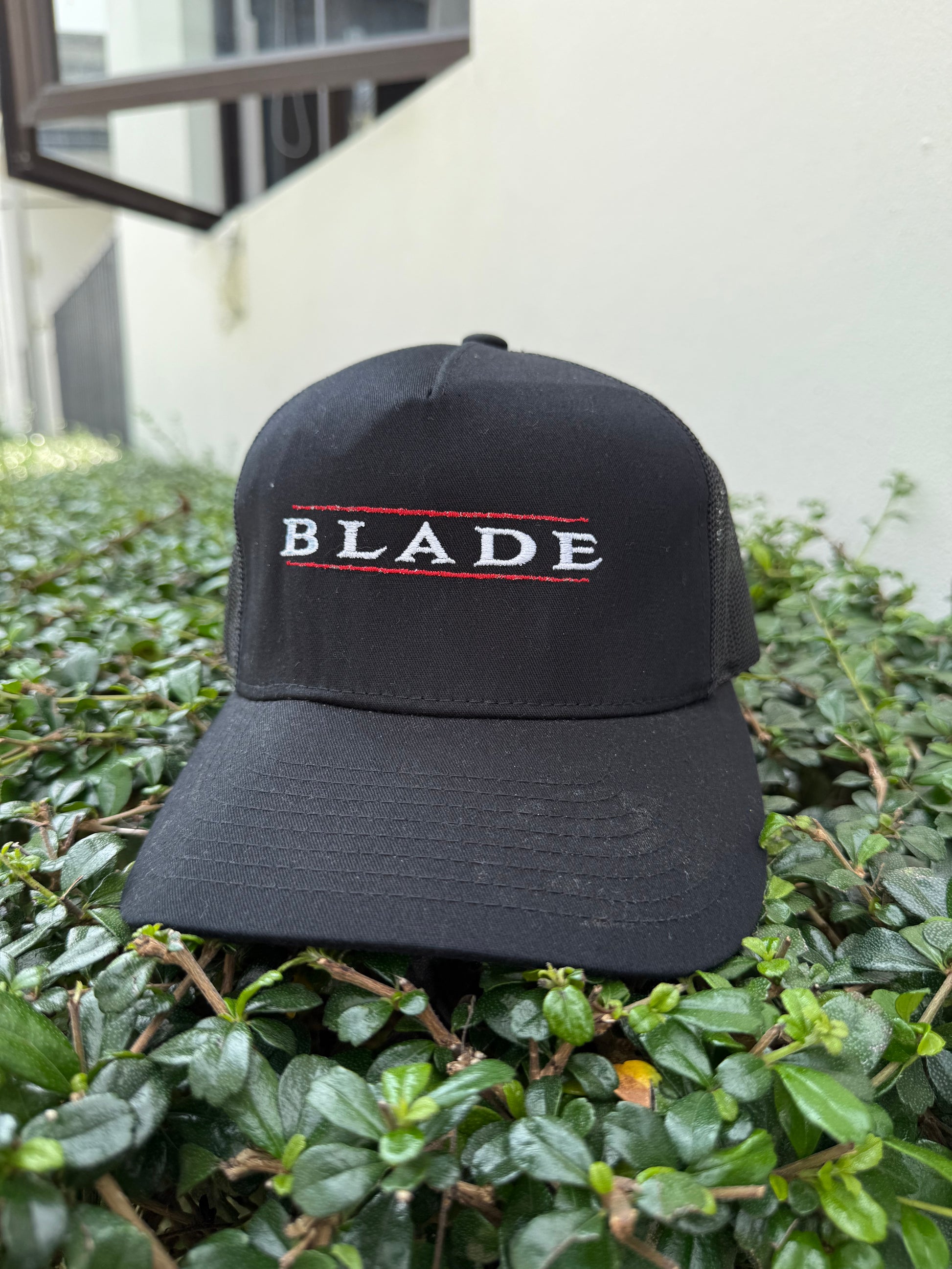 Original trucker cap from the 1998 Marvel movie Blade, starring Wesley Snipes. Features bold embroidered “BLADE” logo in white with red underline across the front panel. Classic 5-panel mesh trucker construction with black brim, mesh back, and adjustable snapback closure.