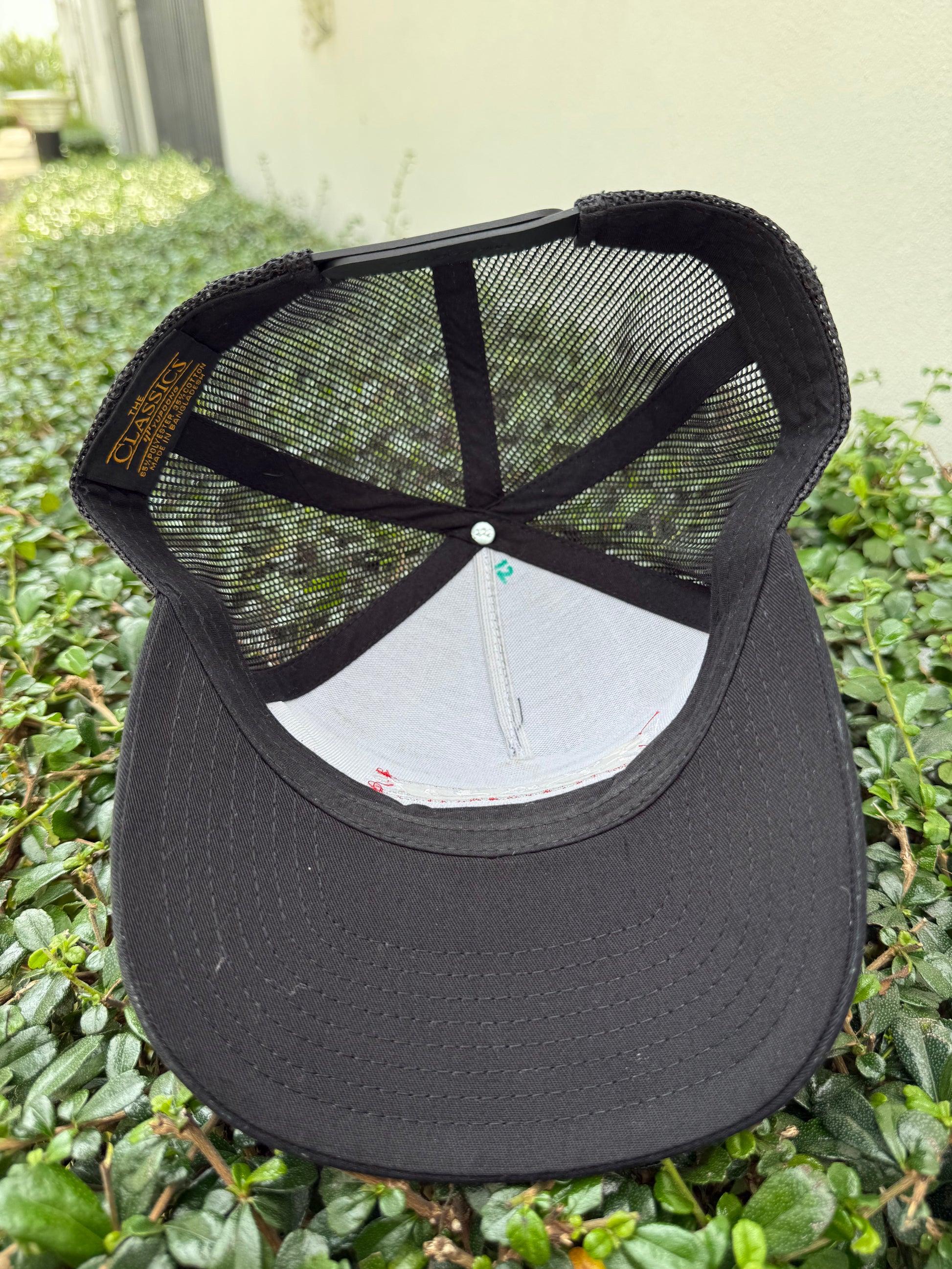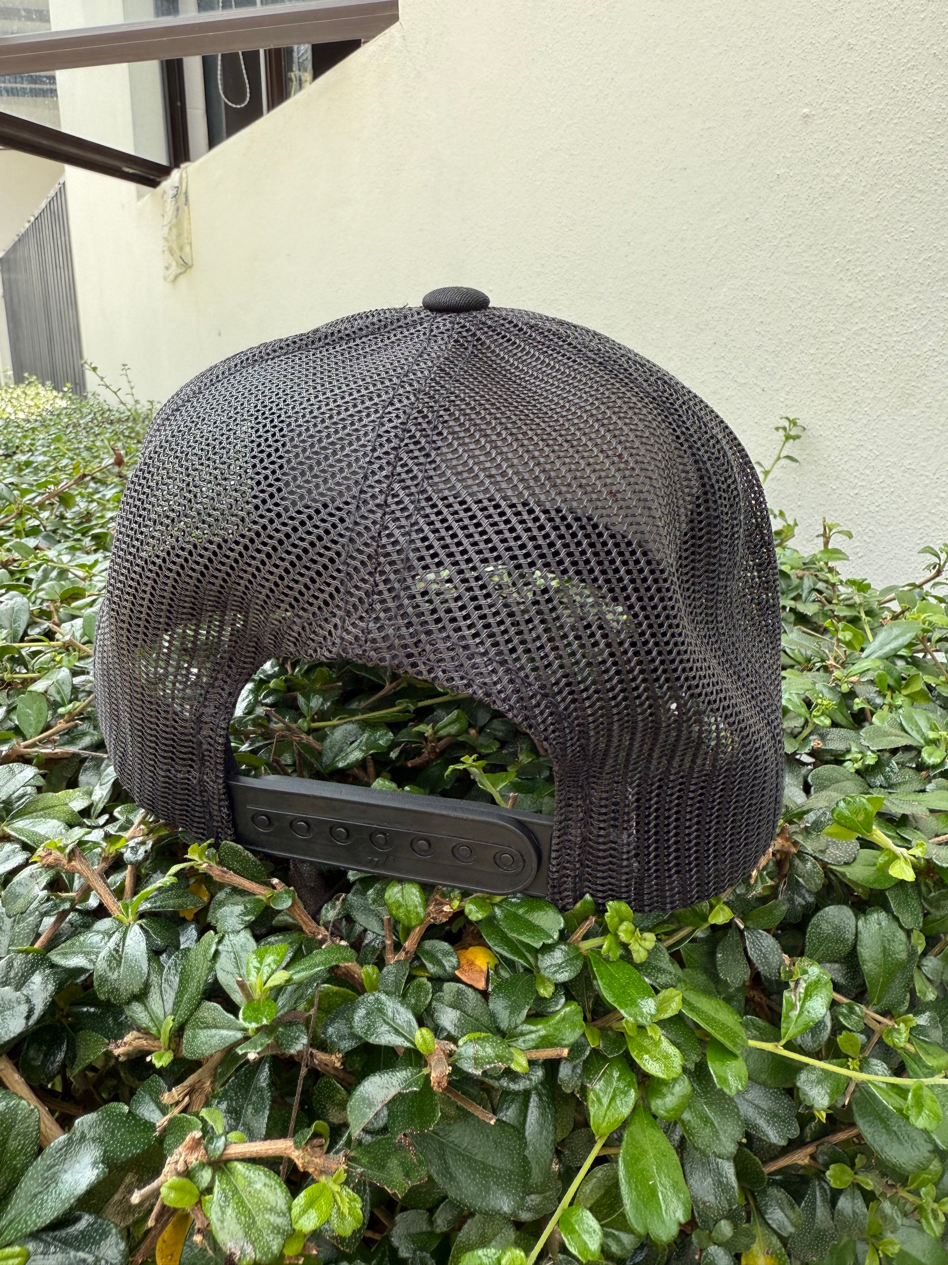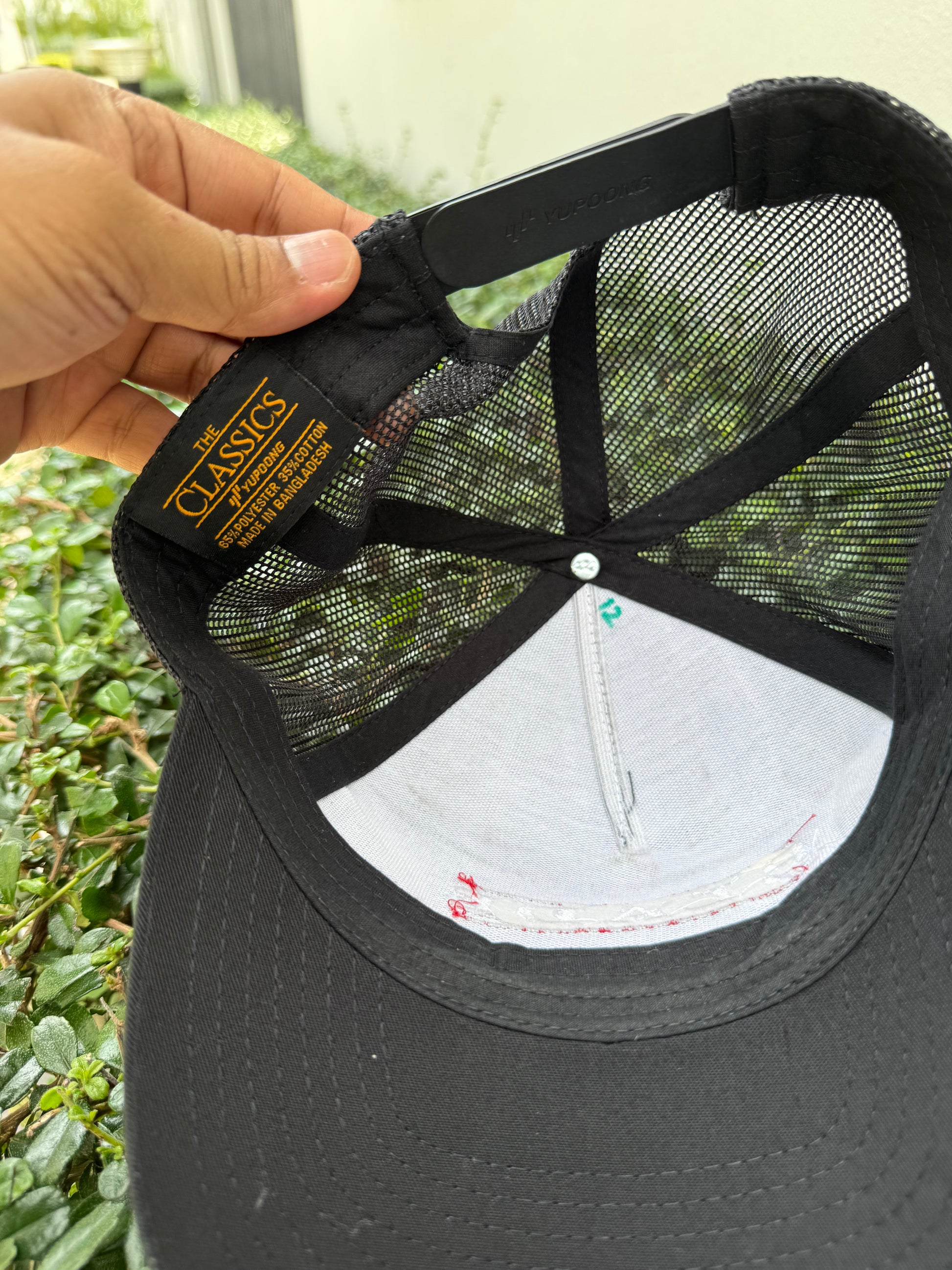 Original trucker cap from the 1998 Marvel movie Blade, starring Wesley Snipes. Features bold embroidered “BLADE” logo in white with red underline across the front panel. Classic 5-panel mesh trucker construction with black brim, mesh back, and adjustable snapback closure.