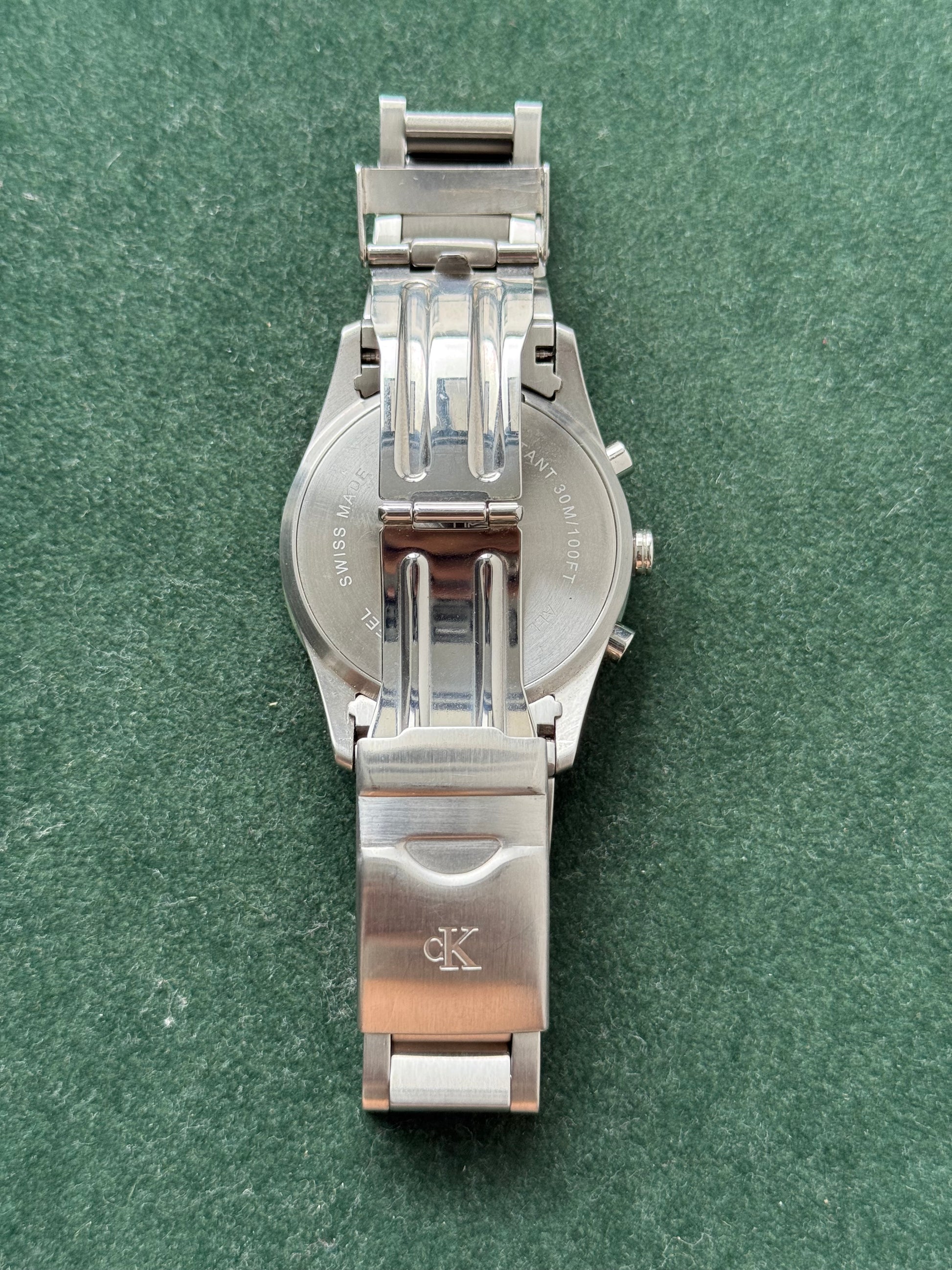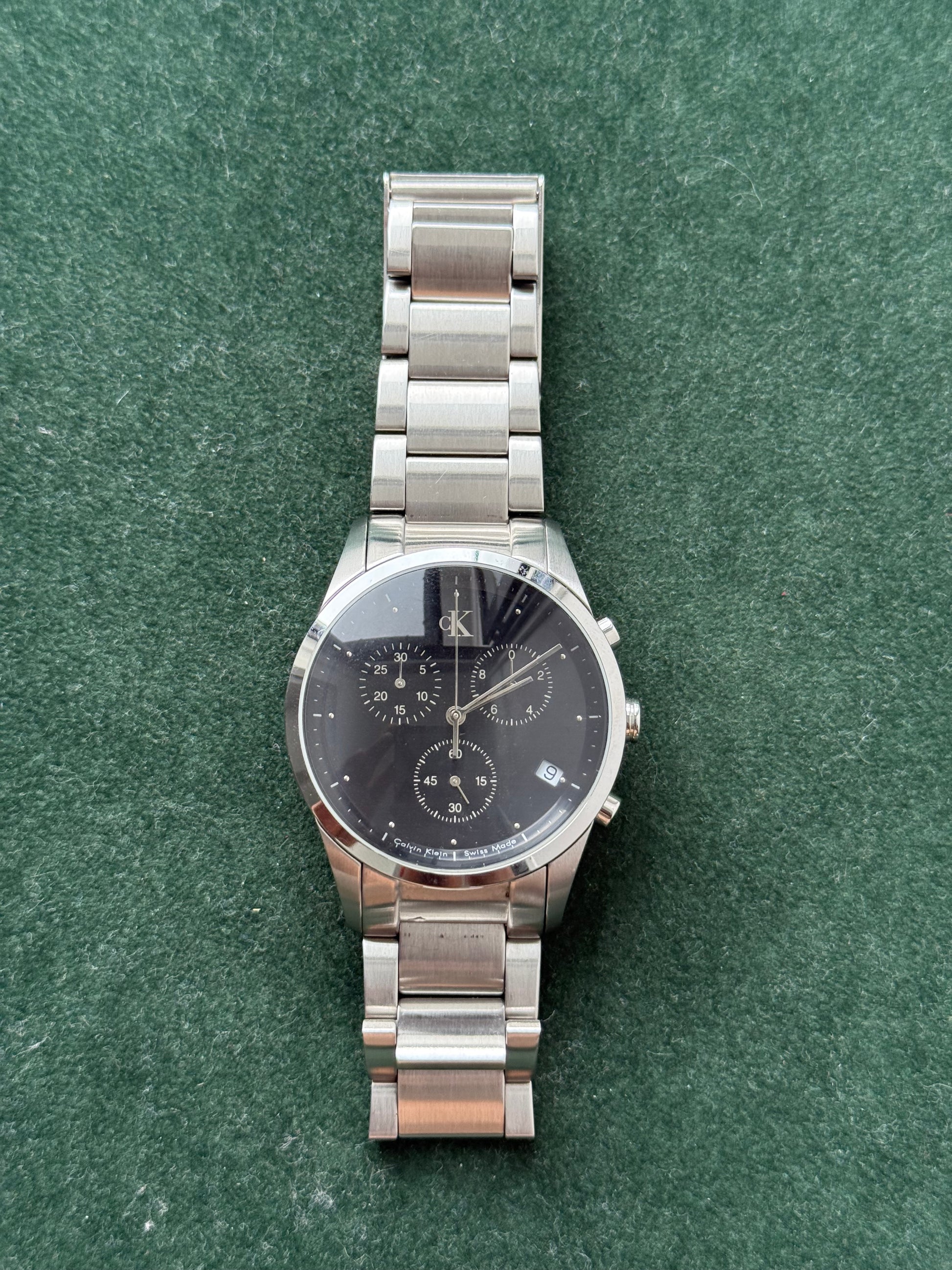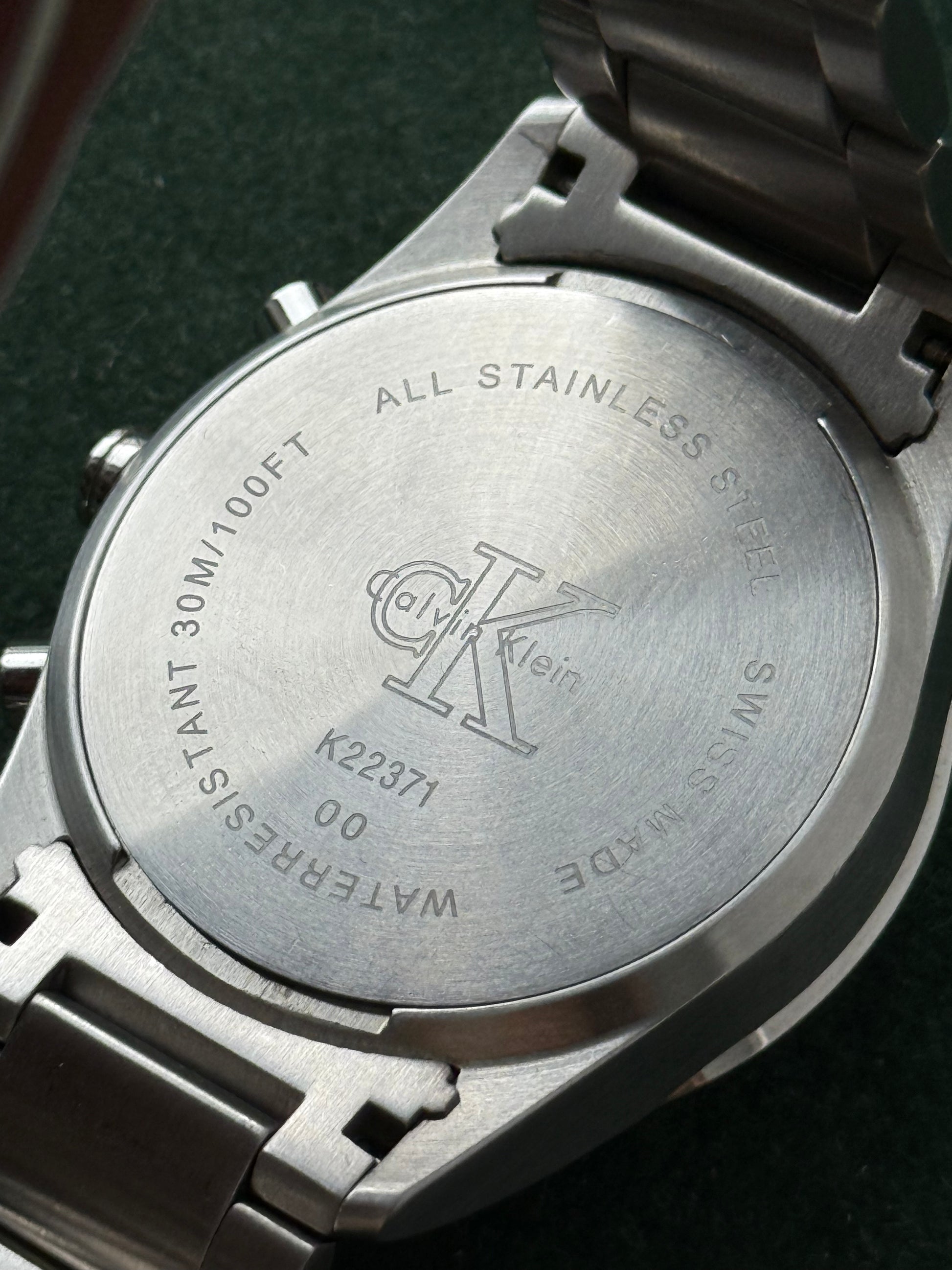 Authentic Calvin Klein K22371 Swiss Made Chronograph men’s watch featuring a black dial with three sub-dials and a date window at 4 o’clock.