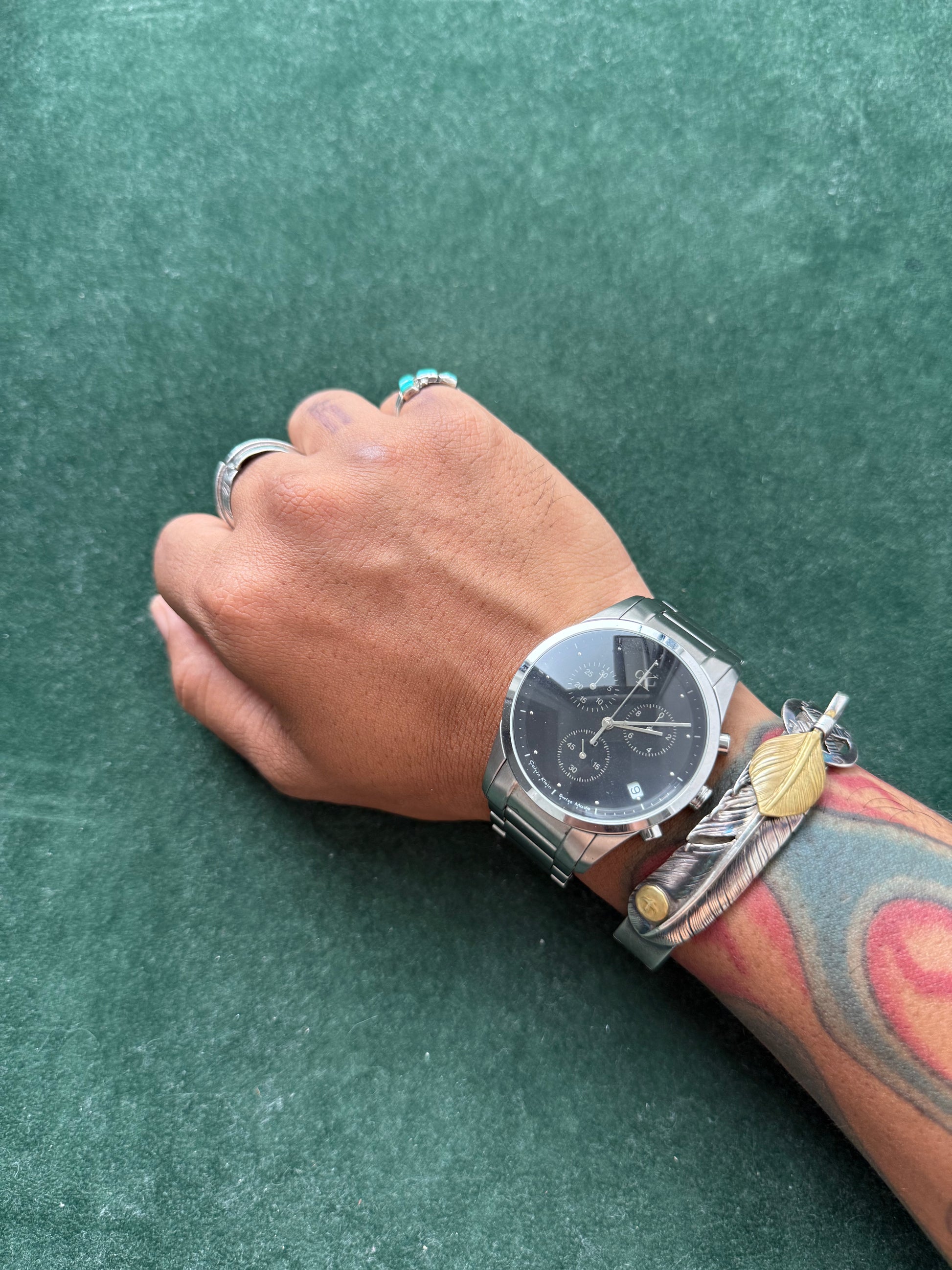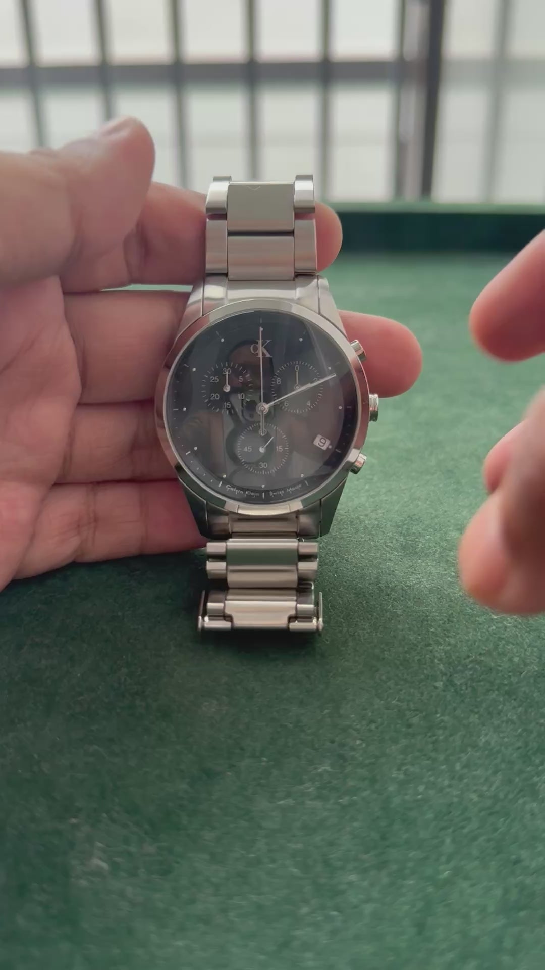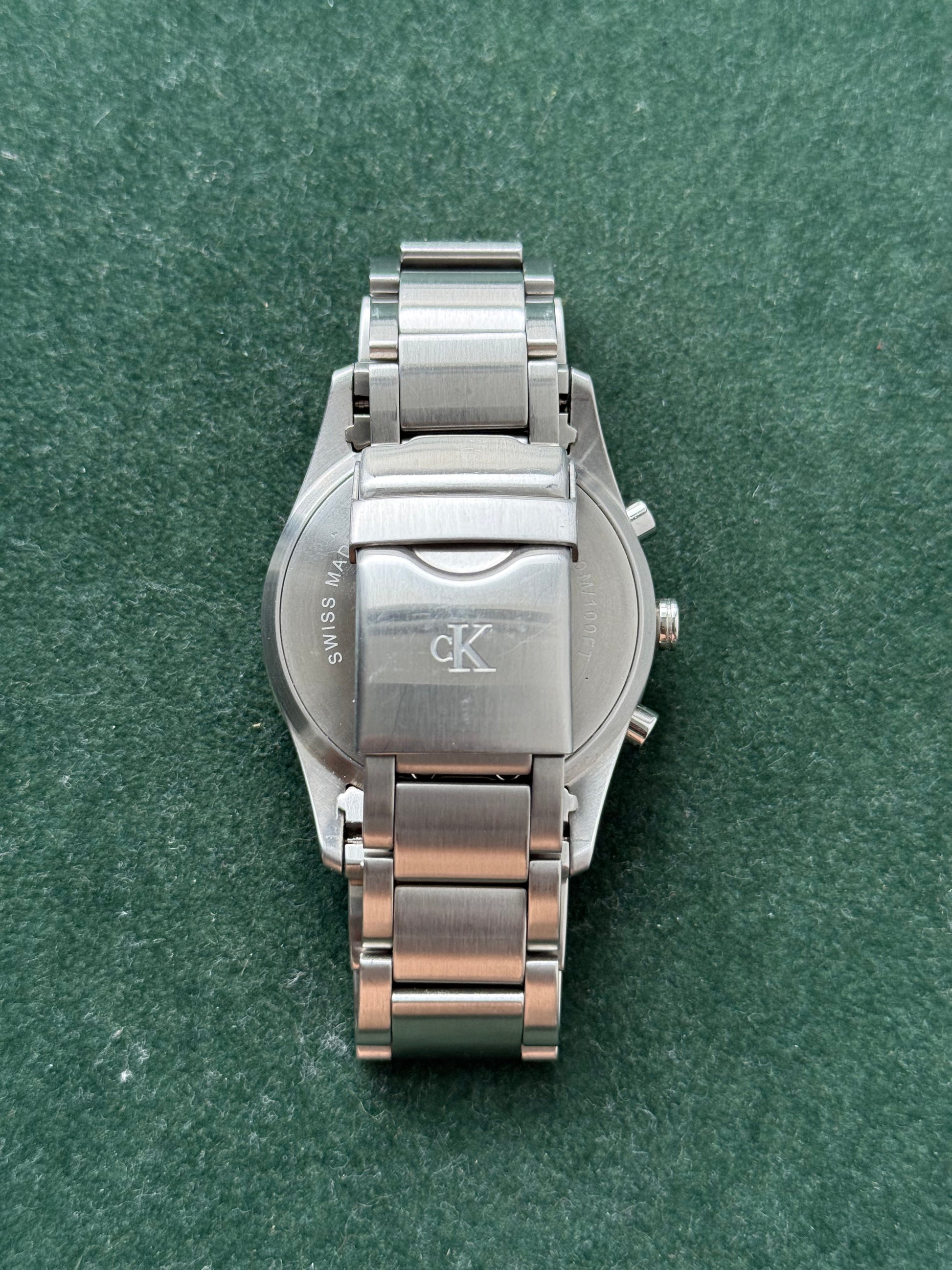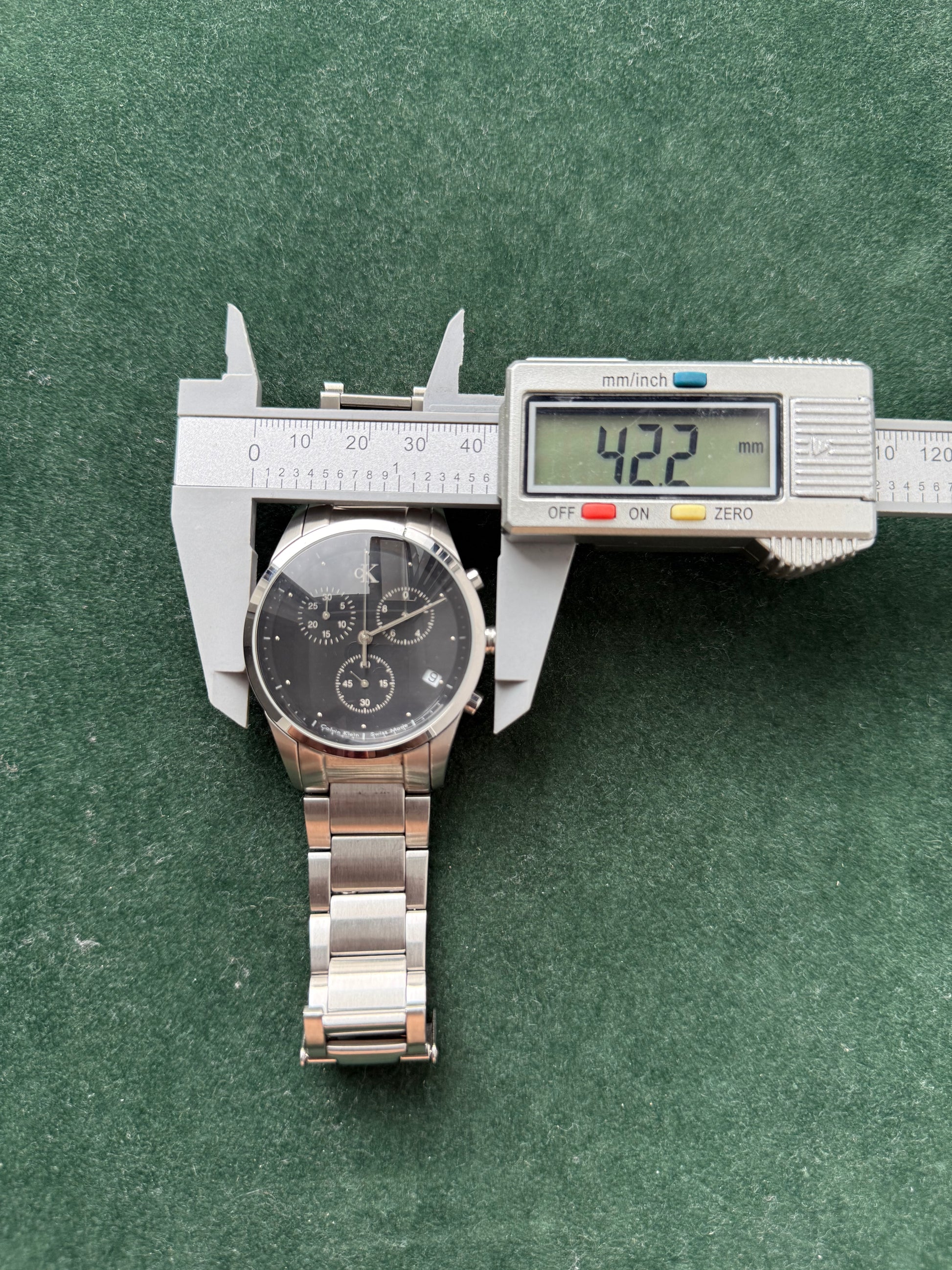 Authentic Calvin Klein K22371 Swiss Made Chronograph men’s watch featuring a black dial with three sub-dials and a date window at 4 o’clock.