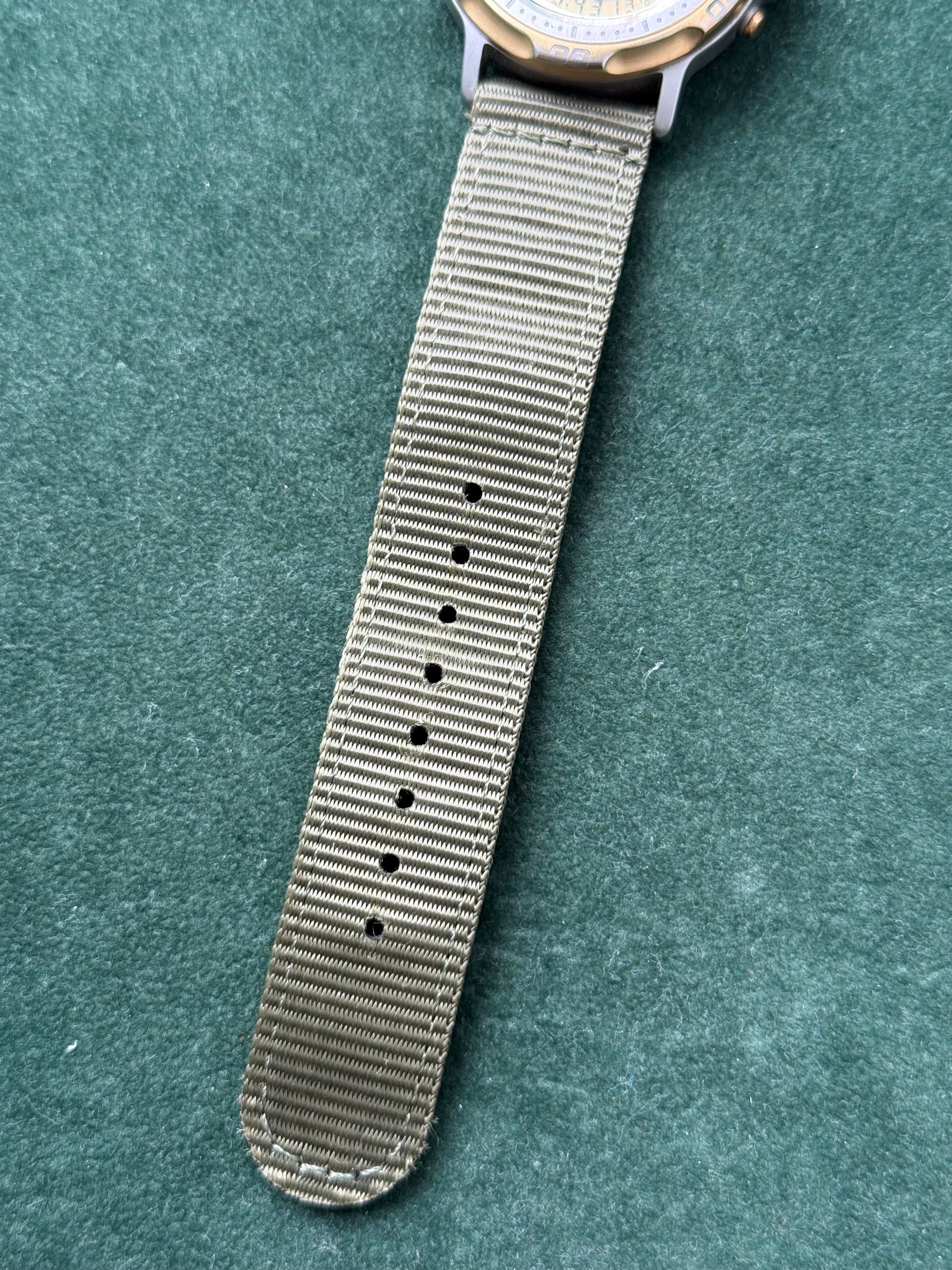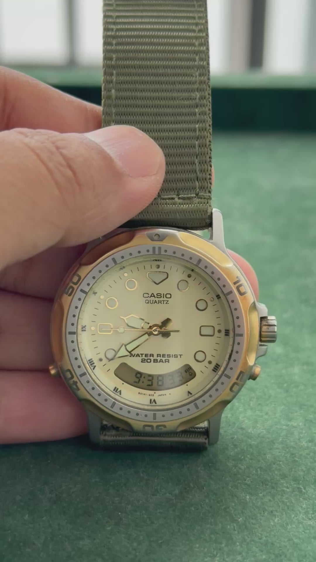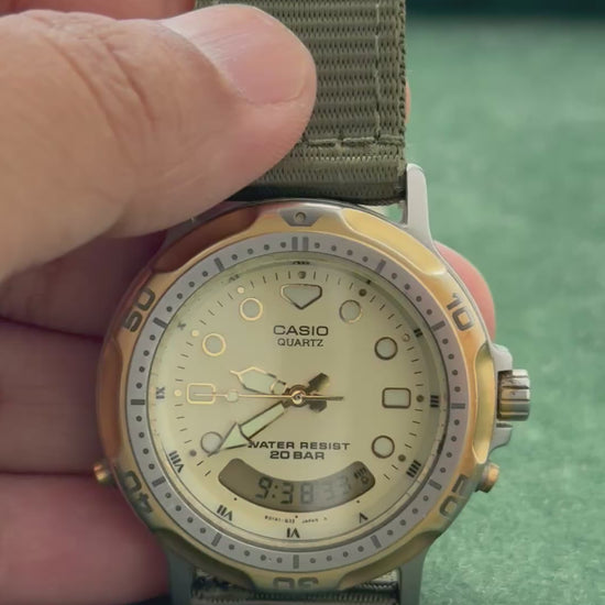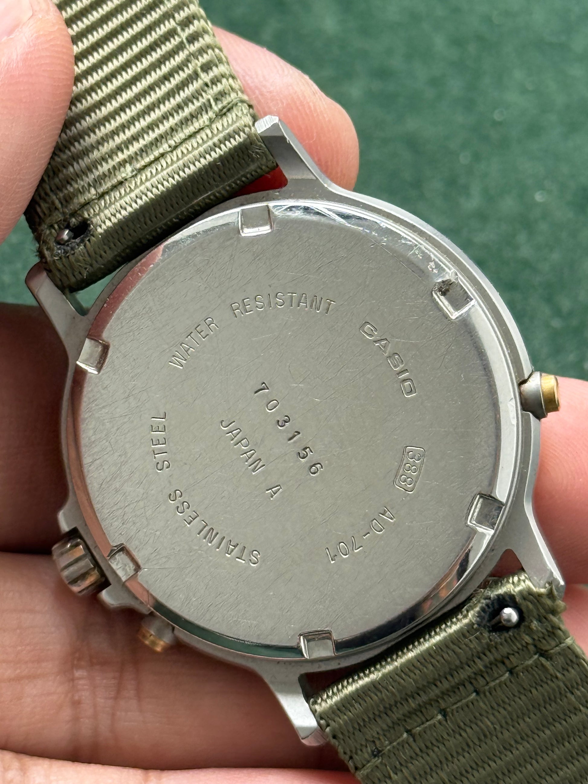 Vintage Casio AD-701 quartz wristwatch, Japan A movement, with classic diver-inspired design. Cream dial with luminous indices, day-date window, and unidirectional rotating bezel. Stainless steel caseback signed “Casio AD-701, Japan A.” Comes with durable green NATO strap, giving it a rugged military/outdoor look. Large 41.8mm case size, water resistant 10 BAR. A rare and collectible early Casio diver-style quartz watch from the late 1980s–1990s era.