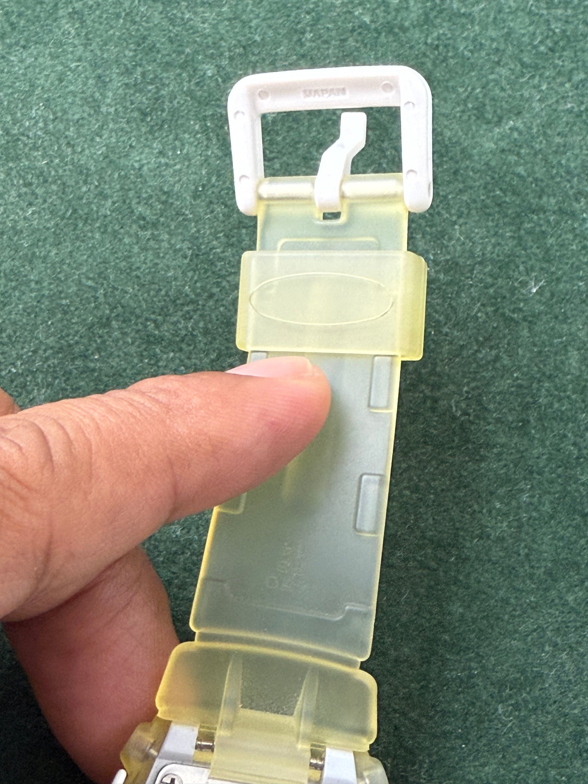 - Condition: Pre-owned, working condition, strap shows aging and yellowing consistent with vintage resin