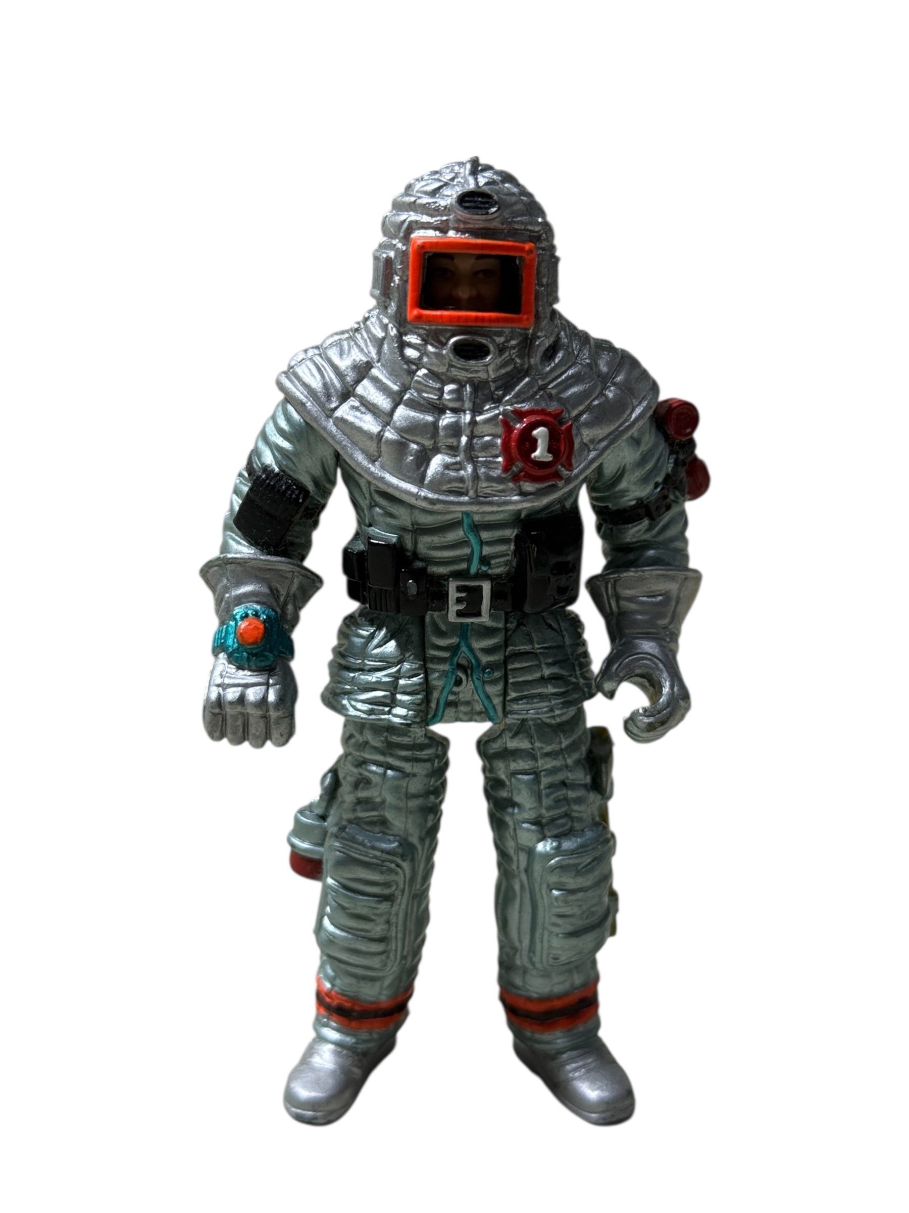 Original Chap Mei Fire Rescue / Hazmat action figure from the early 2000s. Features a metallic silver protective suit with removable helmet and molded rescue gear. Classic chunky Chap Mei sculpt and bright orange visor.