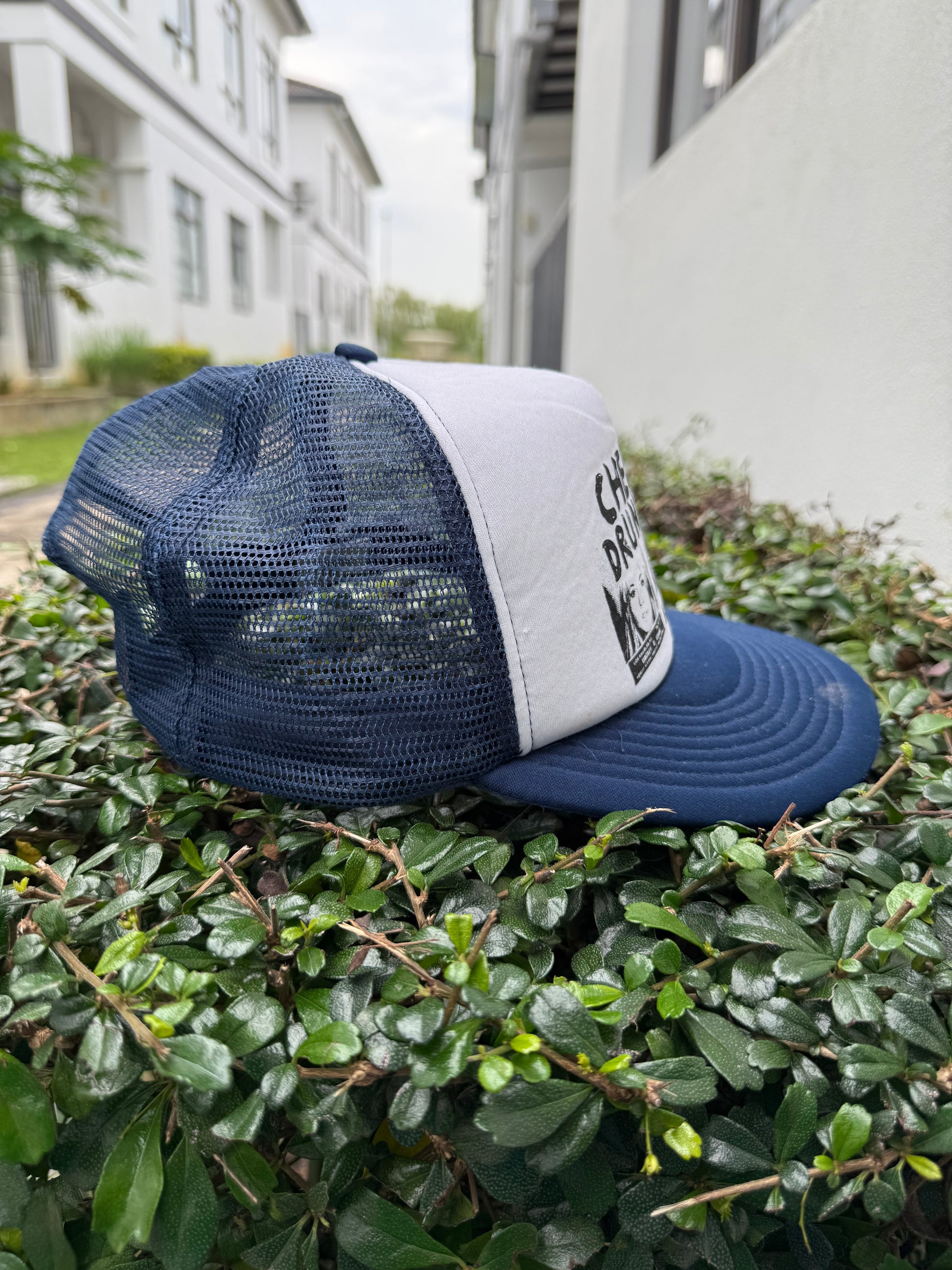 Bold and cheeky vintage-style trucker cap featuring the iconic “Check Out These Drunk Bitches” print with mugshot-style graphics of early 2000s tabloid queens. White foam front panel with black print, paired with navy brim and mesh back. Adjustable snapback closure. A true relic of the 2000s party-girl / paparazzi era.