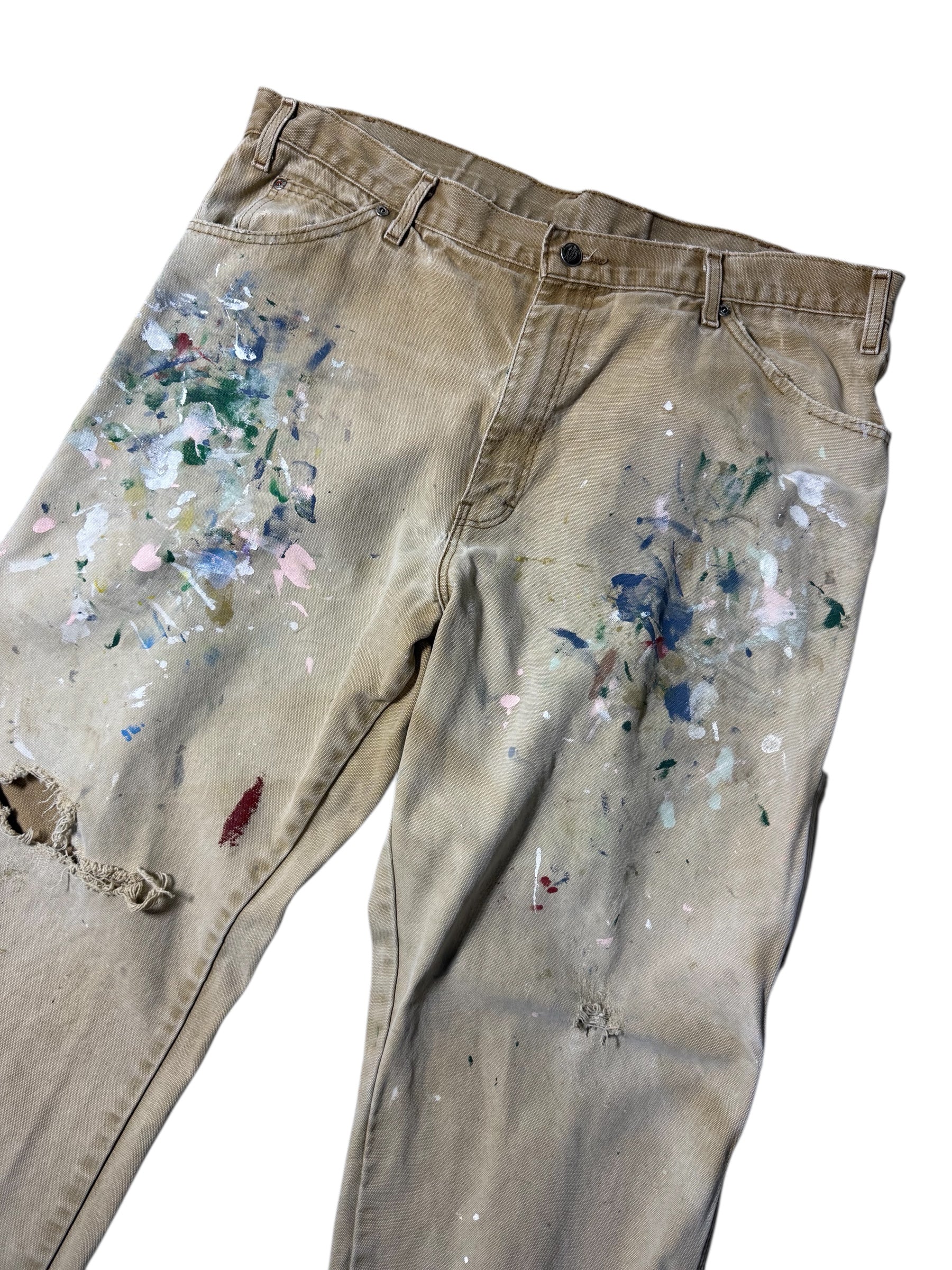 Dickies painter carpenter pants with true workwear character, featuring heavy multicolor paint splatter, natural fading, worn-in patina, and distressed holes. This is the real, honest wear from years of use, perfect for collectors, streetwear styling, archive fits, or rugged Americana looks.