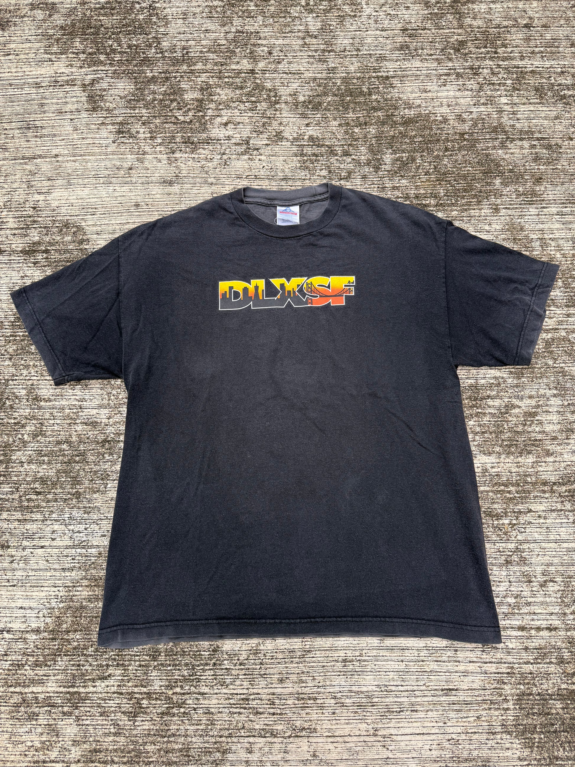 Original DLX SF (Deluxe Distribution, San Francisco) tee featuring city skyline and Golden Gate Bridge print across the chest. Classic heavyweight feel and natural fade. True piece of late 90s/early 2000s skate heritage, part of the golden era alongside Real, Anti Hero & Spitfire Skateboards.