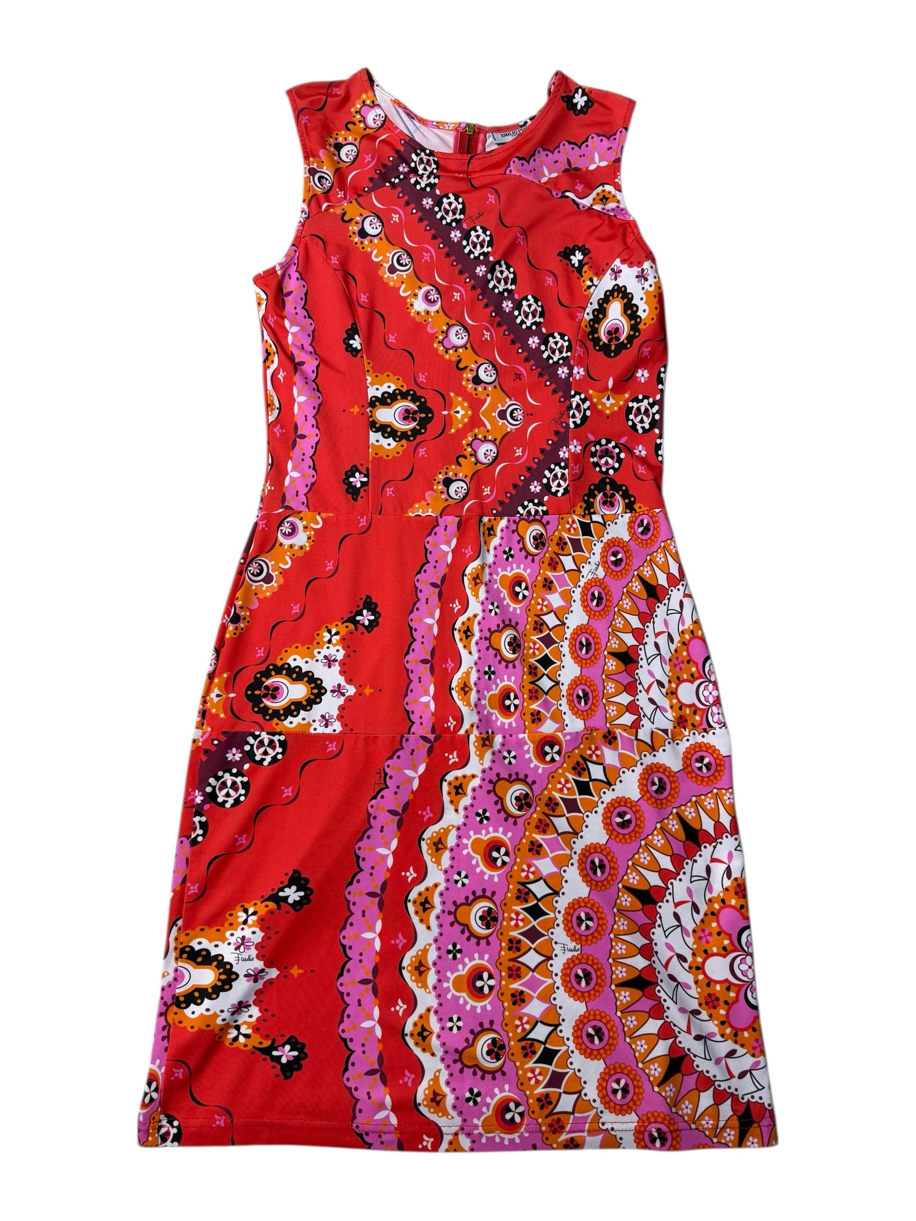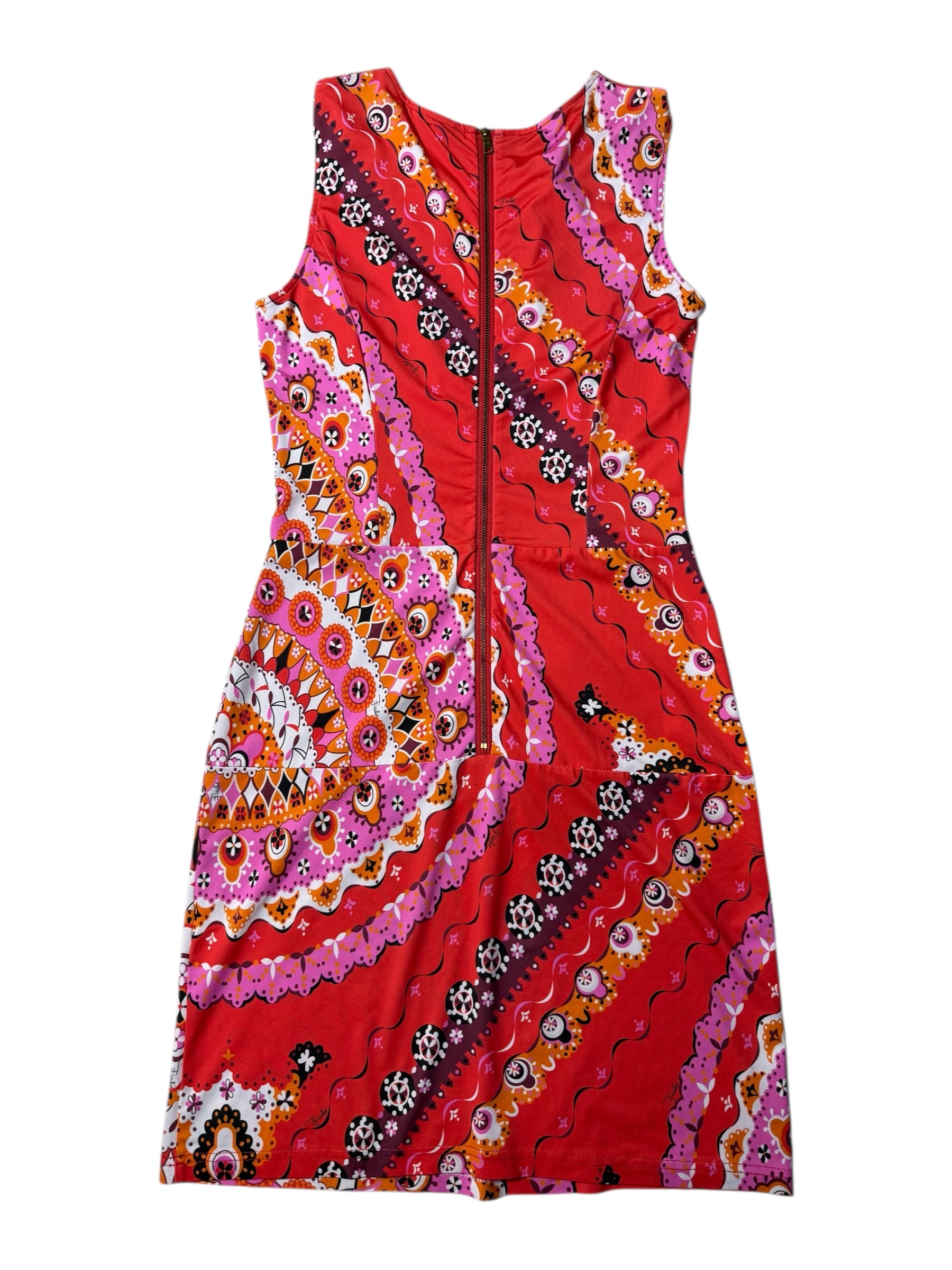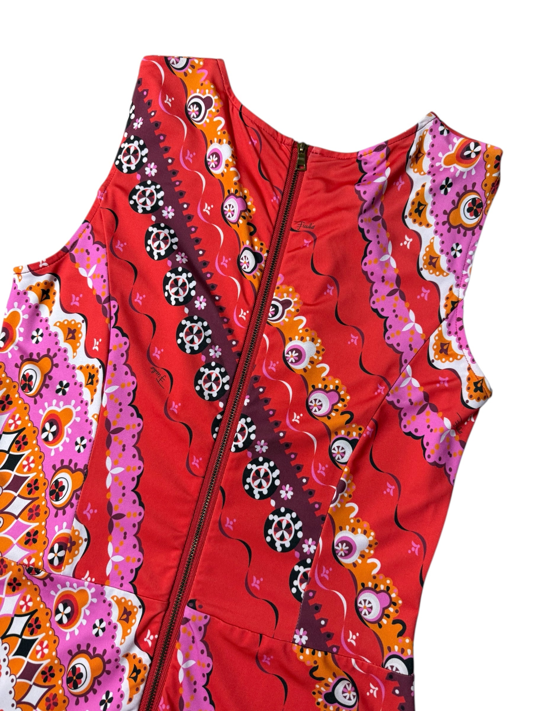 Stunning authentic Emilio Pucci Firenze sleeveless dress featuring the brand’s iconic psychedelic mandala print in vibrant red, pink, orange, black, and white. The dress showcases Pucci’s signature swirling geometry and includes the classic “Emilio” script throughout the pattern.