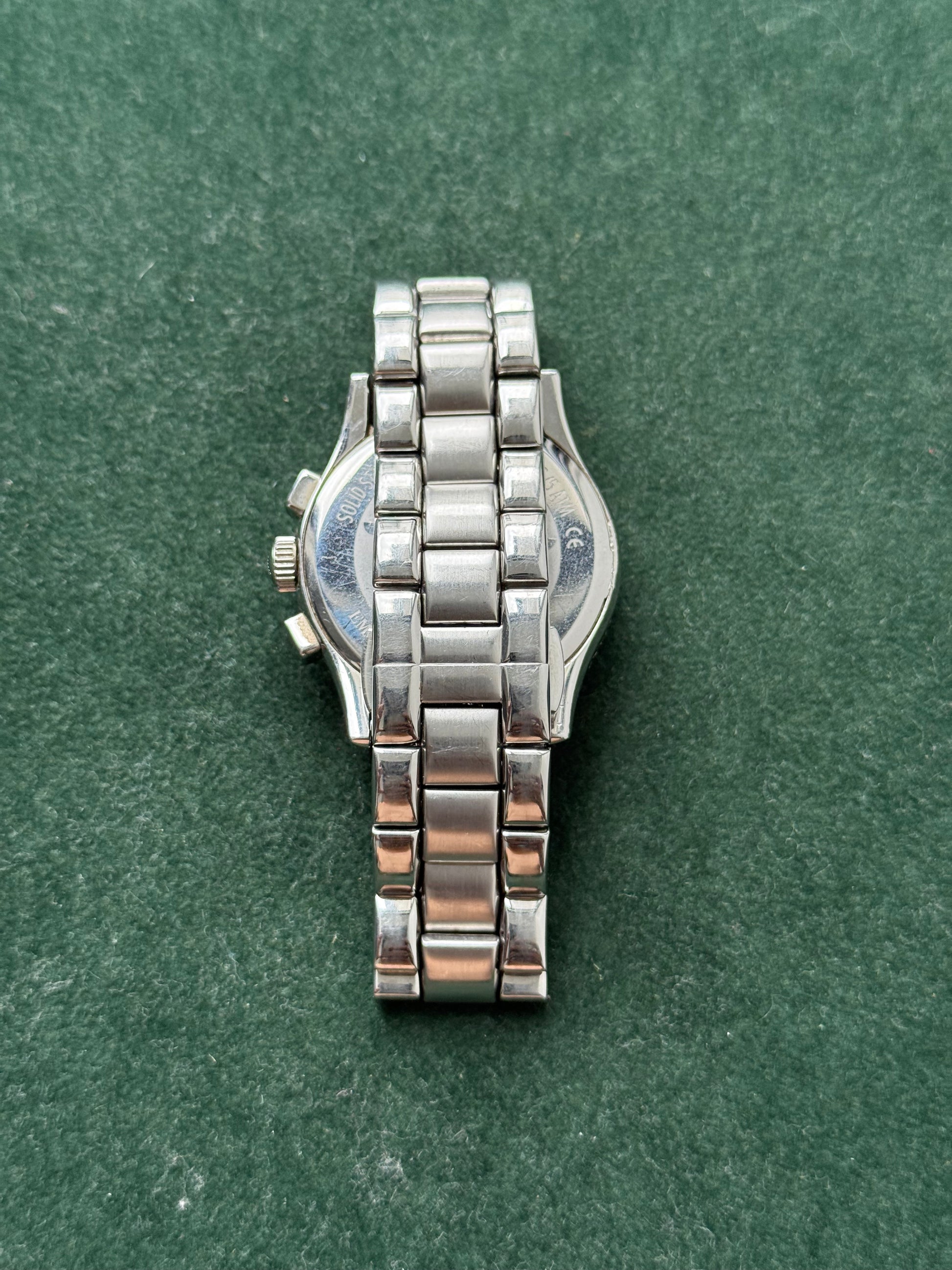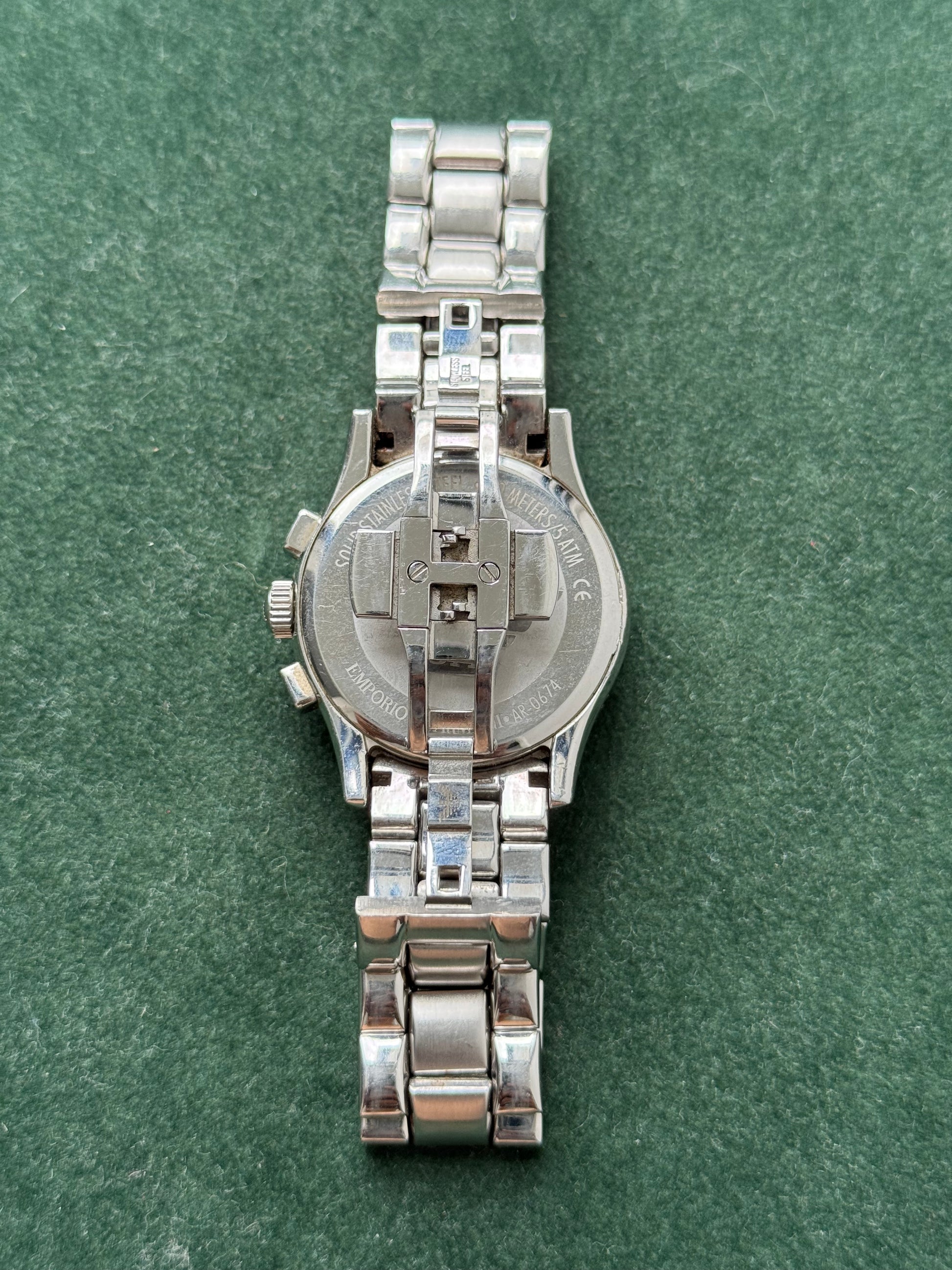 Authentic Emporio Armani AR0674 men’s chronograph watch in stainless steel with a polished bracelet and push-button clasp.
