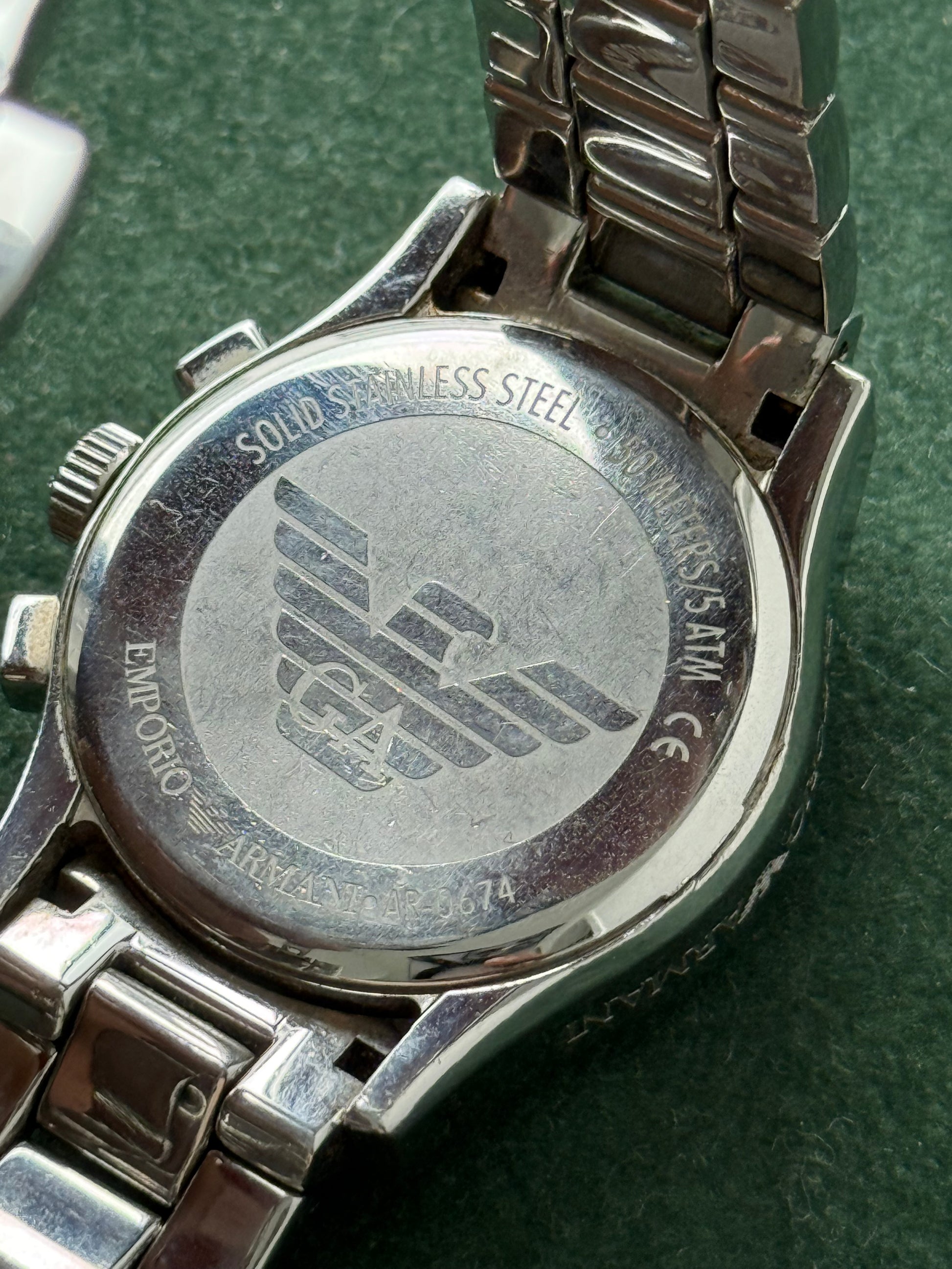 Caseback engraved with the Emporio Armani eagle logo and model reference.