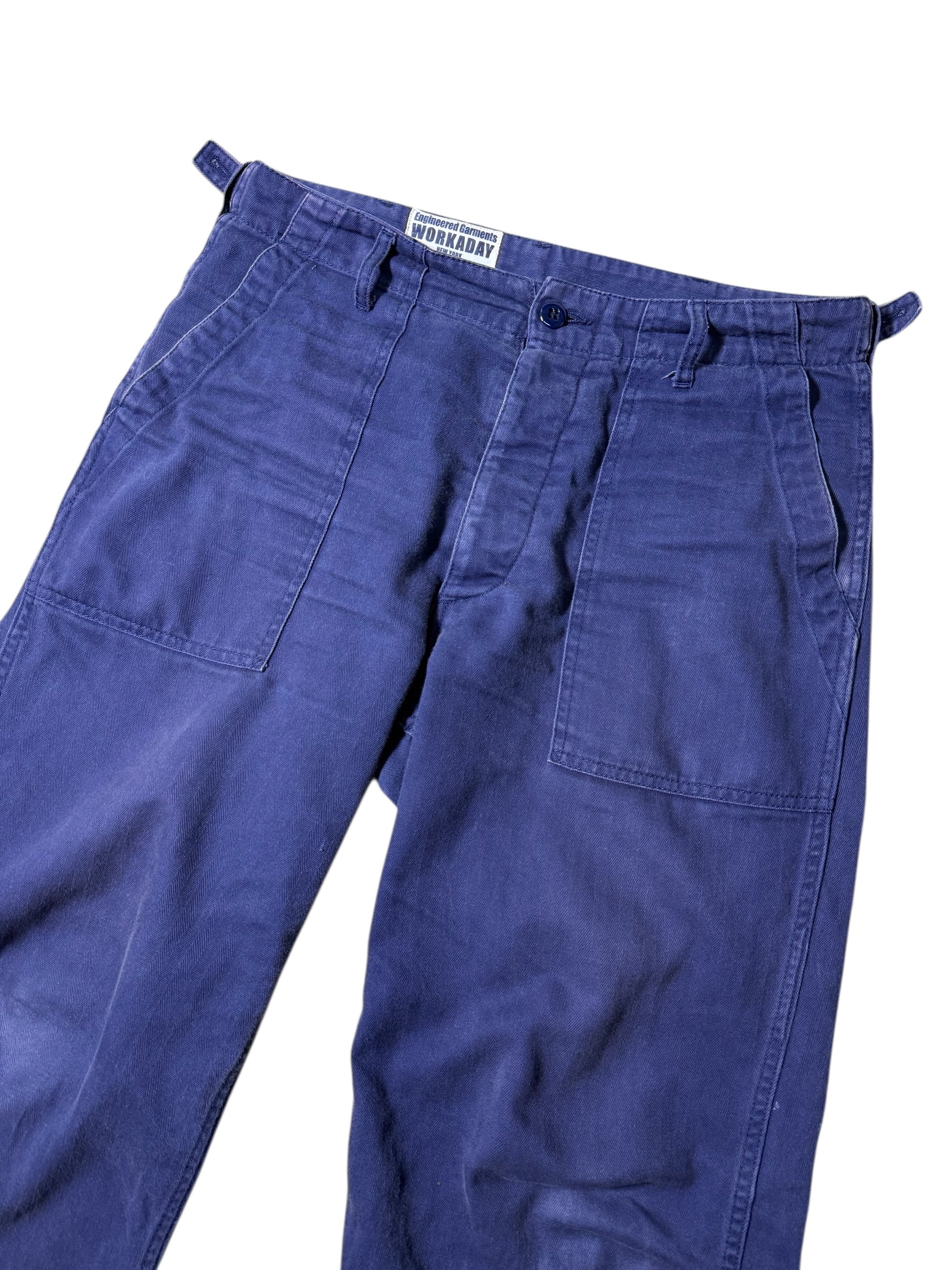 Engineered Garments Workaday fatigue pants crafted from durable Herringbone Twill (HBT) cotton in a deep indigo blue tone. Classic workwear silhouette with wide straight leg and signature EG detailing.