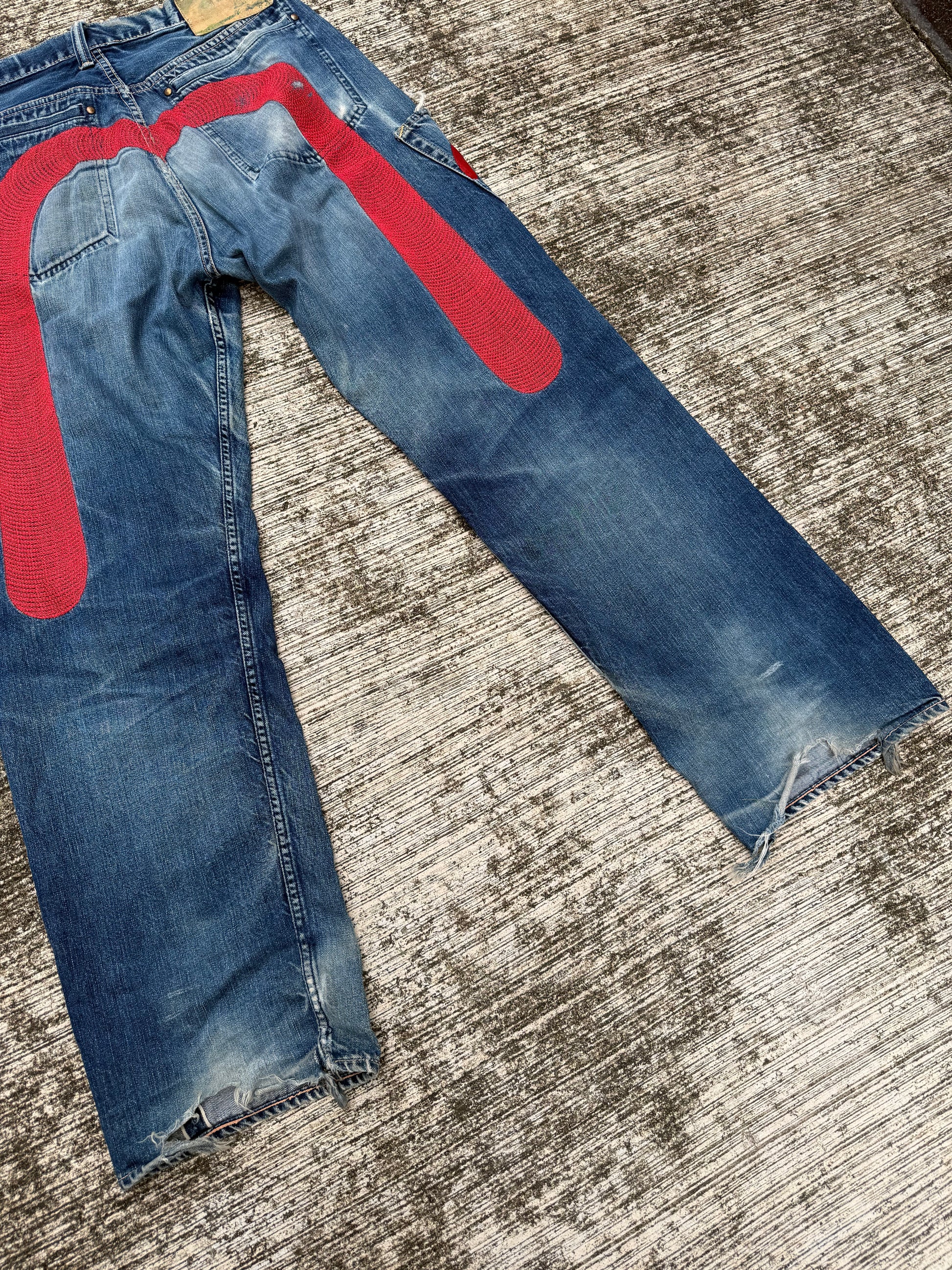 Authentic Evisu Japan jeans, produced by the renowned Siotani Brothers. Crafted from premium selvedge denim with distinct heavy fades, whiskering, and distress details. Features Evisu’s iconic oversized red seagull arcuate embroidered across the back and side pockets.