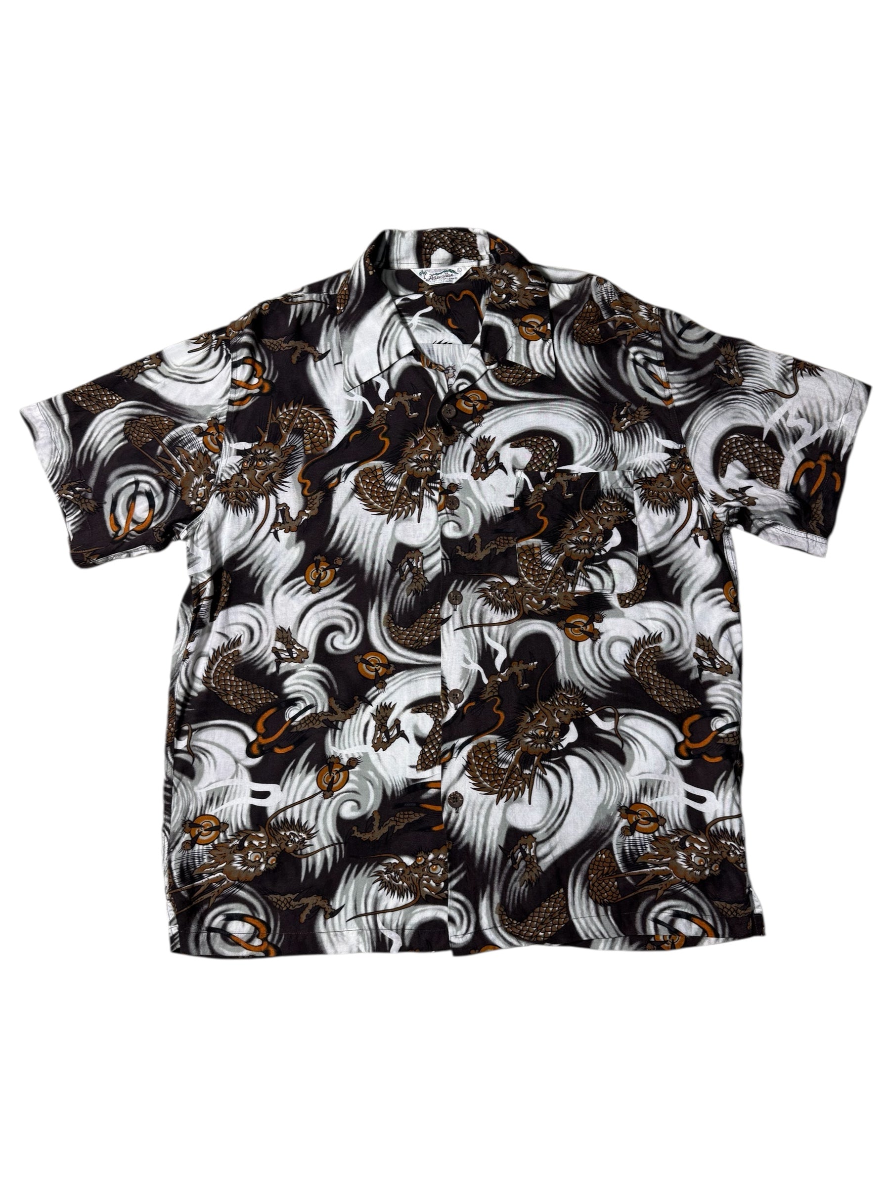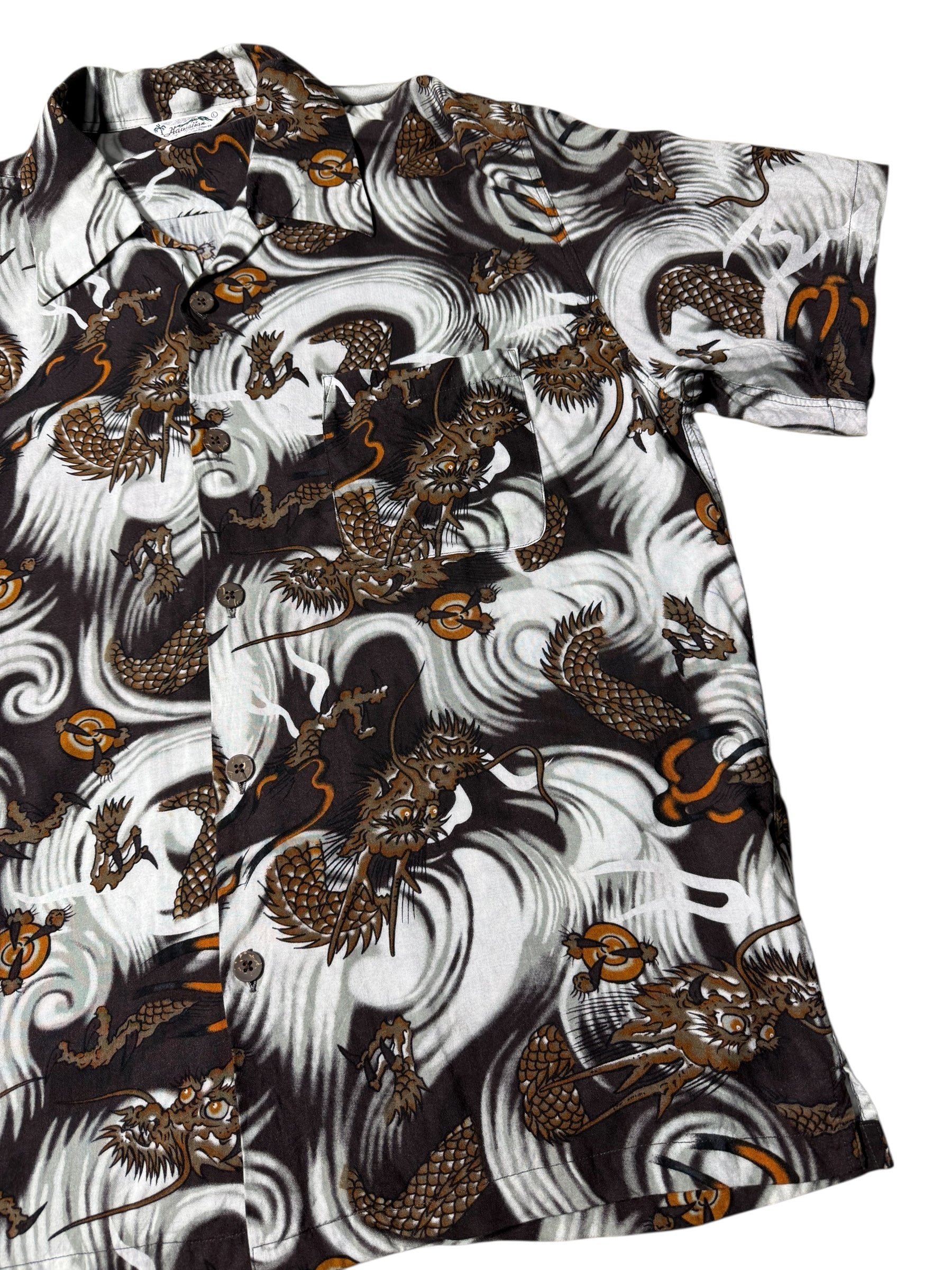 Hawaiian Village rayon Aloha shirt featuring a bold Japanese-style dragon and swirling wave artwork in black, white, and brown tones. Soft drape, lightweight rayon, and that classic late-80s/90s bold graphic look.