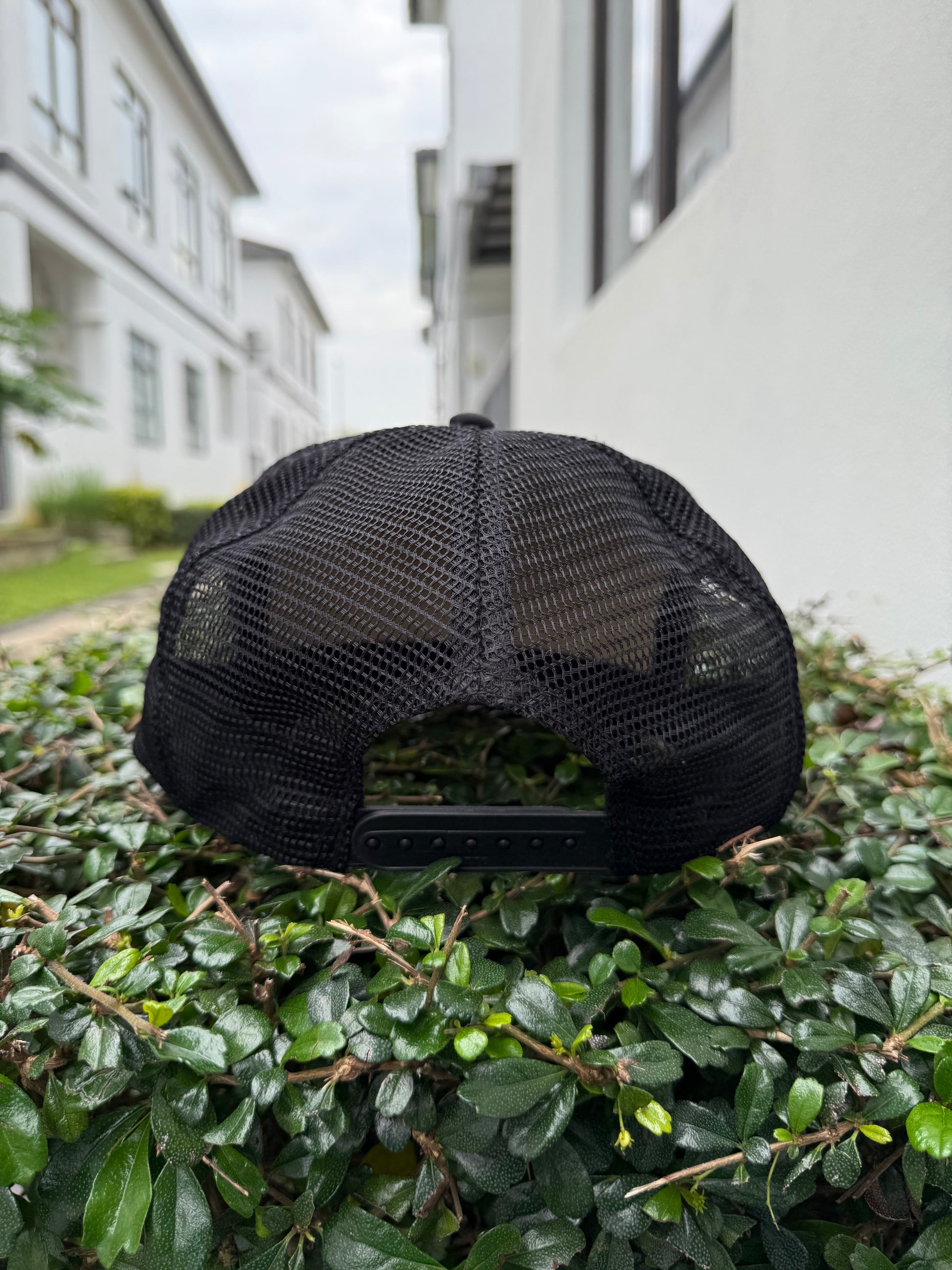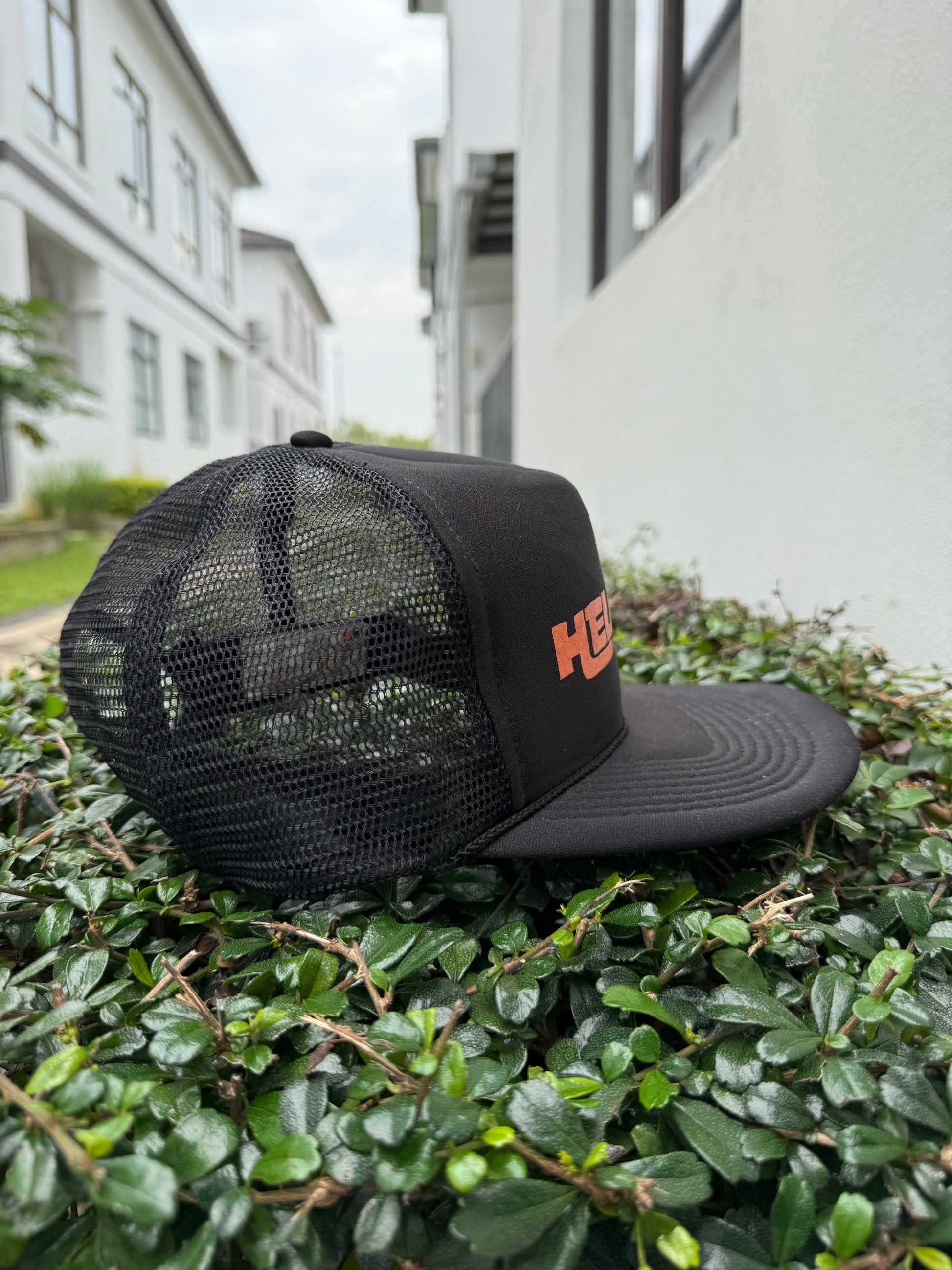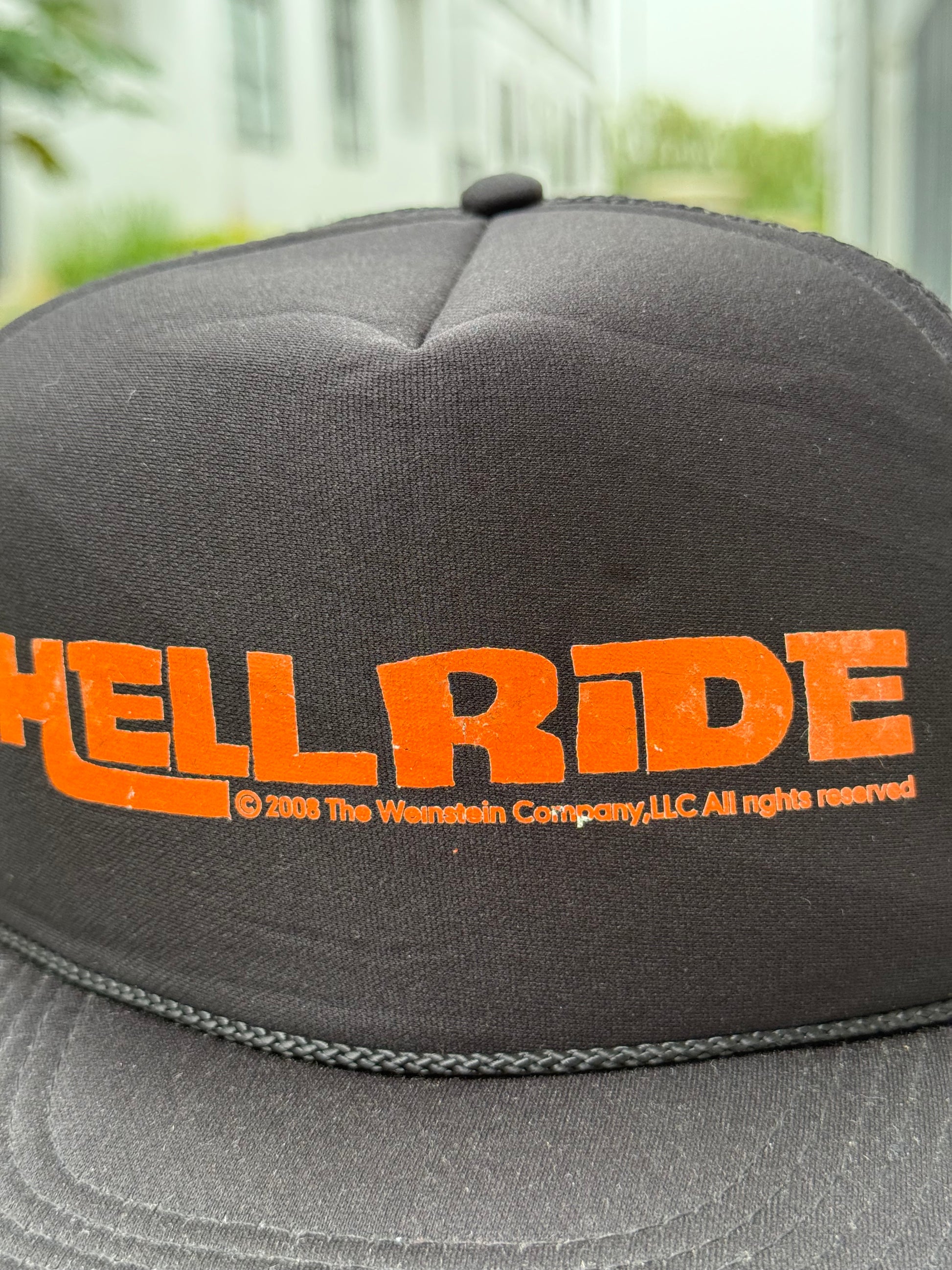 Original promo trucker cap for Hell Ride (2008), the outlaw biker film produced by Quentin Tarantino and directed by Larry Bishop. Features bold orange HELL RIDE logo print on black front panel with matching black mesh and snapback closure. Official ©2008 The Weinstein Company print below logo confirms authenticity. A rare piece of grindhouse cinema memorabilia.