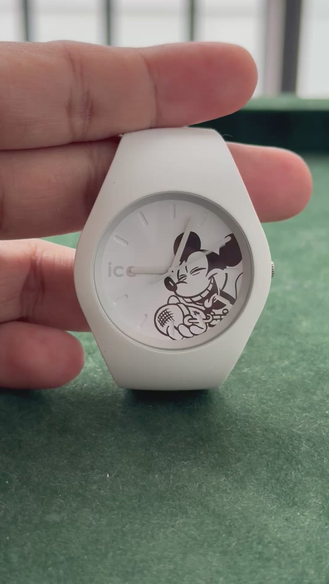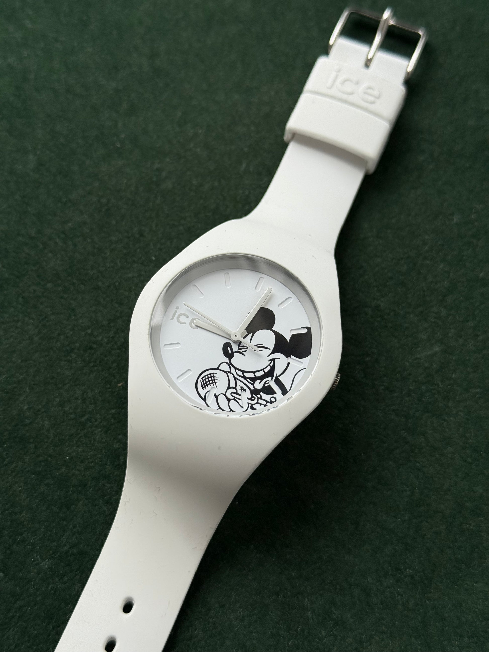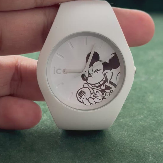 Original Ice-Watch x Disney collaboration featuring the iconic Mickey Mouse design on a clean white dial. Fitted with white silicone strap, stainless steel caseback, and quartz Japan movement. Case size approx. 40mm, unisex fit. A fun collectible piece for Disney fans and casual wear.