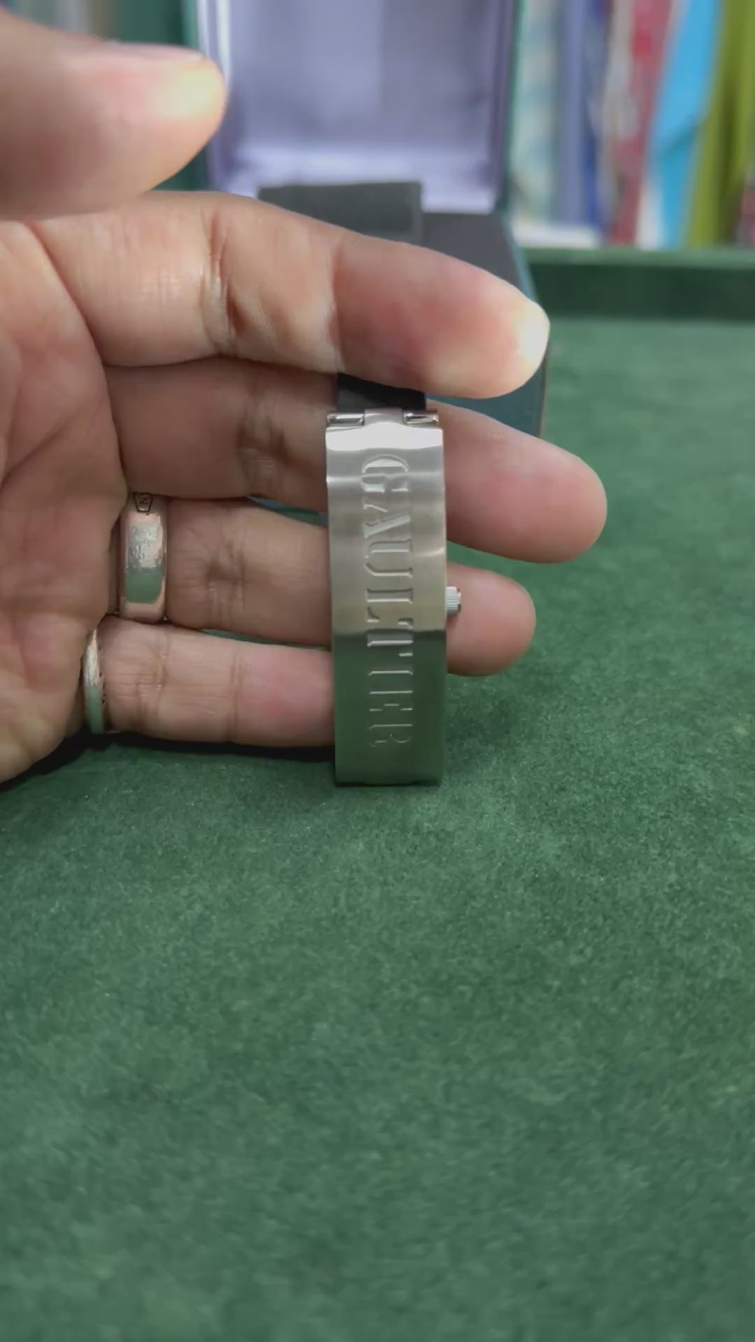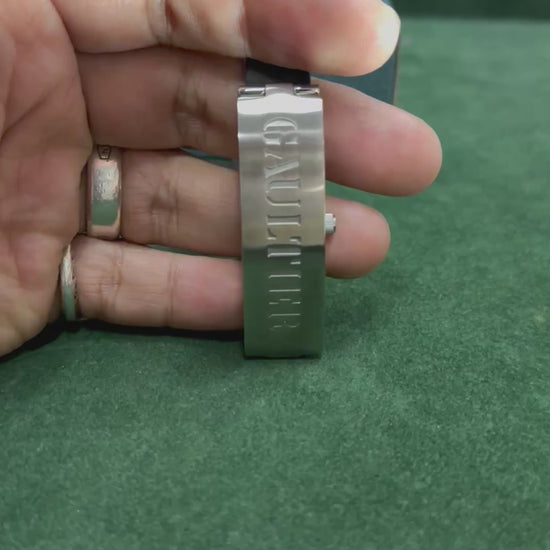 Original Jean Paul Gaultier bangle-style watch with engraved GAULTIER metal cover. Flip-open design reveals a slim rectangular black dial. Stainless steel body with black rubber strap. Rare archive piece from late 90s–early 2000s.