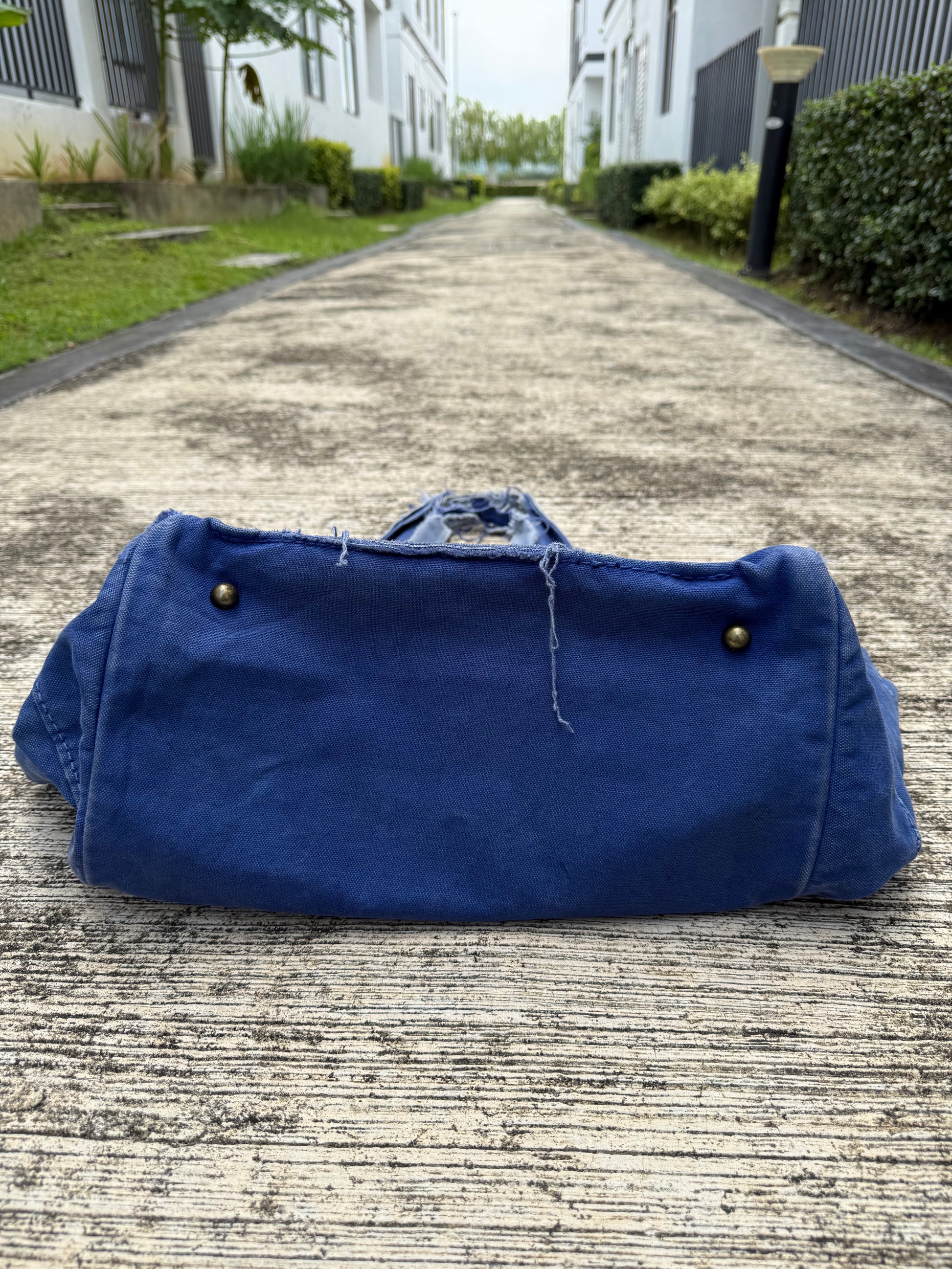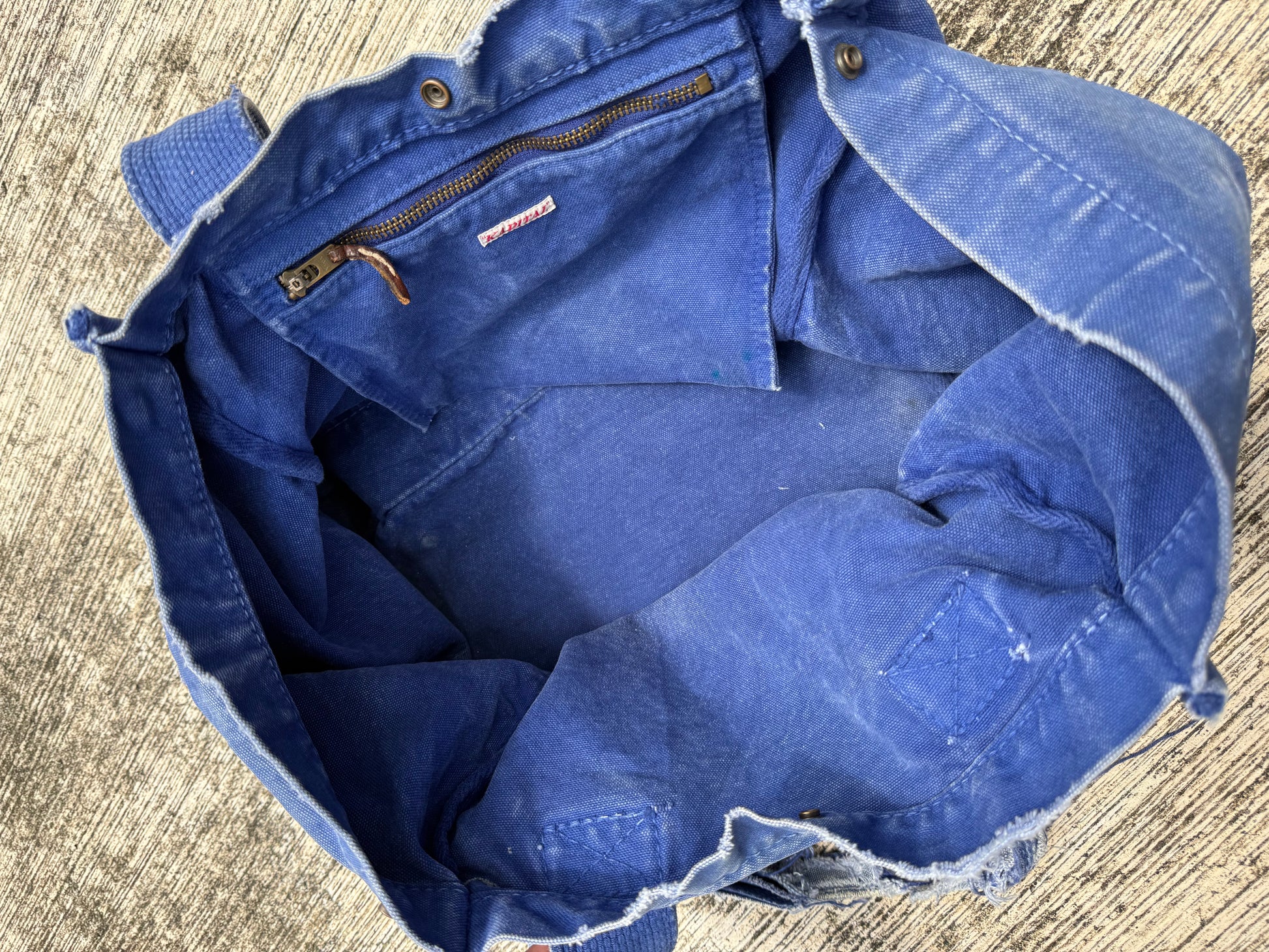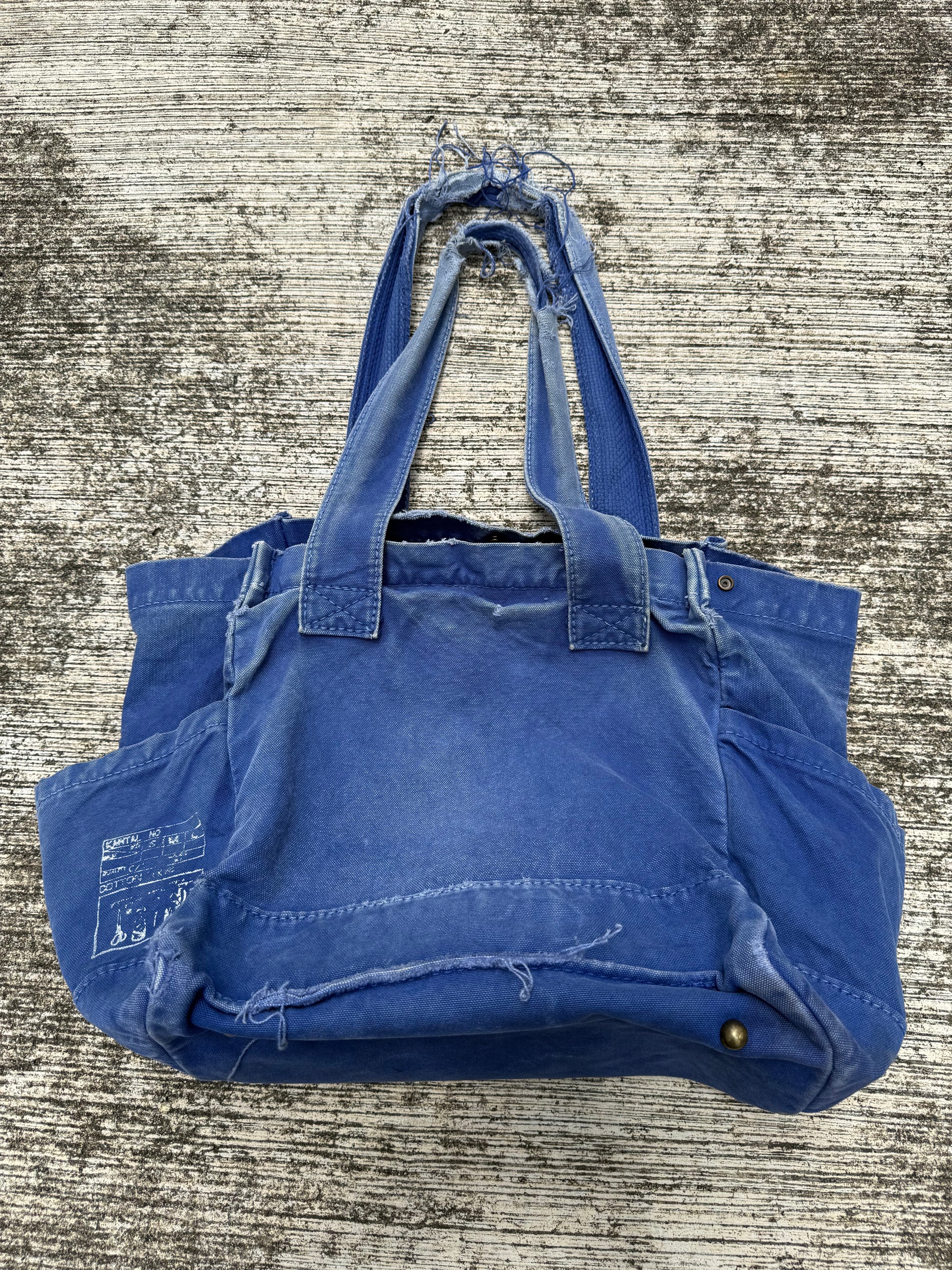 Original Kapital tote bag in heavy-duty blue canvas with natural fading and frayed strap details. Spacious design with multiple pockets and snap button closures. Interior features Kapital label with zip pocket. Perfect everyday carry with authentic worn-in Kapital character.