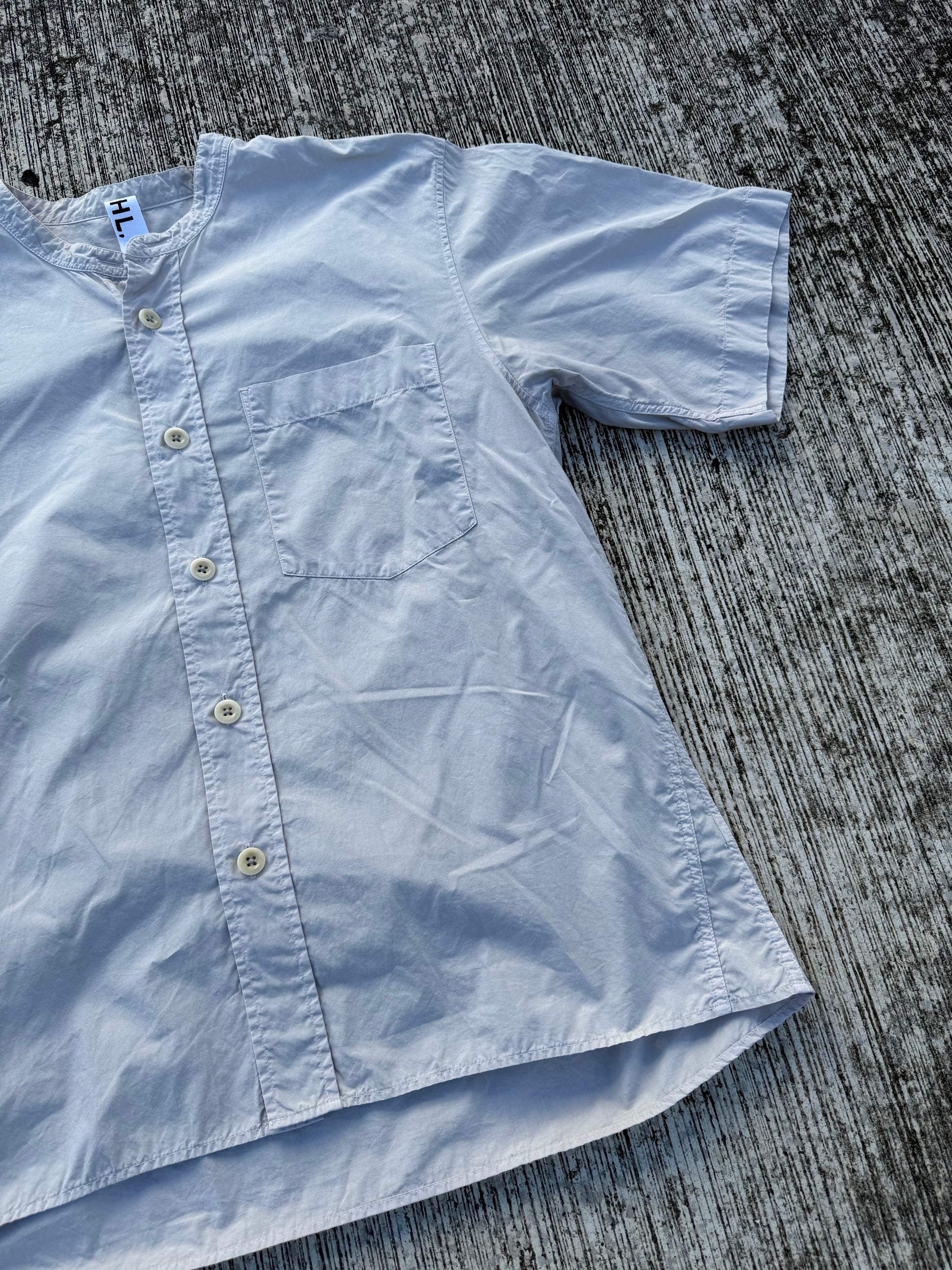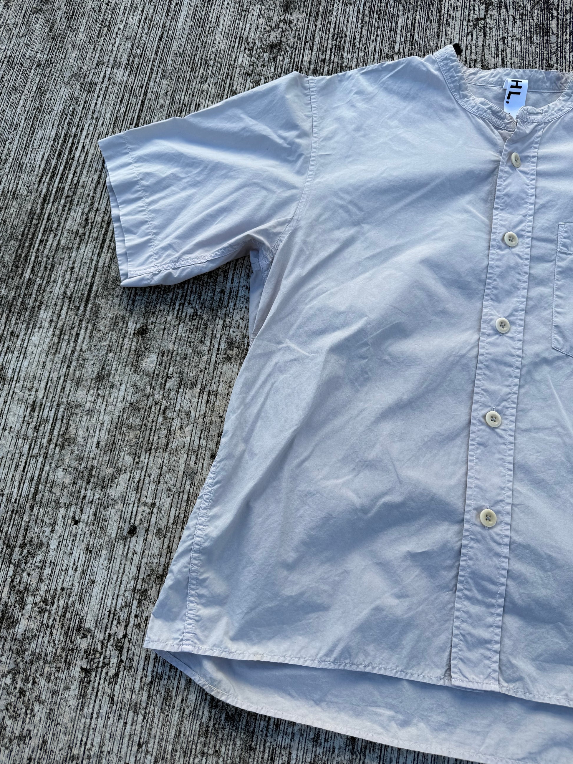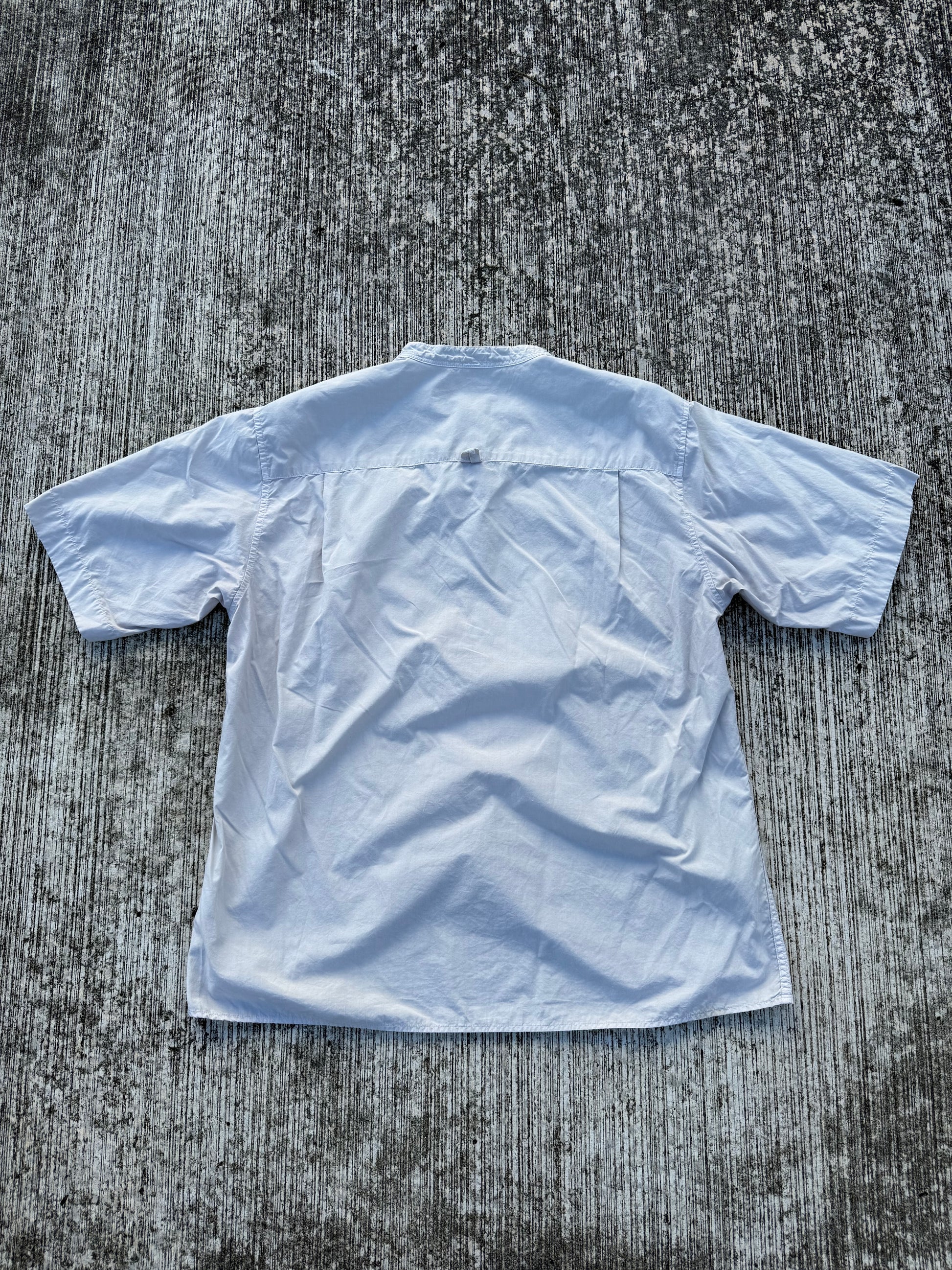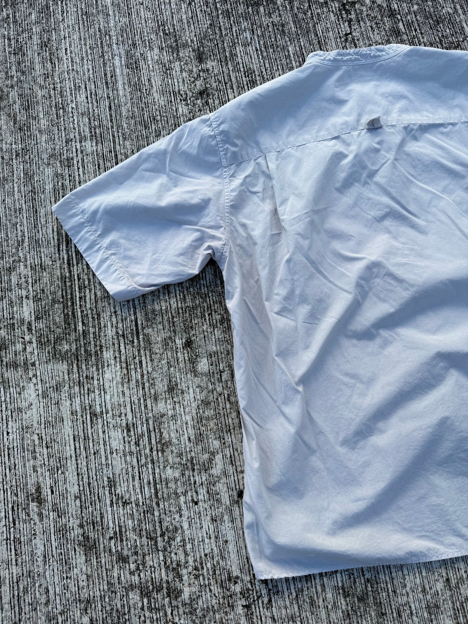 Minimalist short-sleeve shirt from MHL. by Margaret Howell, crafted in lightweight white cotton poplin. Features a clean band collar, button front closure, and single chest pocket. Timeless design inspired by functional workwear, perfect for layering or standalone wear.