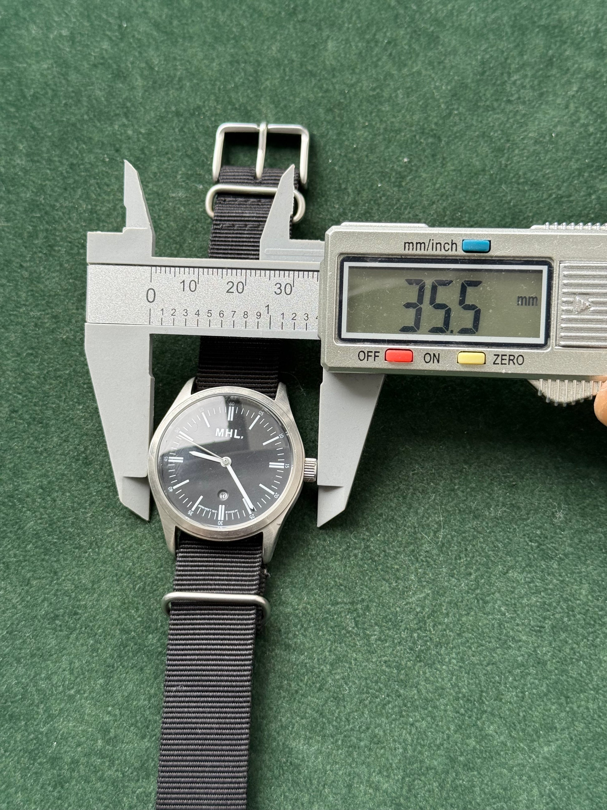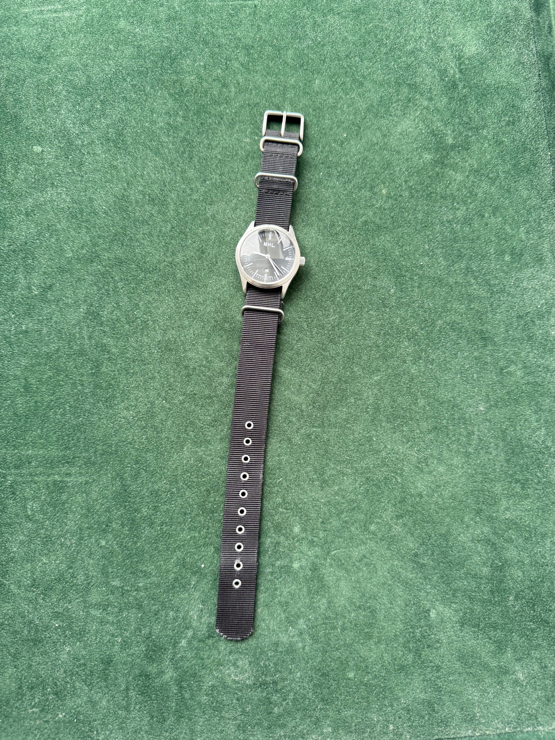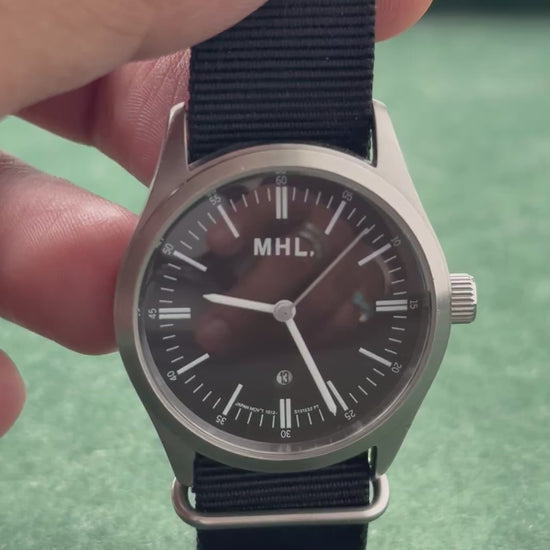 Minimalist MHL. (Margaret Howell) wristwatch with clean black dial, slim baton markers, and date window at 6 o’clock. Paired with black NATO nylon strap and stainless steel case. Caseback signed “MHL.” with 5 BAR water resistance. Compact 35.5mm size, unisex fit.