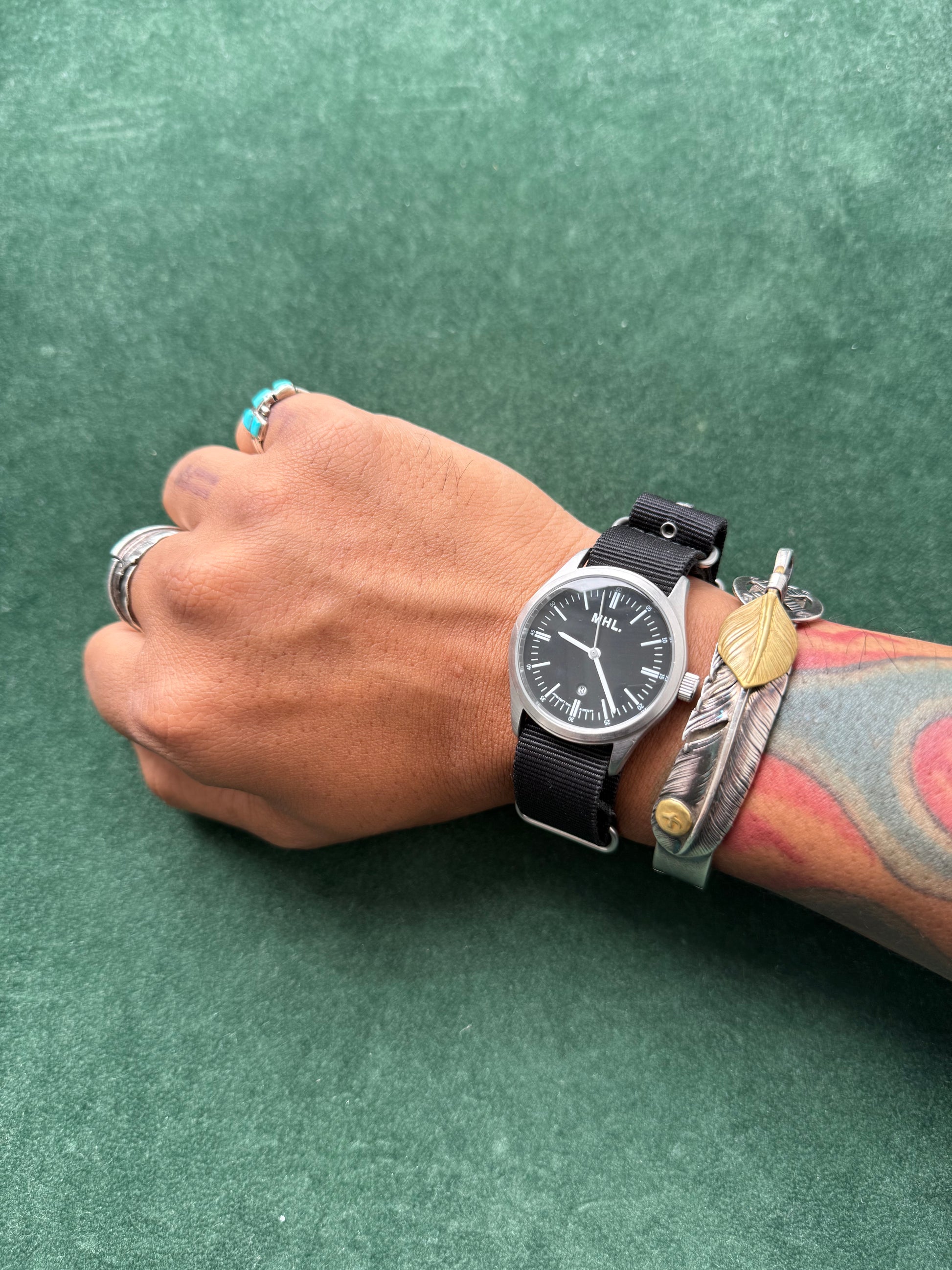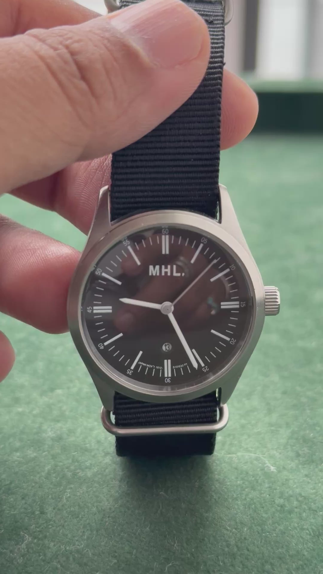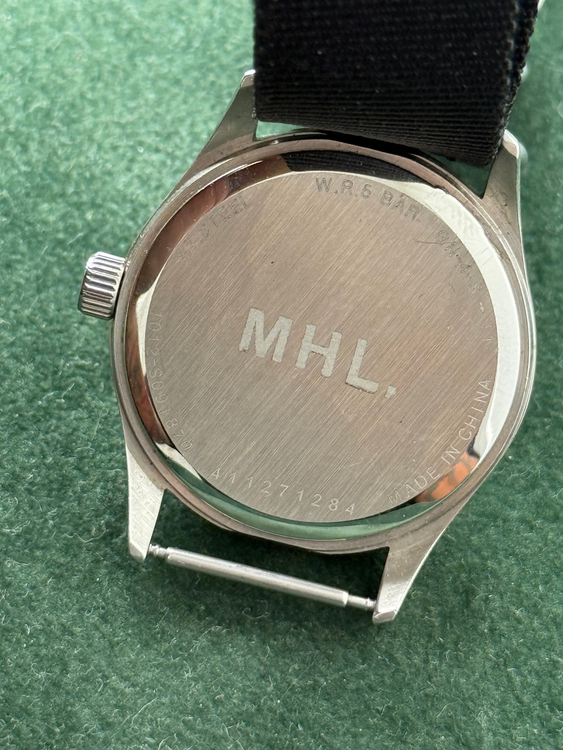 Minimalist MHL. (Margaret Howell) wristwatch with clean black dial, slim baton markers, and date window at 6 o’clock. Paired with black NATO nylon strap and stainless steel case. Caseback signed “MHL.” with 5 BAR water resistance. Compact 35.5mm size, unisex fit.