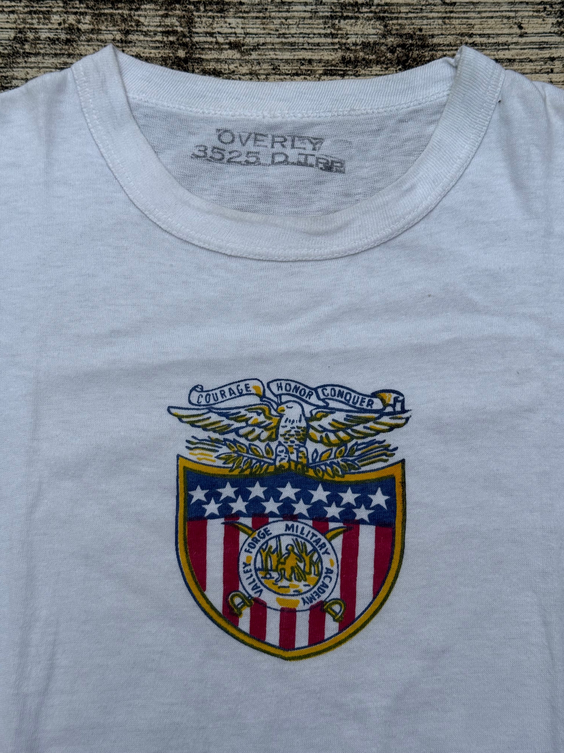 Rare Valley Forge Military Academy T-Shirt from the 1940s, featuring eagle crest shield graphic with stars, stripes, and academy emblem. Motto “Courage • Honor • Conquer” across banner. White single stitch body with original Overly Sportswear stencil.