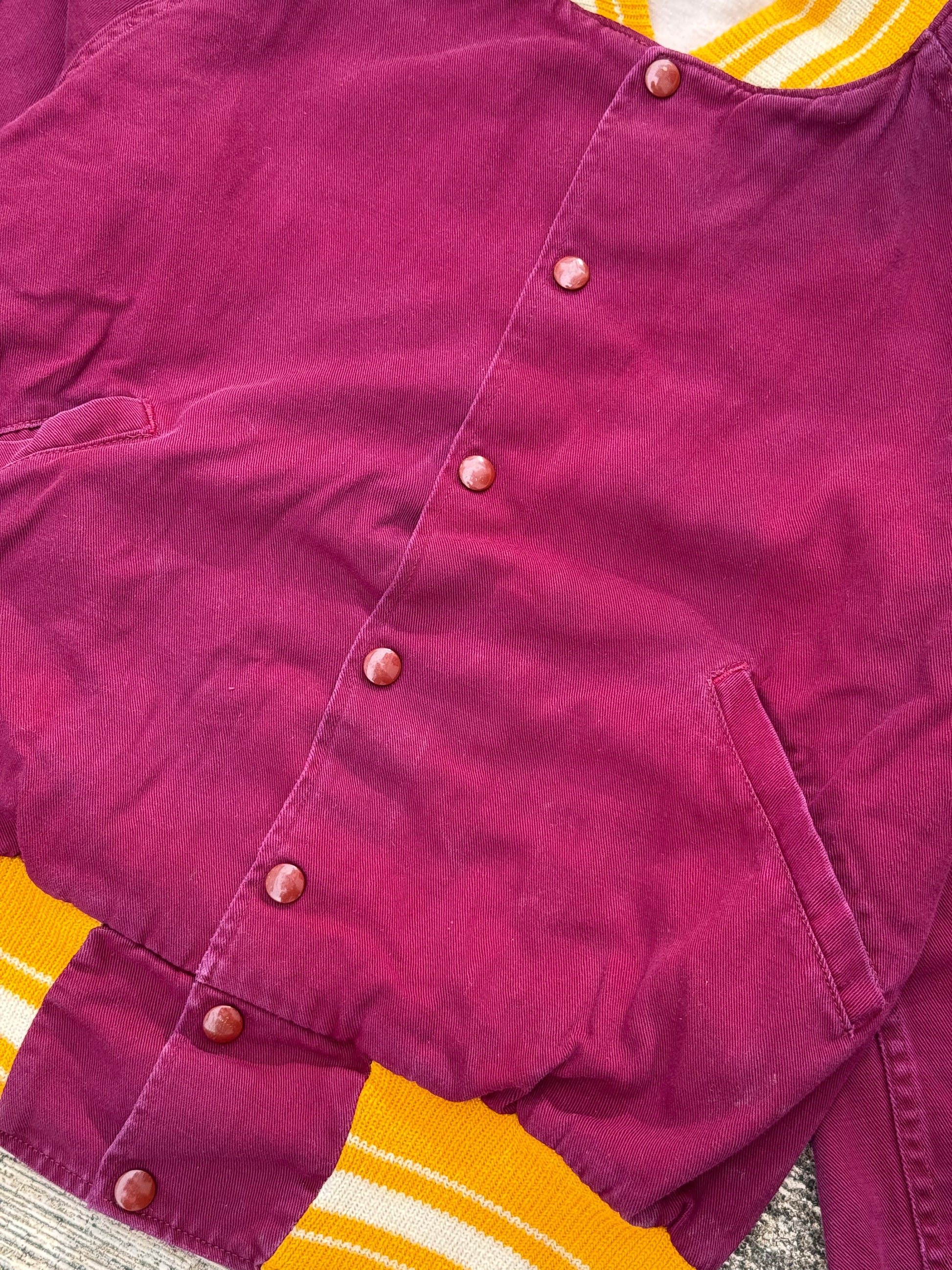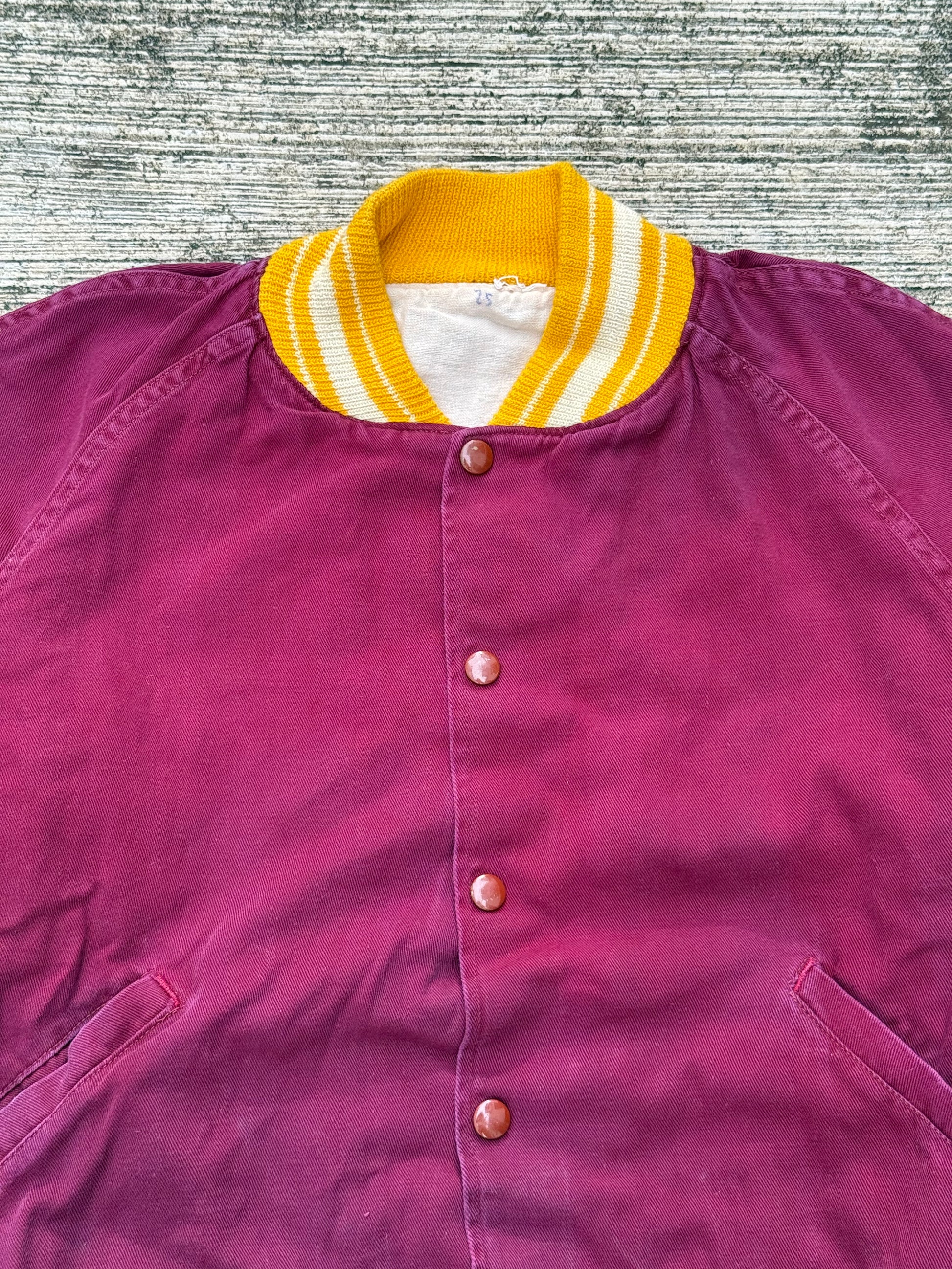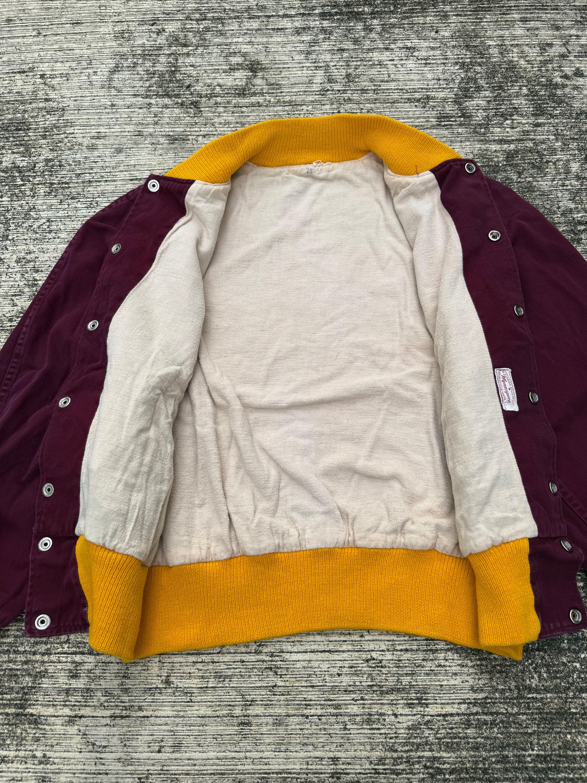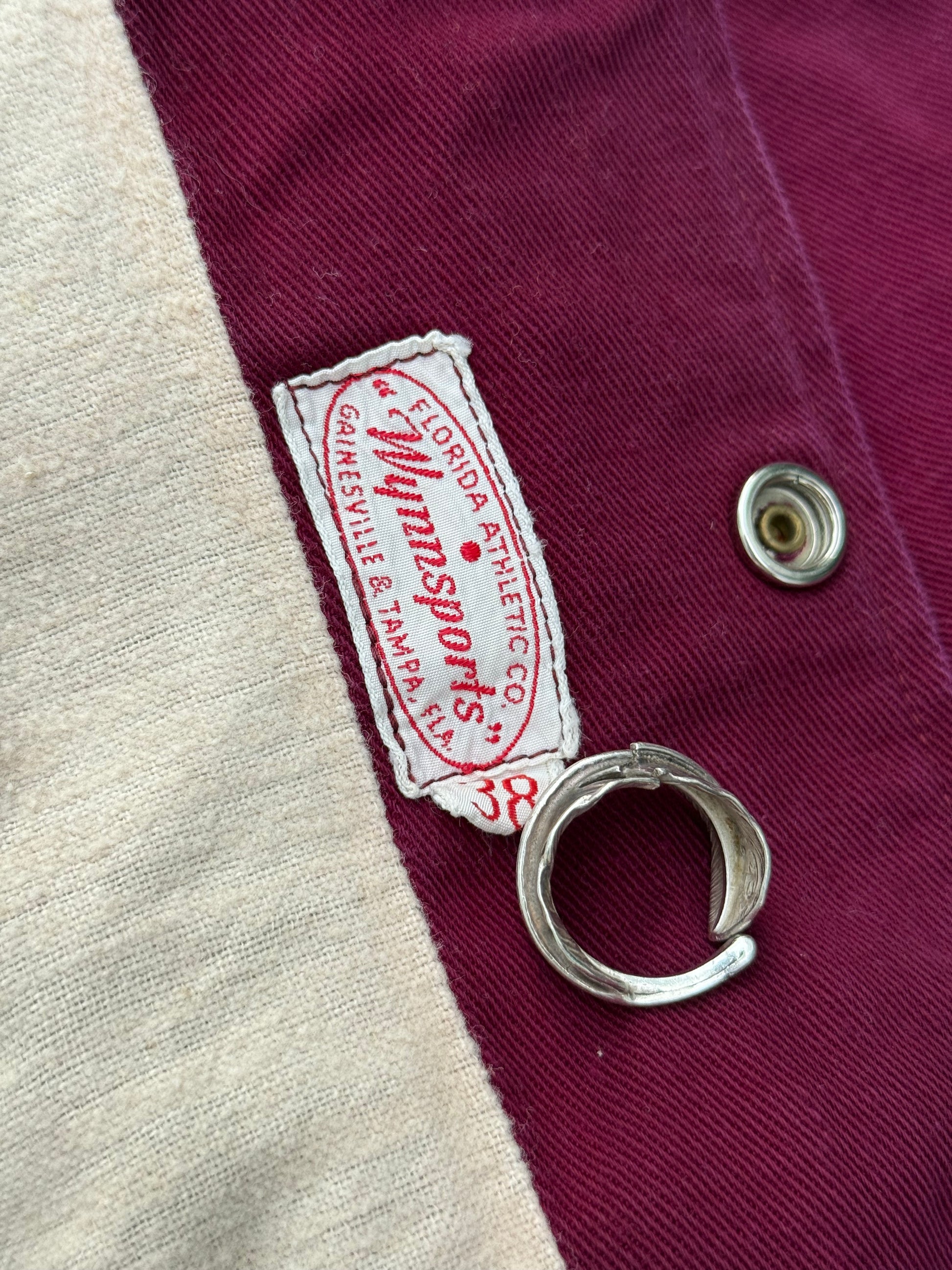 Authentic 1950s WynnSports Varsity Jacket, produced by the Florida Athletic Co., Gainesville & Tampa, FLA. Classic American athletic wear design with a bold maroon cotton body and contrasting gold/yellow knit collar, cuffs, and waistband with white stripes. Snap button closure, raglan sleeves, and warm cotton flannel lining.
