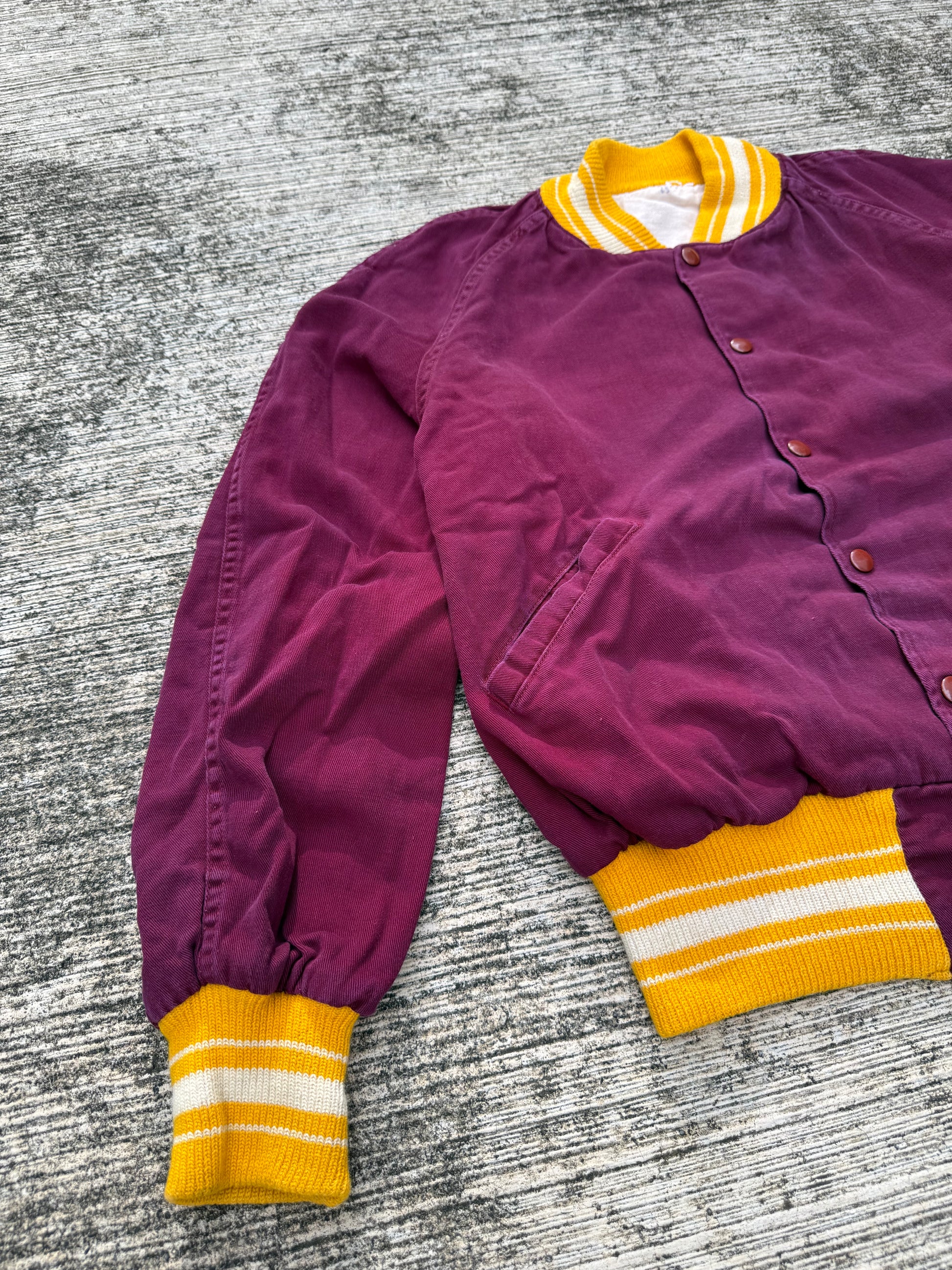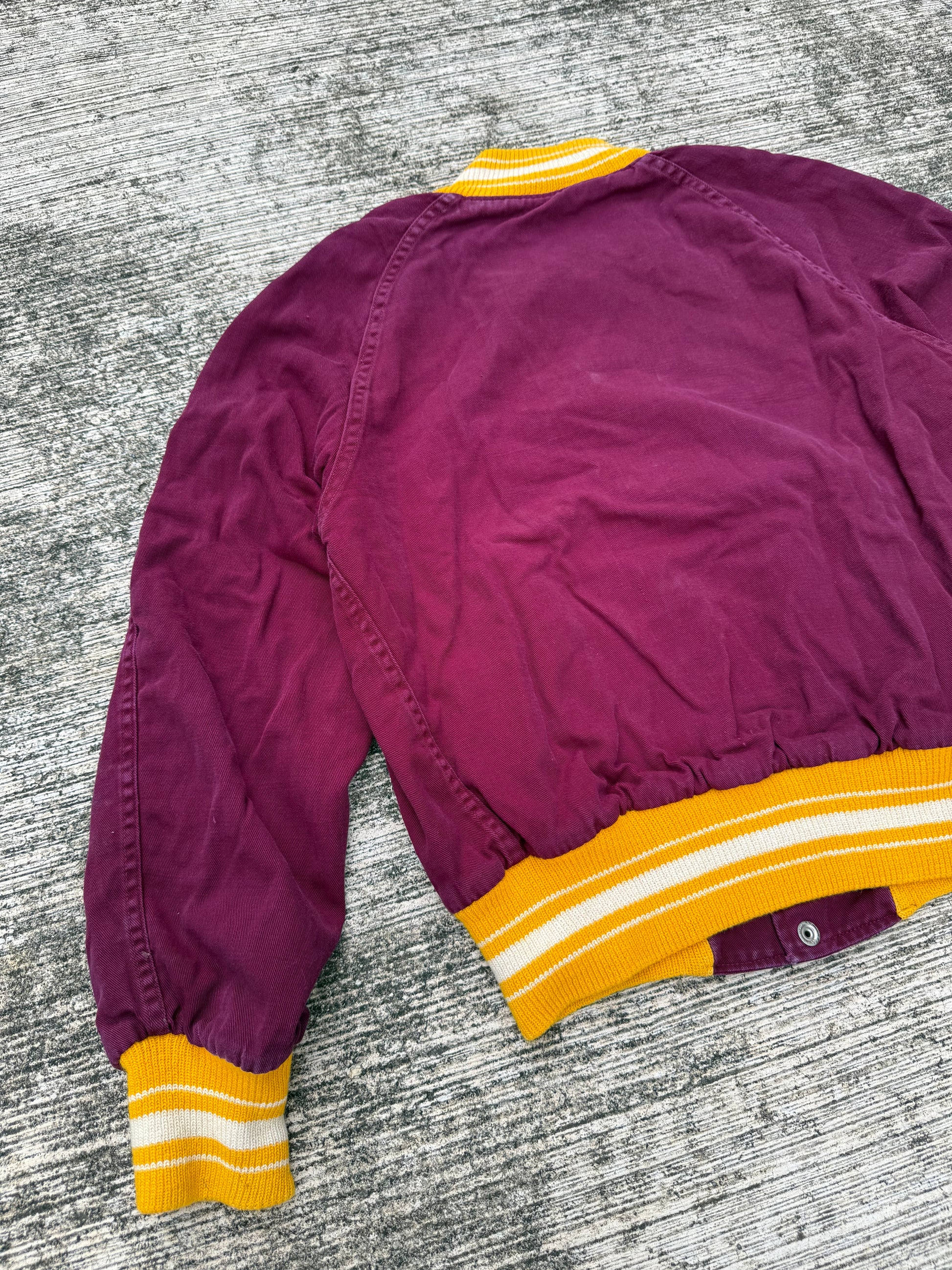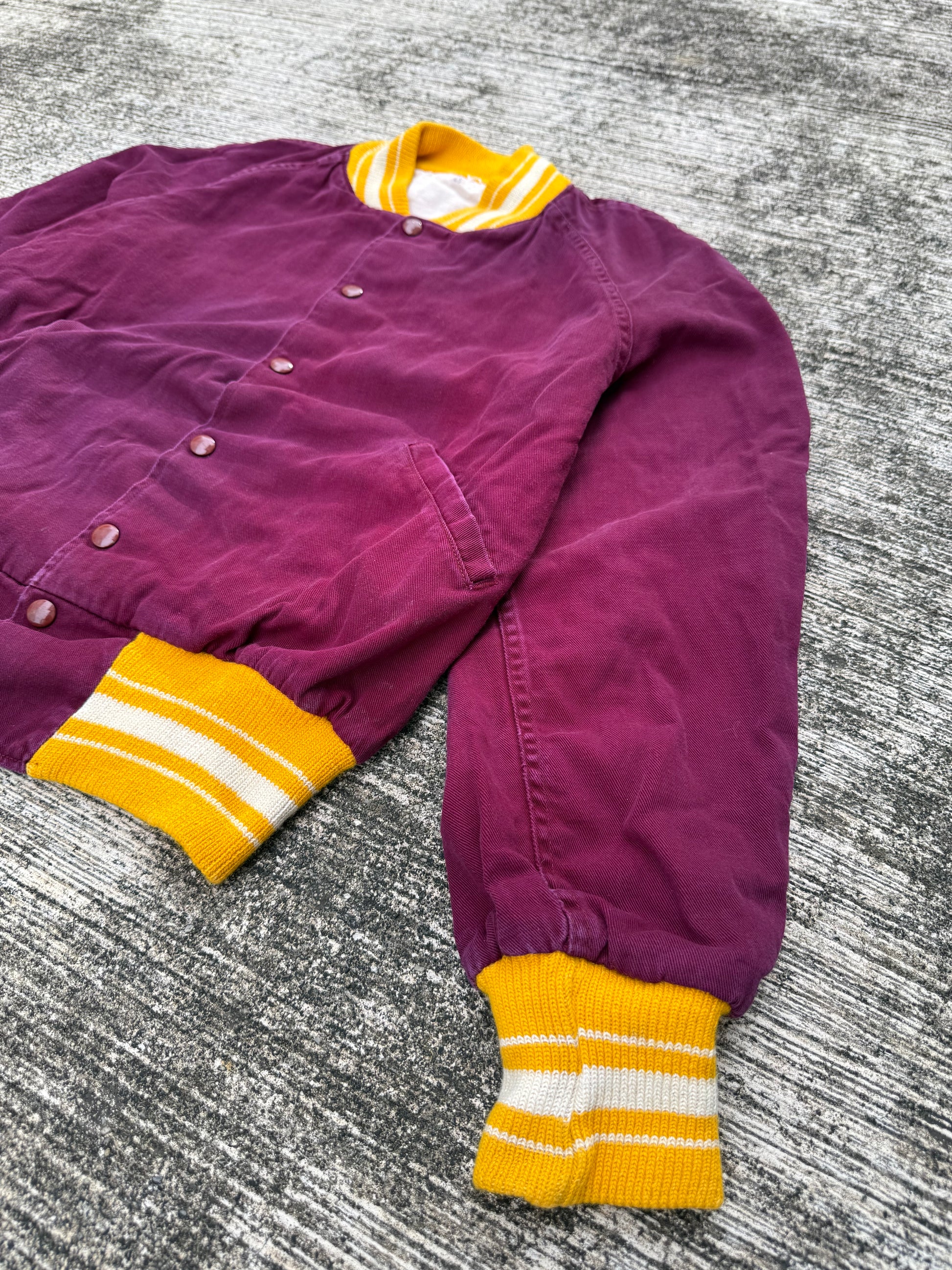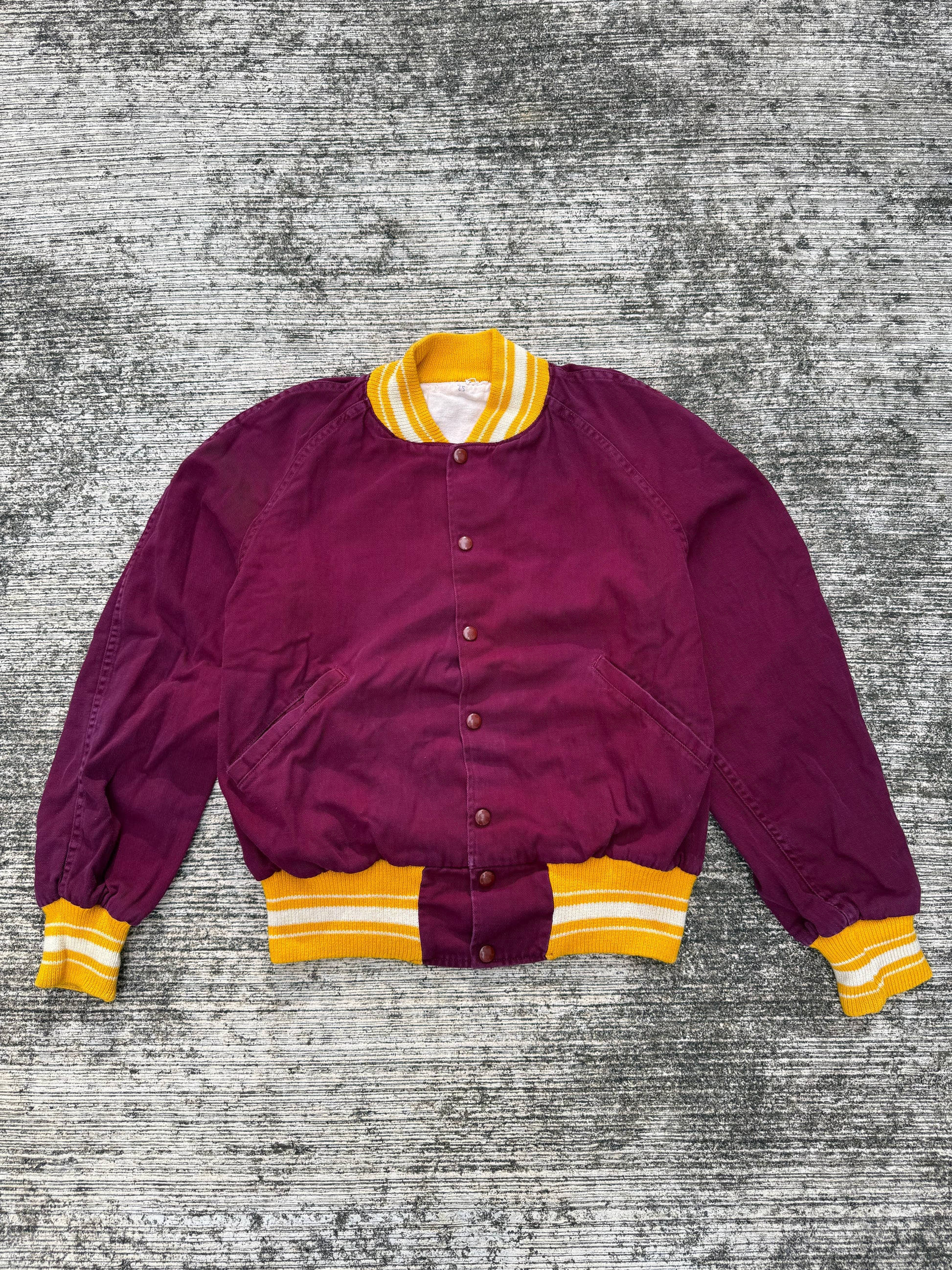 Authentic 1950s WynnSports Varsity Jacket, produced by the Florida Athletic Co., Gainesville & Tampa, FLA. Classic American athletic wear design with a bold maroon cotton body and contrasting gold/yellow knit collar, cuffs, and waistband with white stripes. Snap button closure, raglan sleeves, and warm cotton flannel lining.