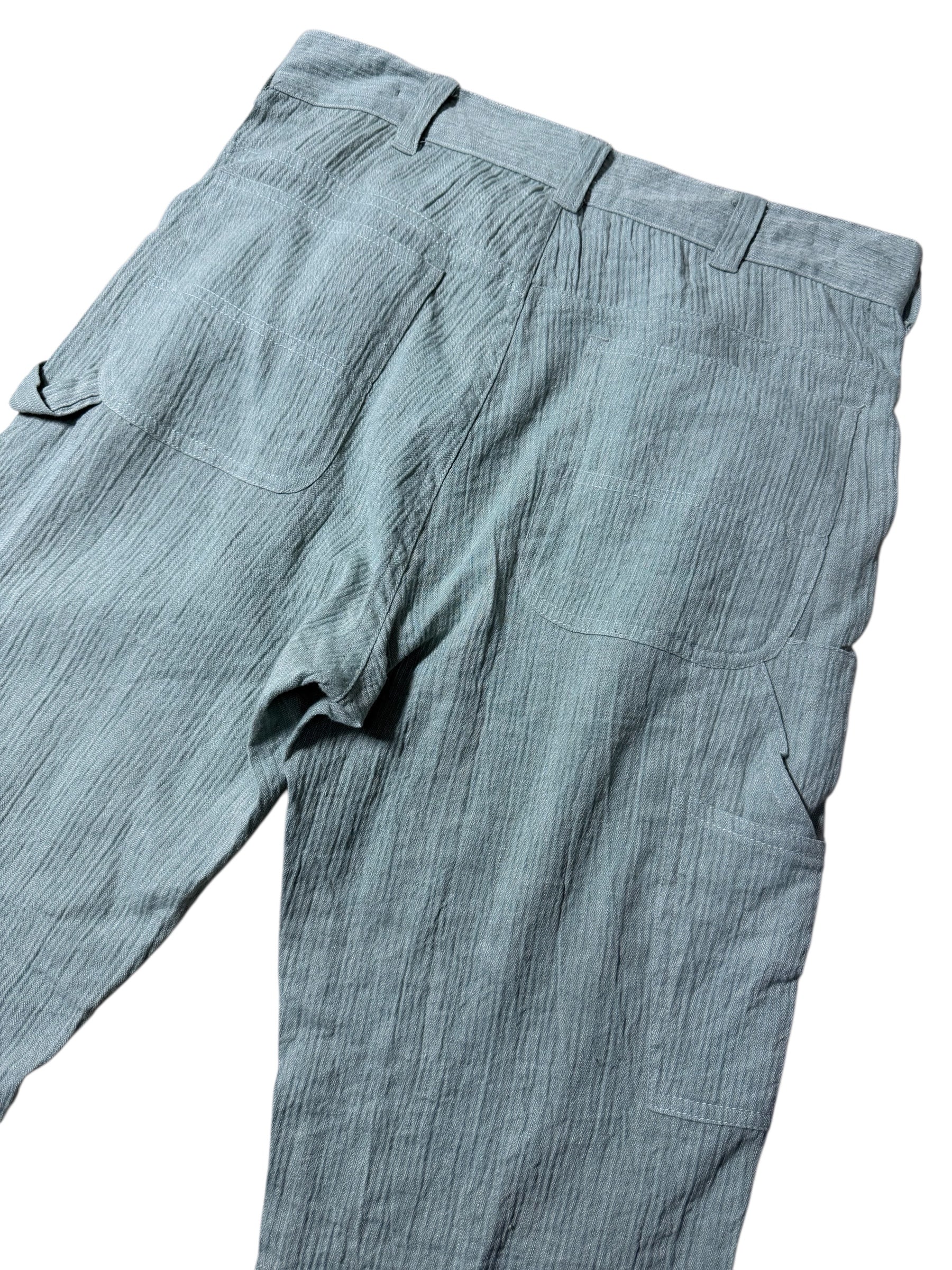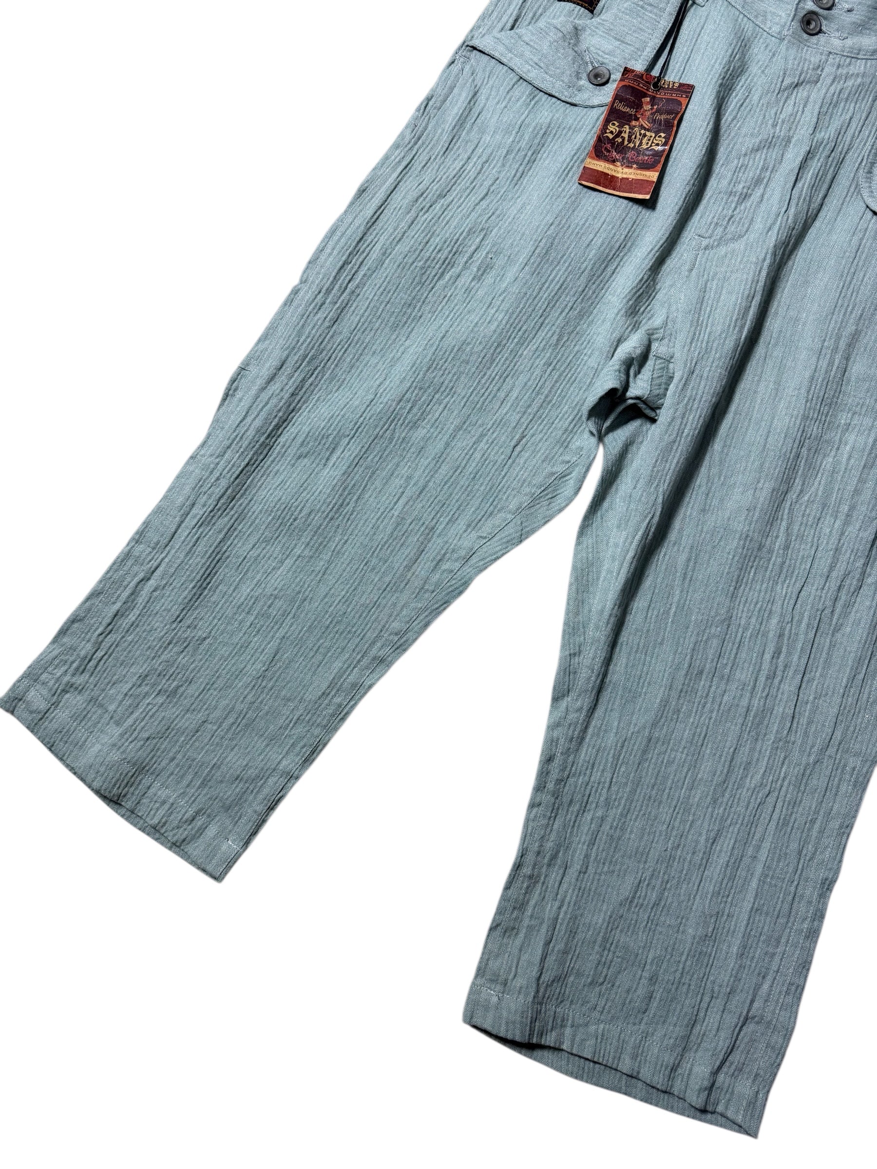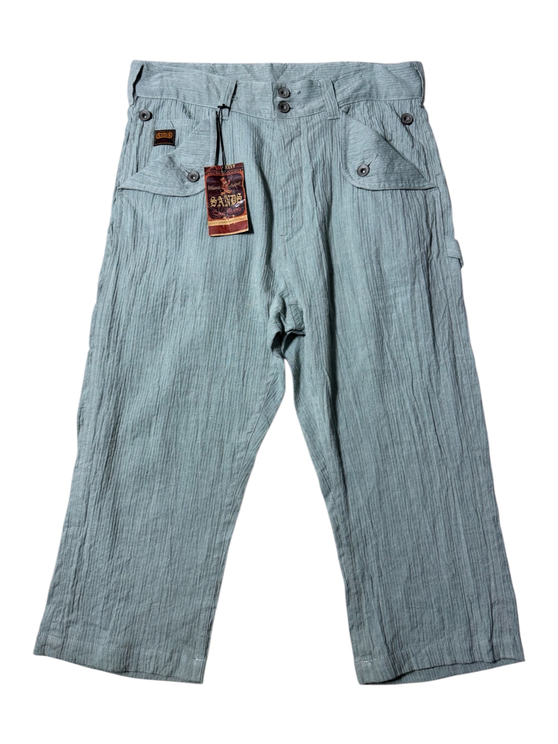 Premium Japanese-made SANDS work pants featuring a crinkle/rough-weave cotton texture, button-fly front, and wide straight silhouette. Original tag still attached. Rare model with flap pockets and utilitarian details.
