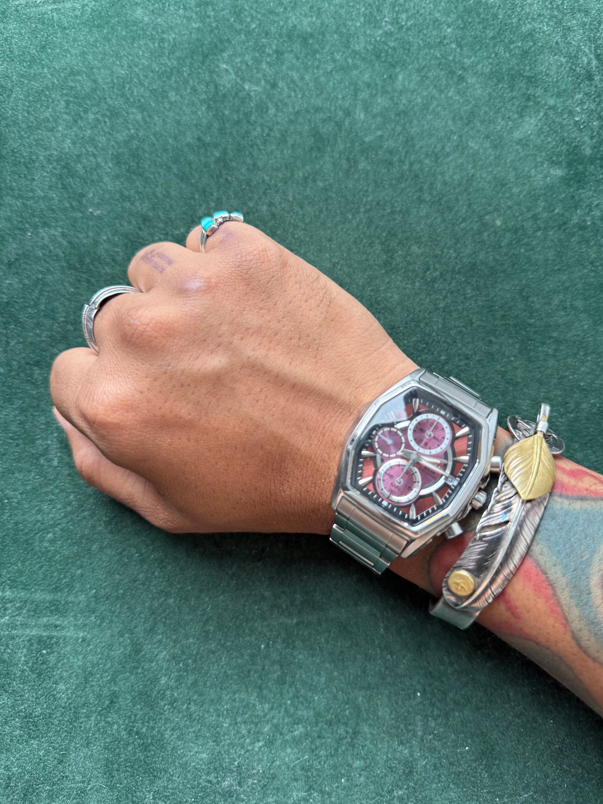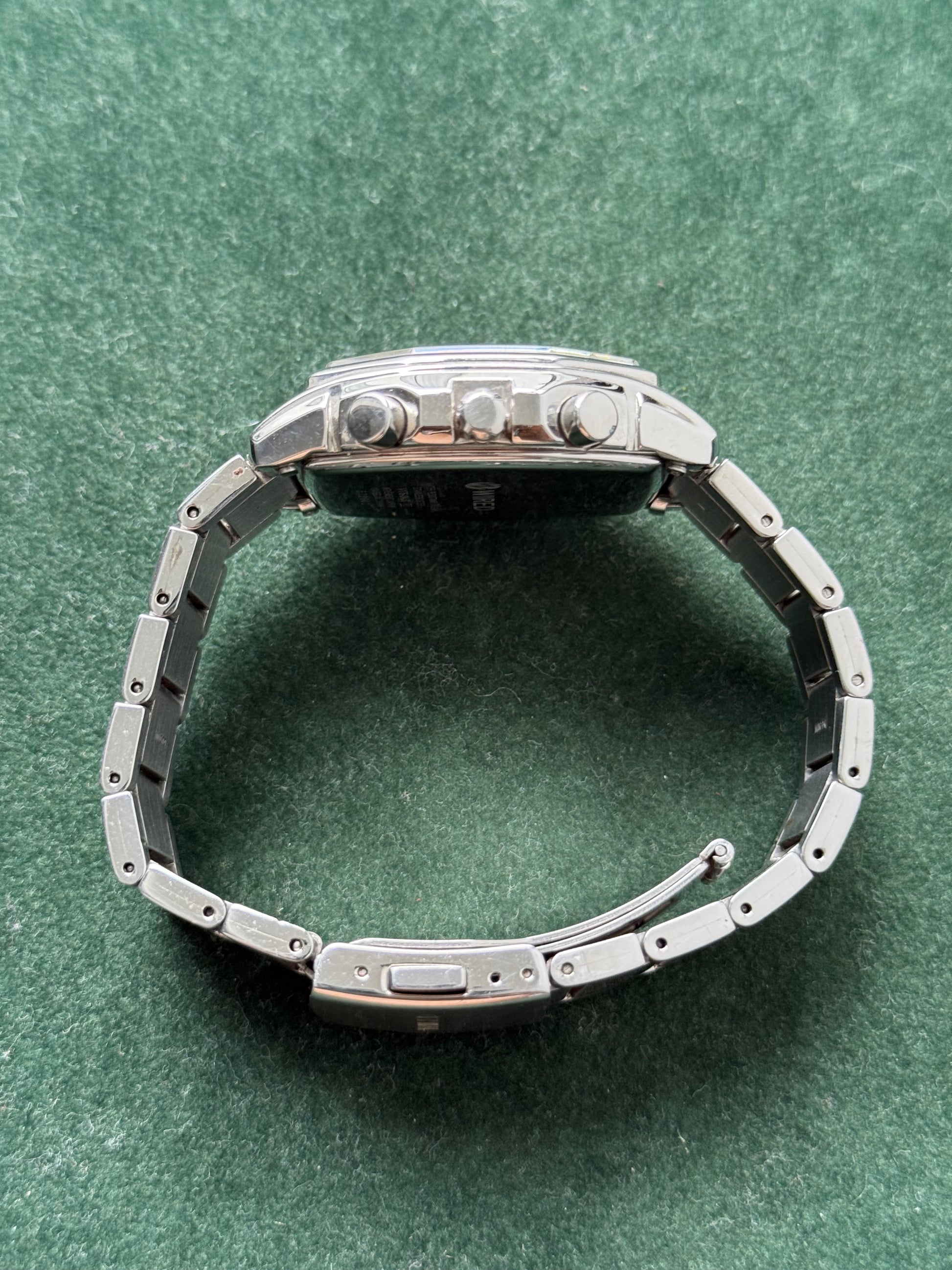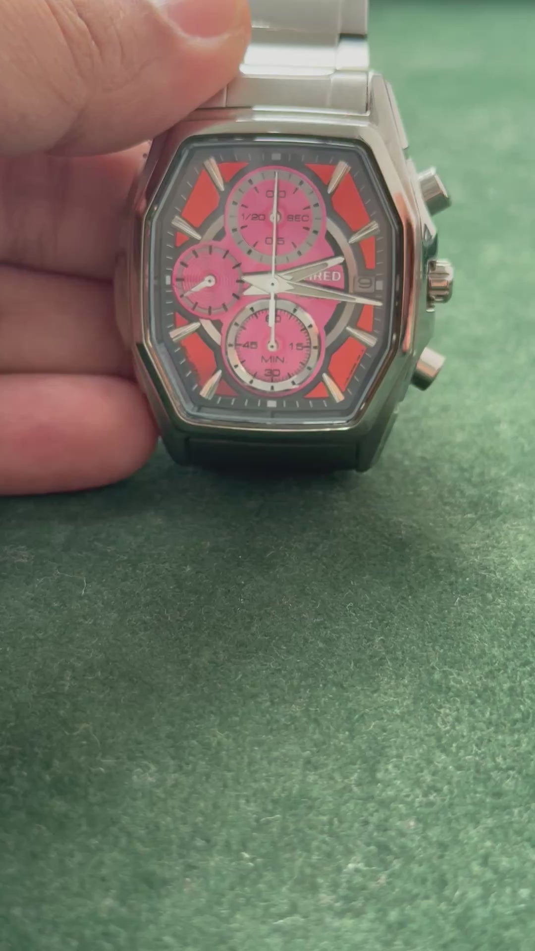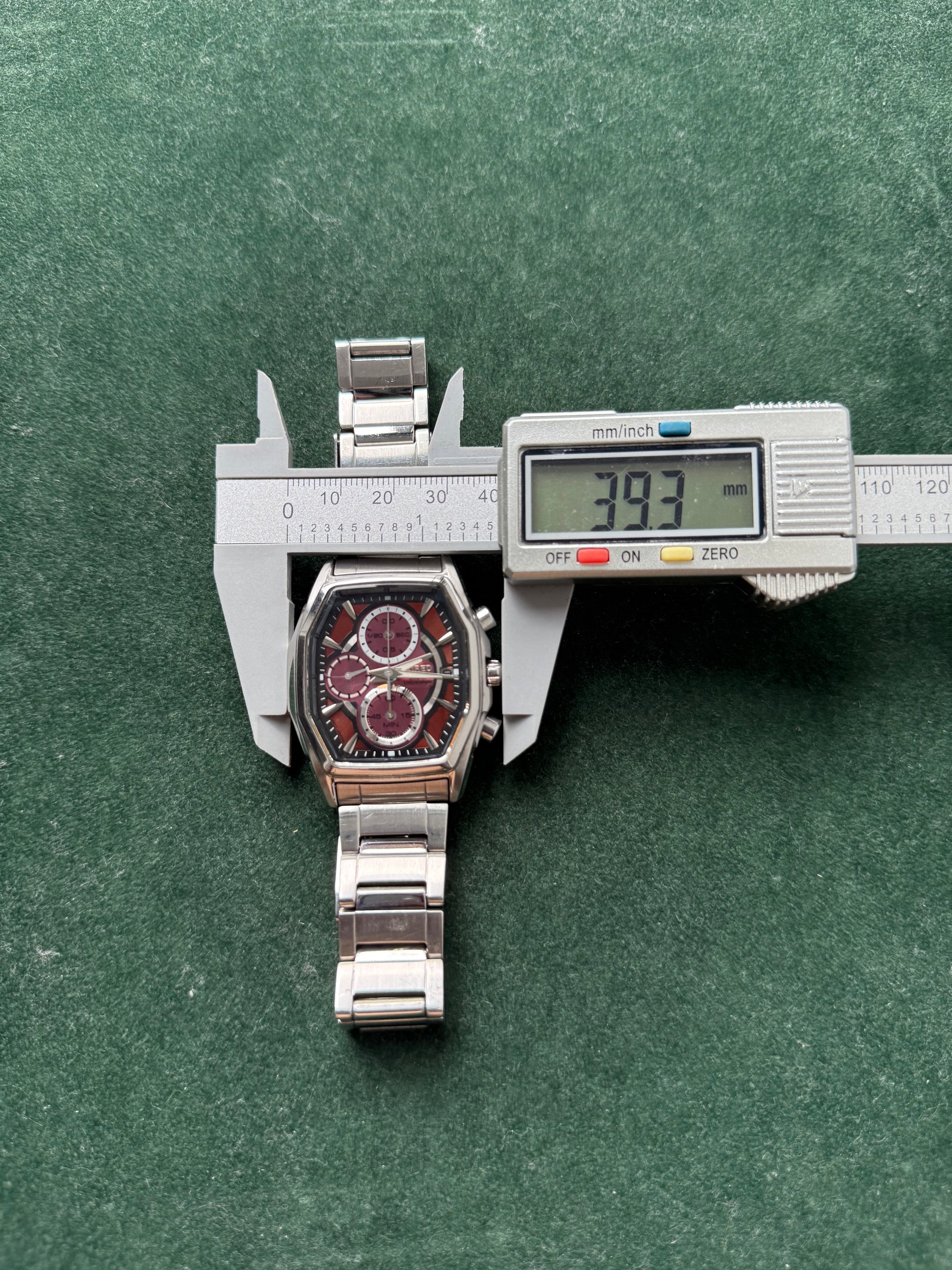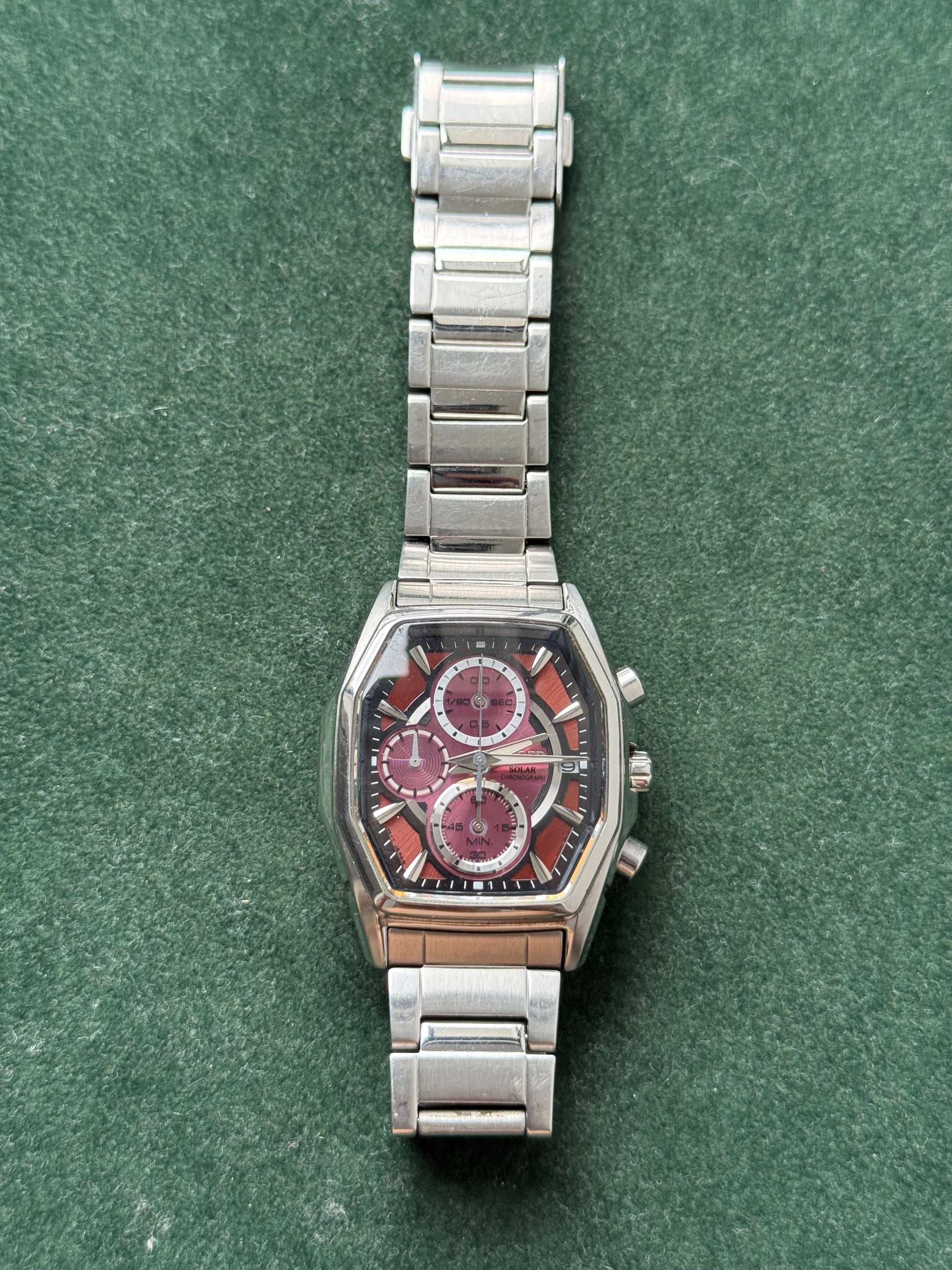 Authentic Seiko Wired Solar Chronograph men’s watch with a striking red dial and three sub-dials (minutes, seconds, and 24-hour).