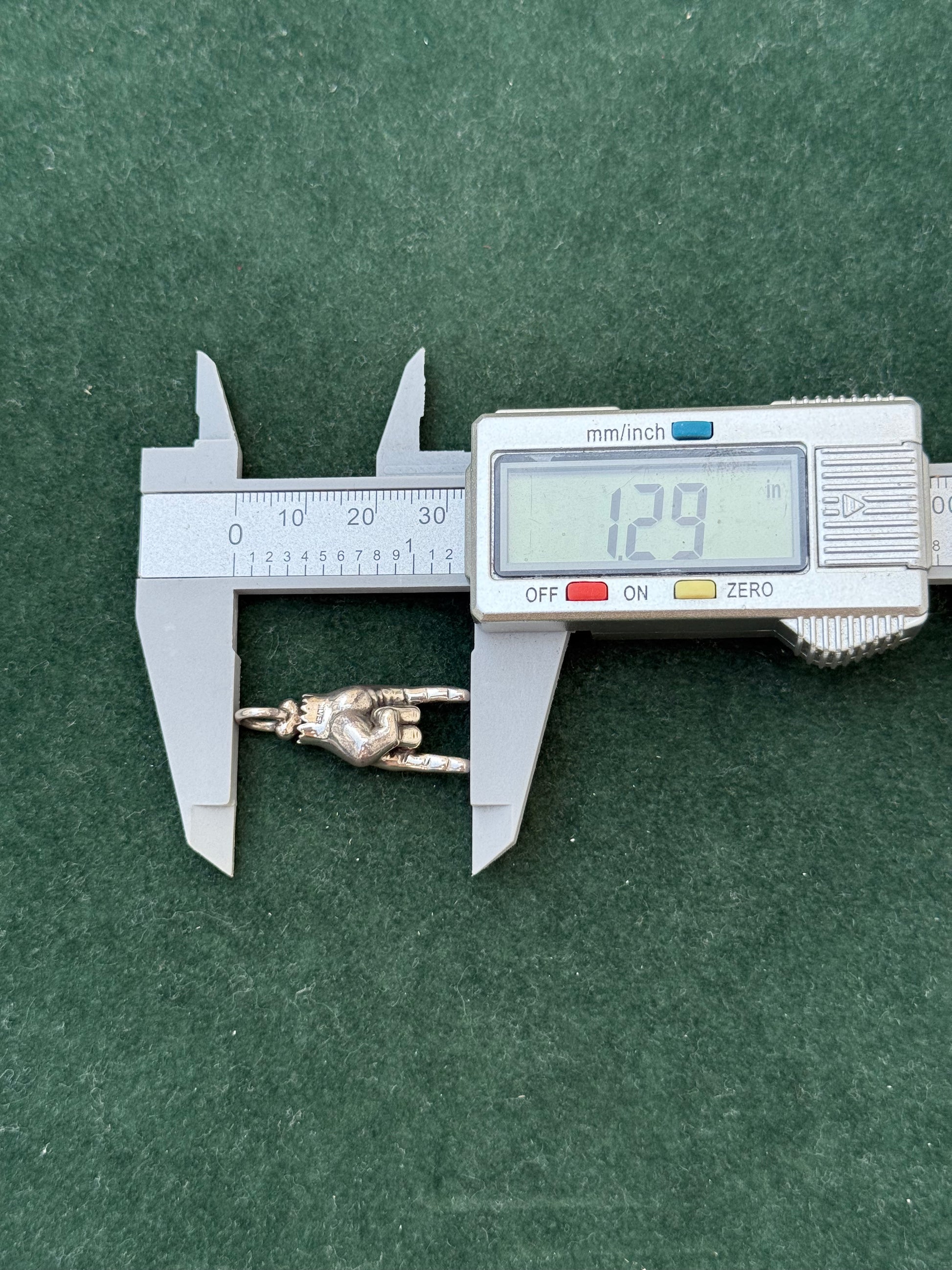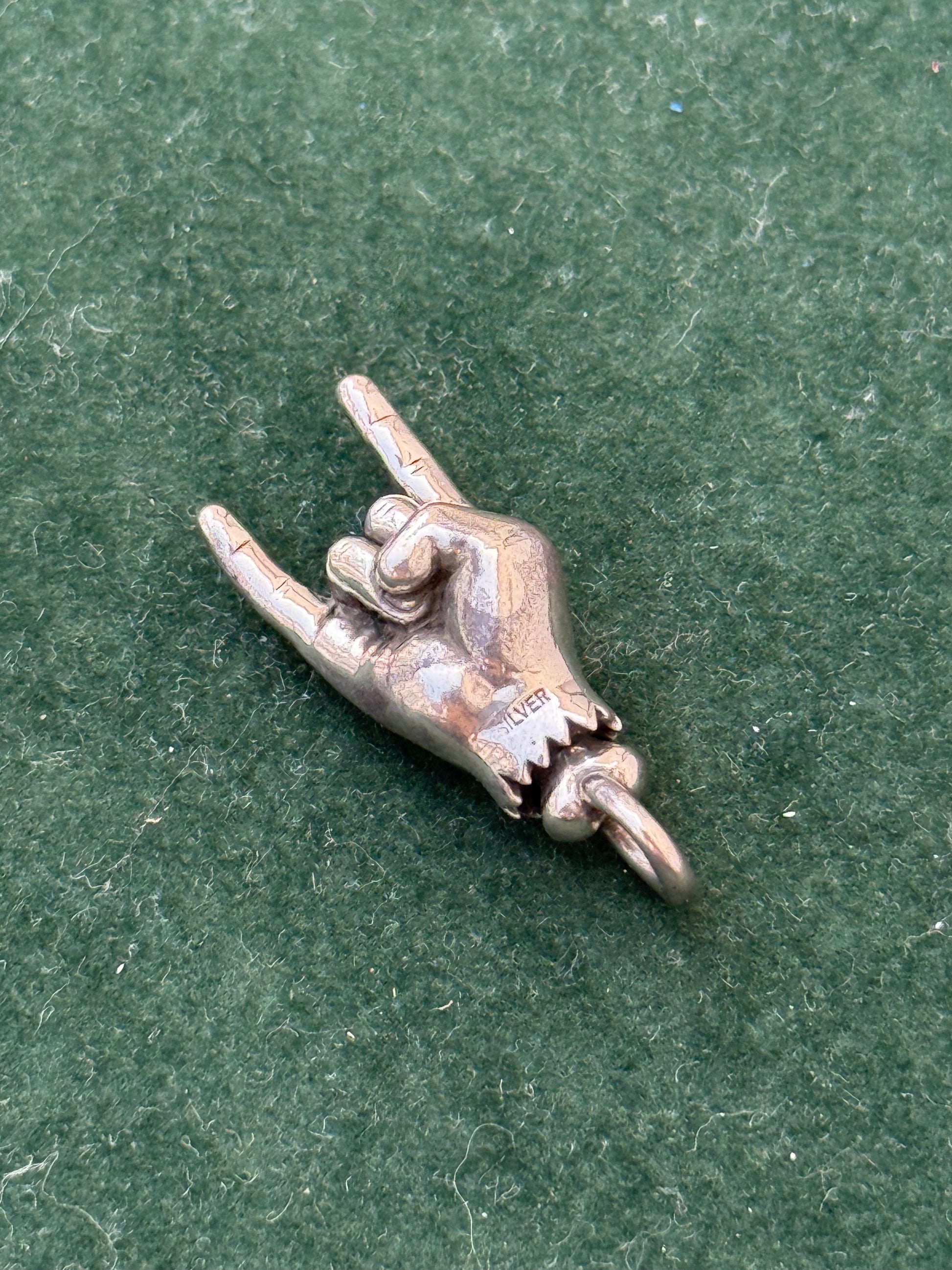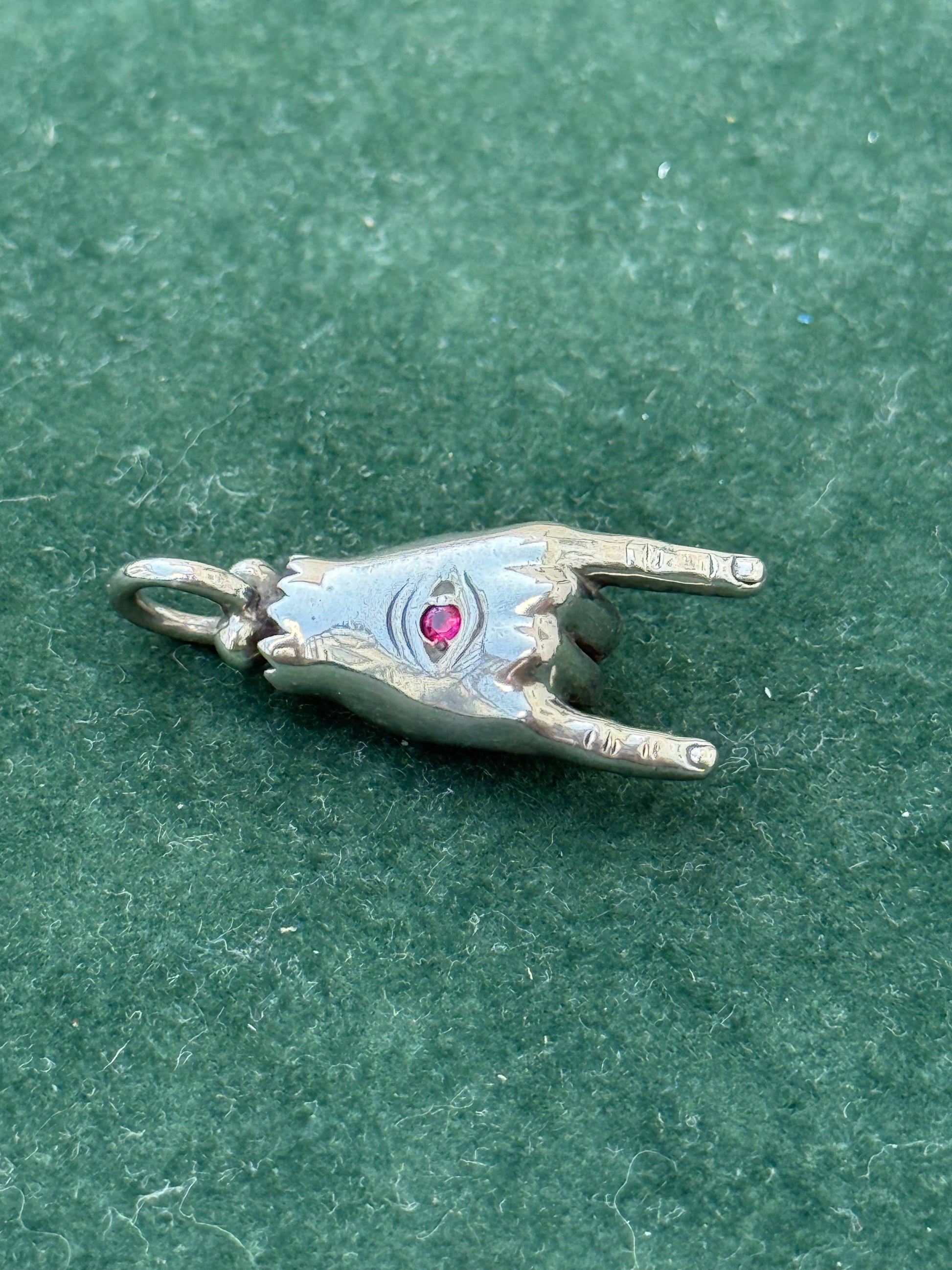 Unique sterling silver pendant shaped like the iconic devil horns hand sign, a classic symbol in rock and heavy metal culture. The palm features a detailed engraved eye set with a small red stone accent. Stamped SILVER at the base, confirming sterling construction. Perfect as a statement charm for chains, bracelets, or as part of a rock-inspired collection.