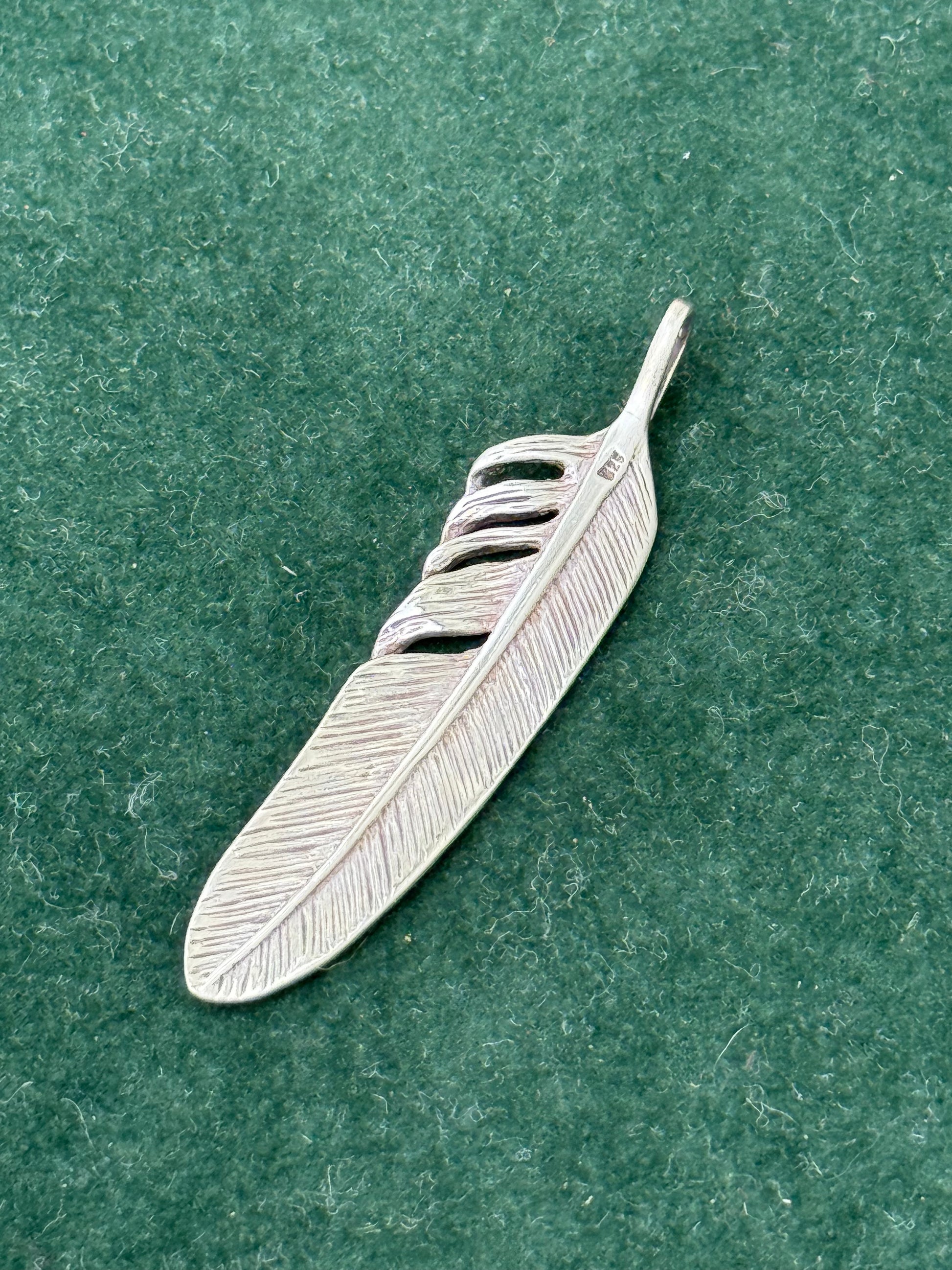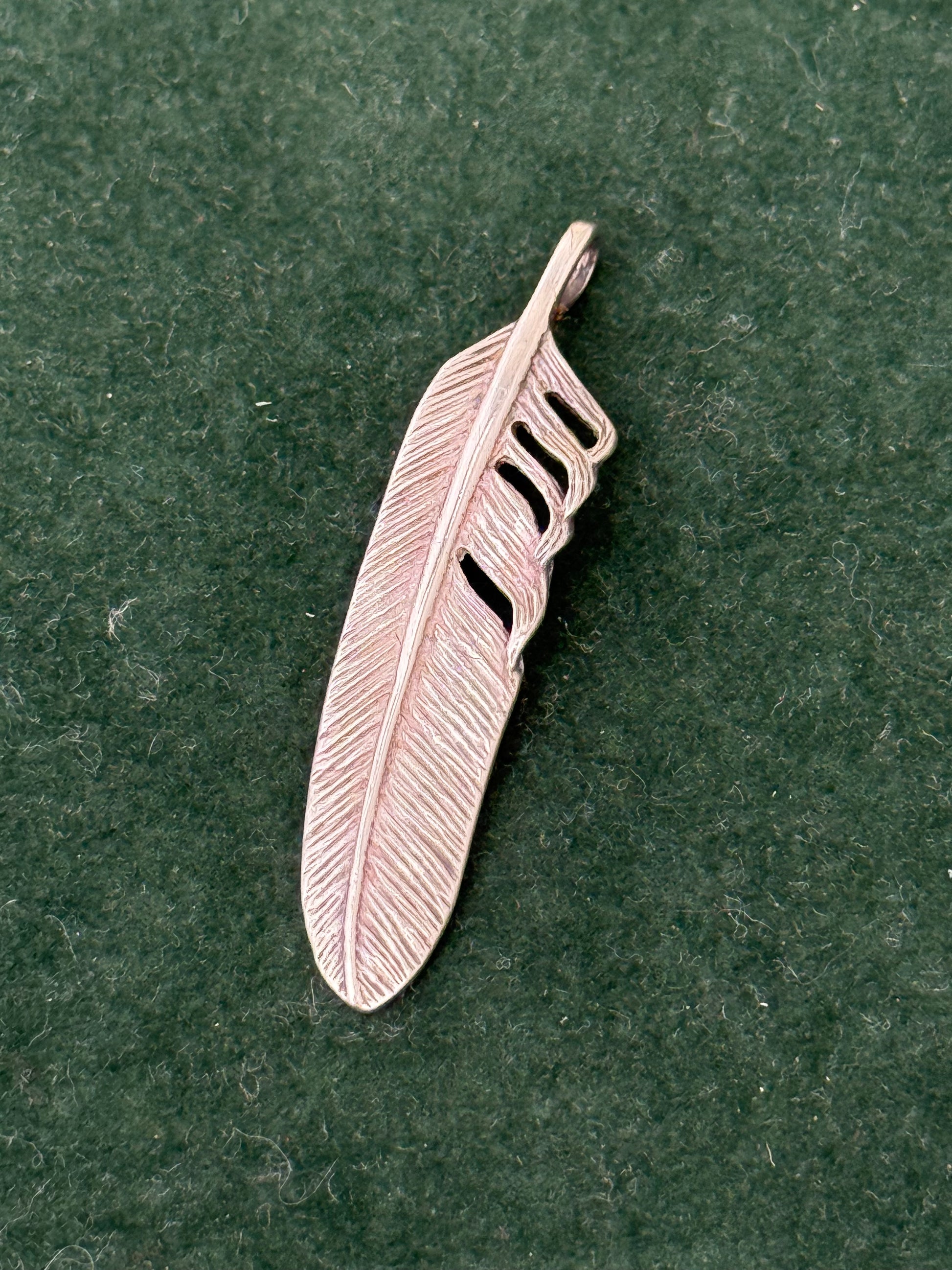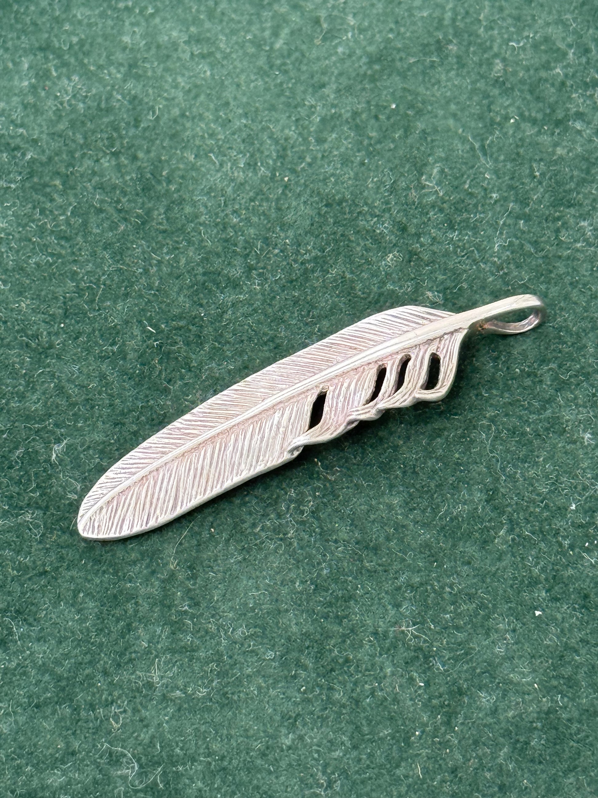 Beautiful sterling silver feather pendant with detailed etching and openwork accents. The feather is a timeless symbol of freedom, spirituality, and protection.