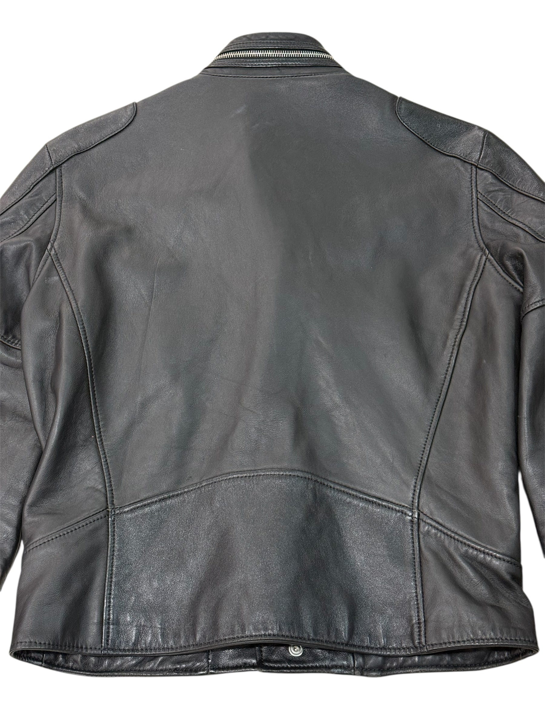 Premium soft leather with silver RIRI zippers and snap button details. Features asymmetrical zip front, three front pockets, and adjustable collar strap. Fully lined with tonal embroidered logo pattern. Made in Turkey, crafted with high-quality lamb leather and viscose lining.