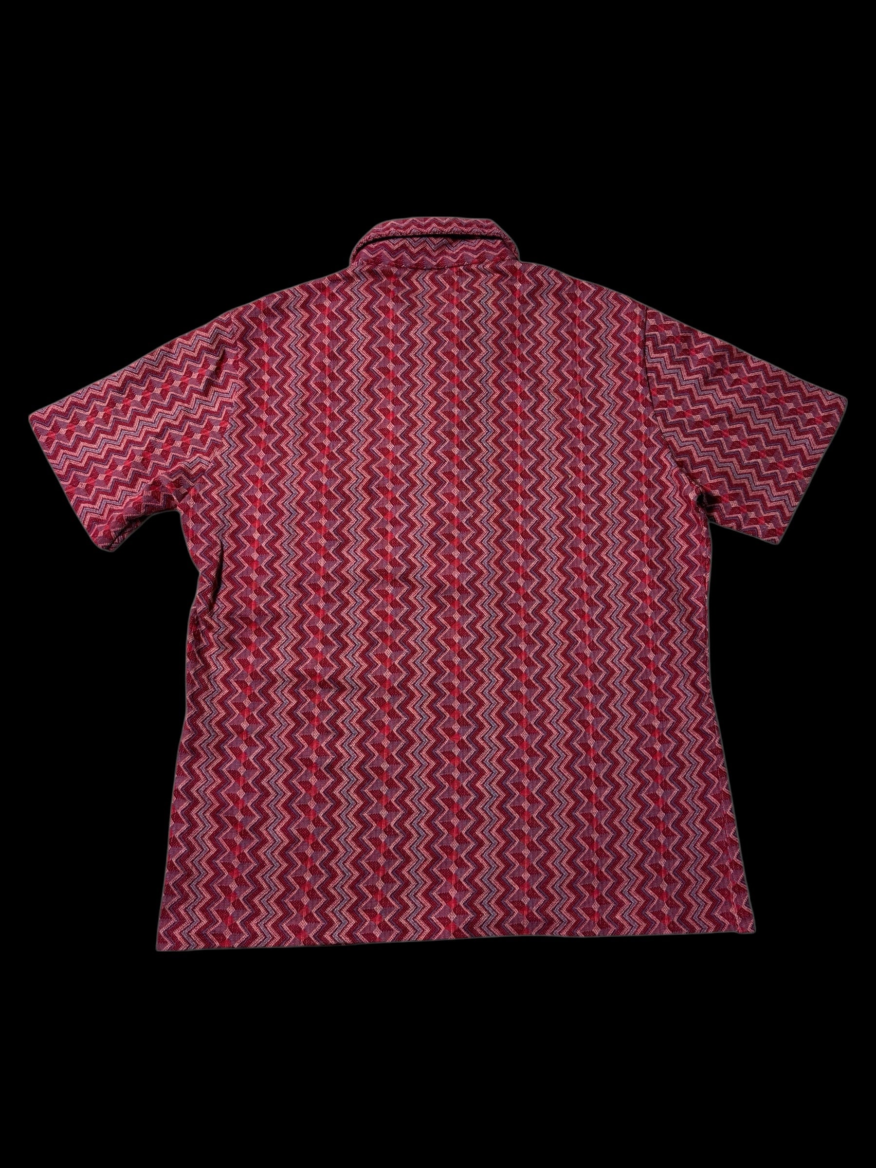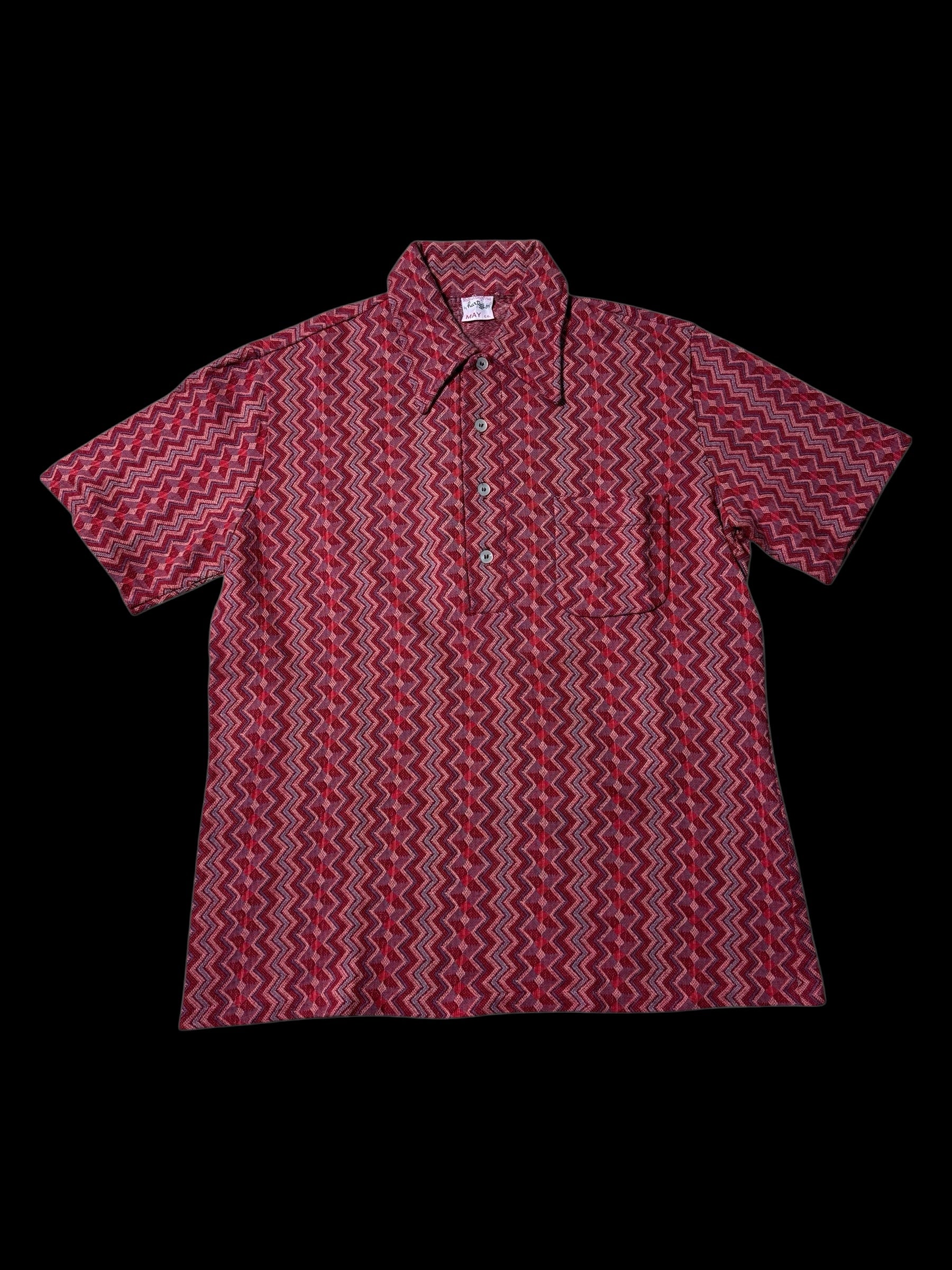 Original 1950s–1960s woven jacquard shirt by Hartog for May Co, made in California. Features a bold all-over zigzag jacquard pattern, heavyweight textured cotton fabric, and a classic mid-century short-sleeve silhouette with button front and chest pocket.