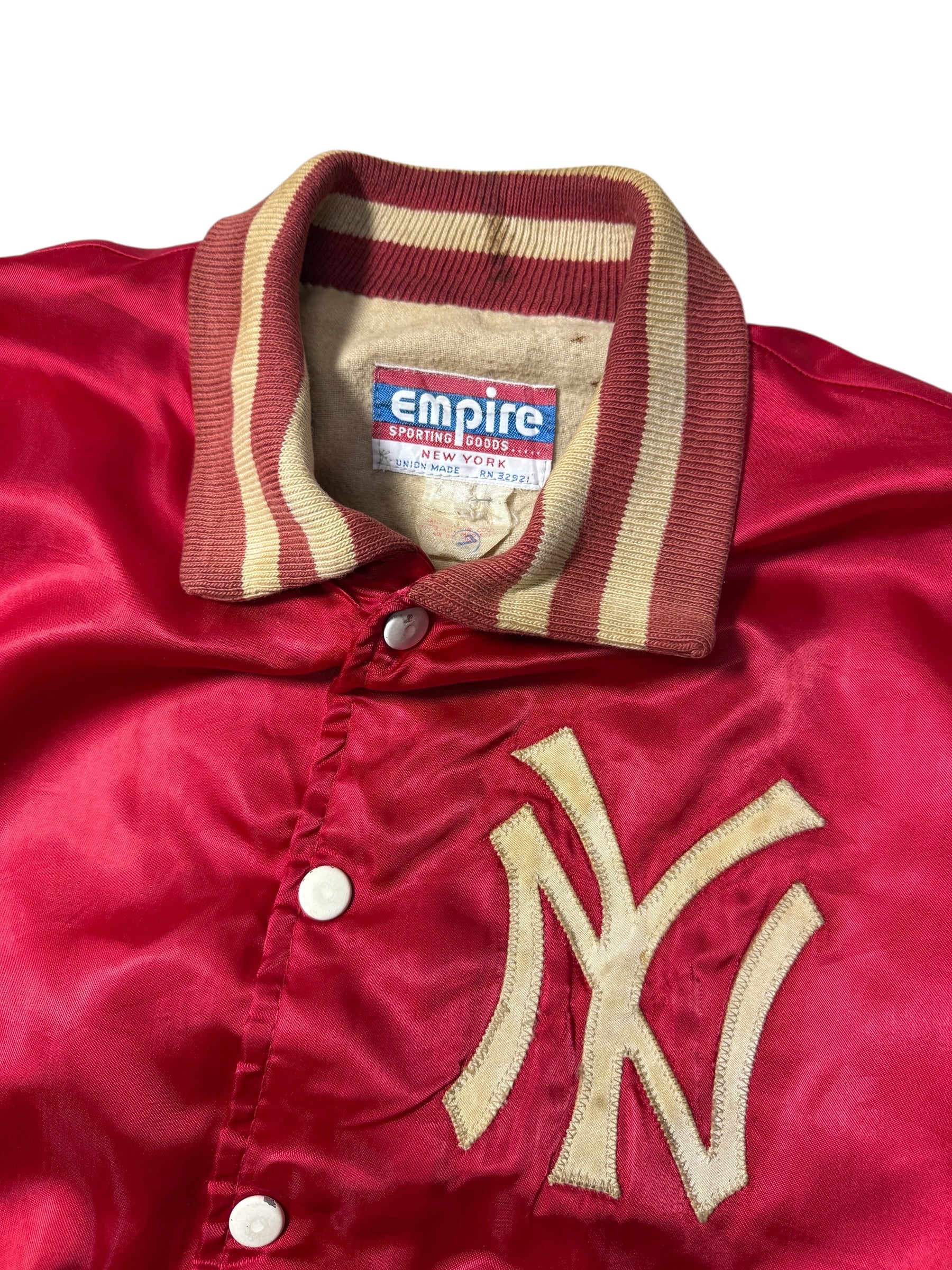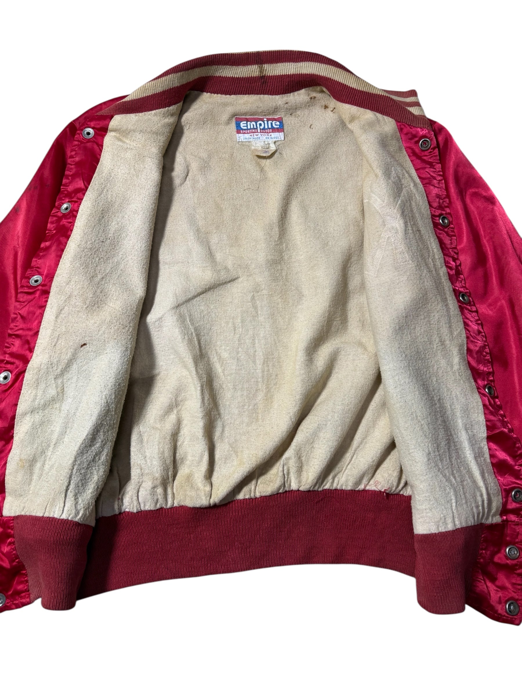 Original 1960s satin varsity jacket by Empire Sporting Goods, New York, featuring a glossy red satin shell, classic ribbed collar/cuffs/hem, and felt appliqué NY chest logo. Traditional snap-button front with period-correct hardware and a cotton flannel lining typical of mid-century American sportswear.