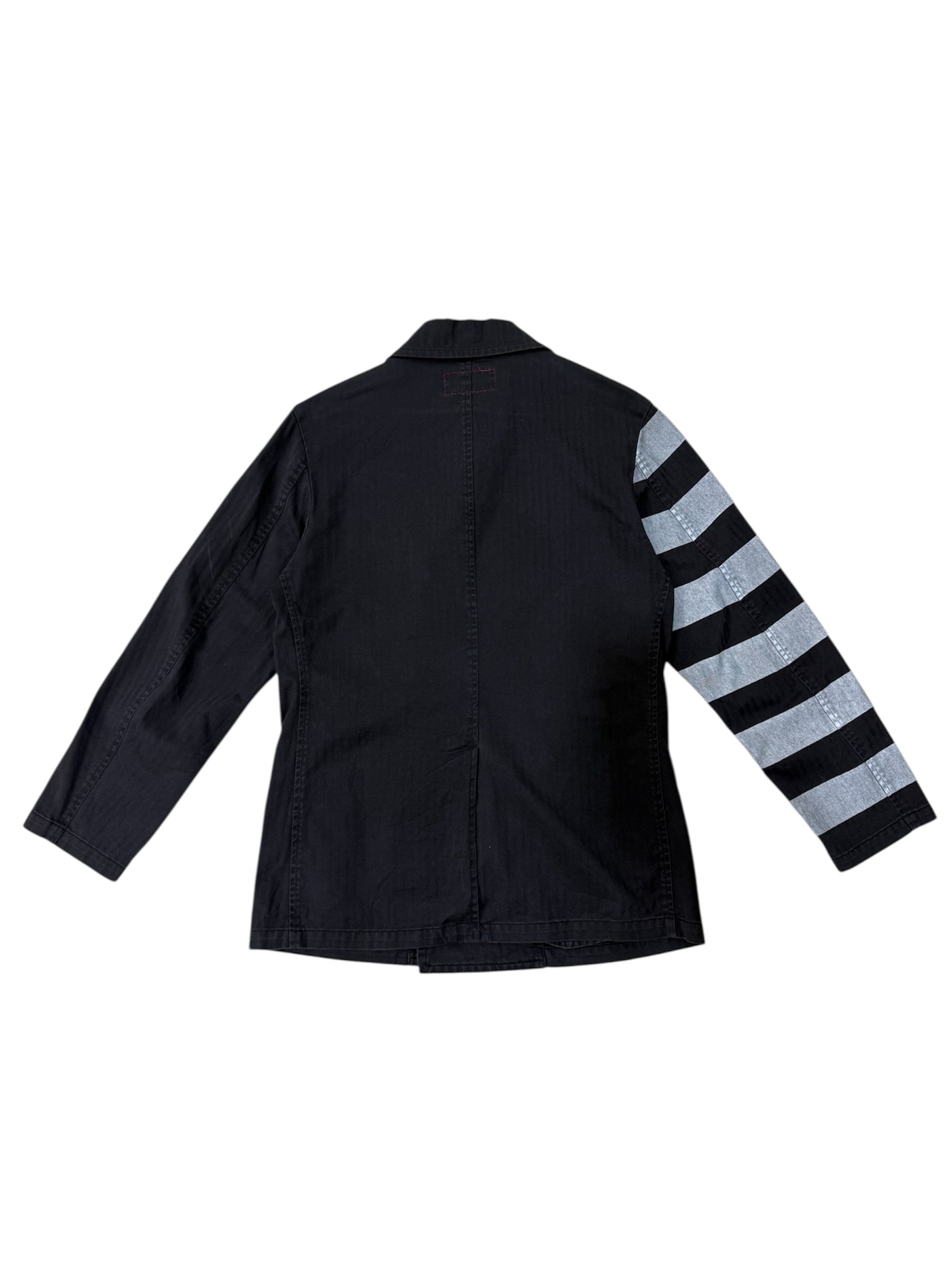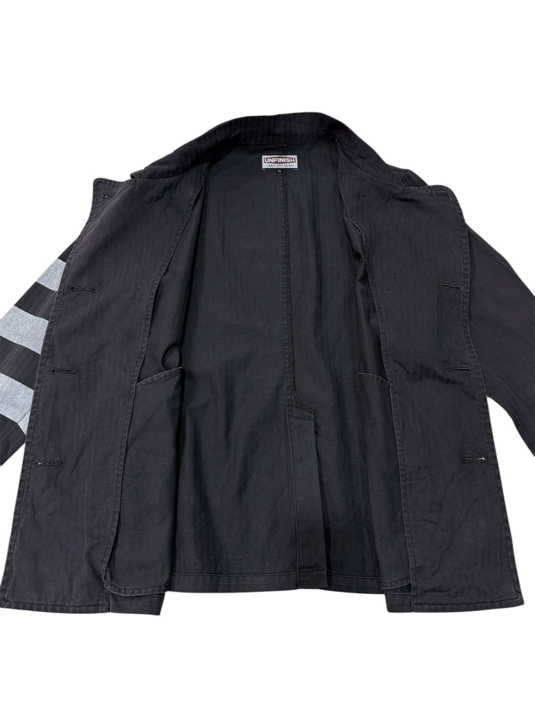 UNFINISH INC. Japan Black Herringbone Double-Breasted Work Jacket – Striped Sleeve Design