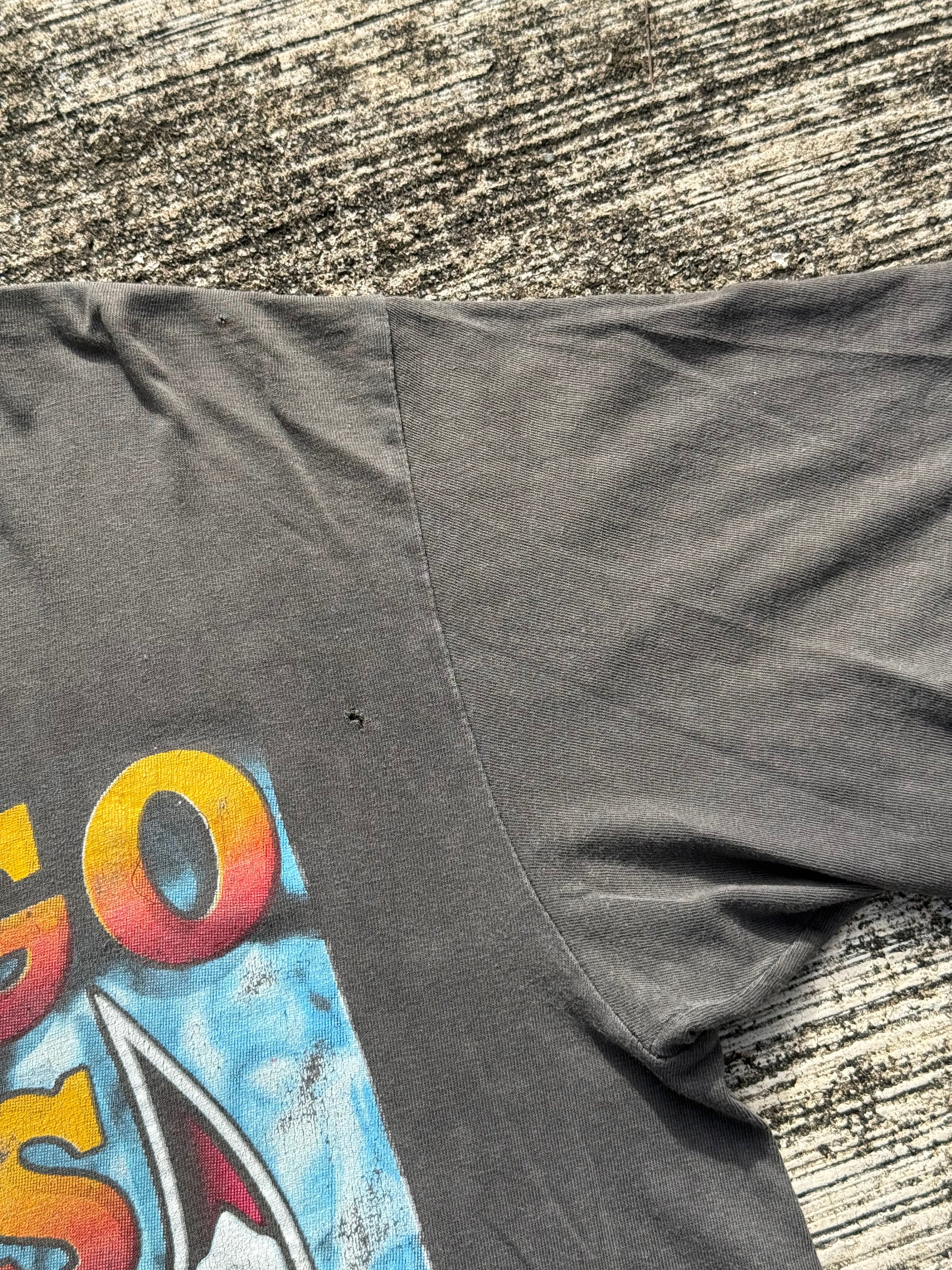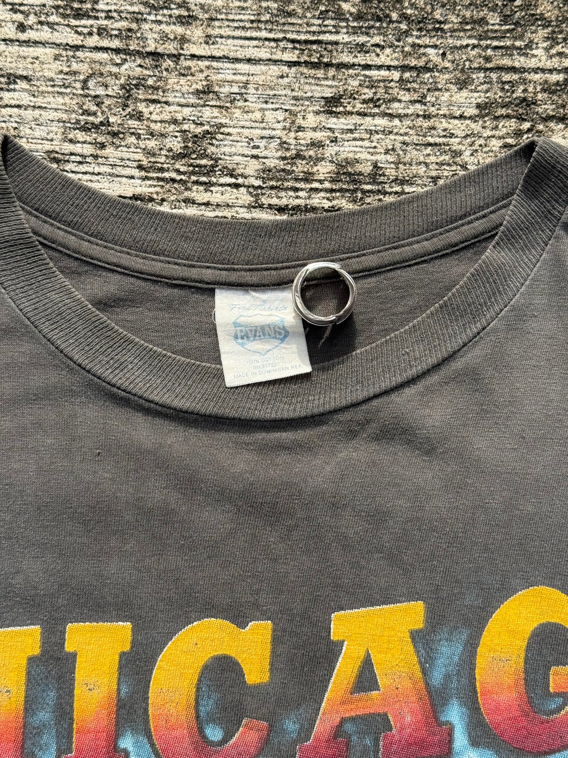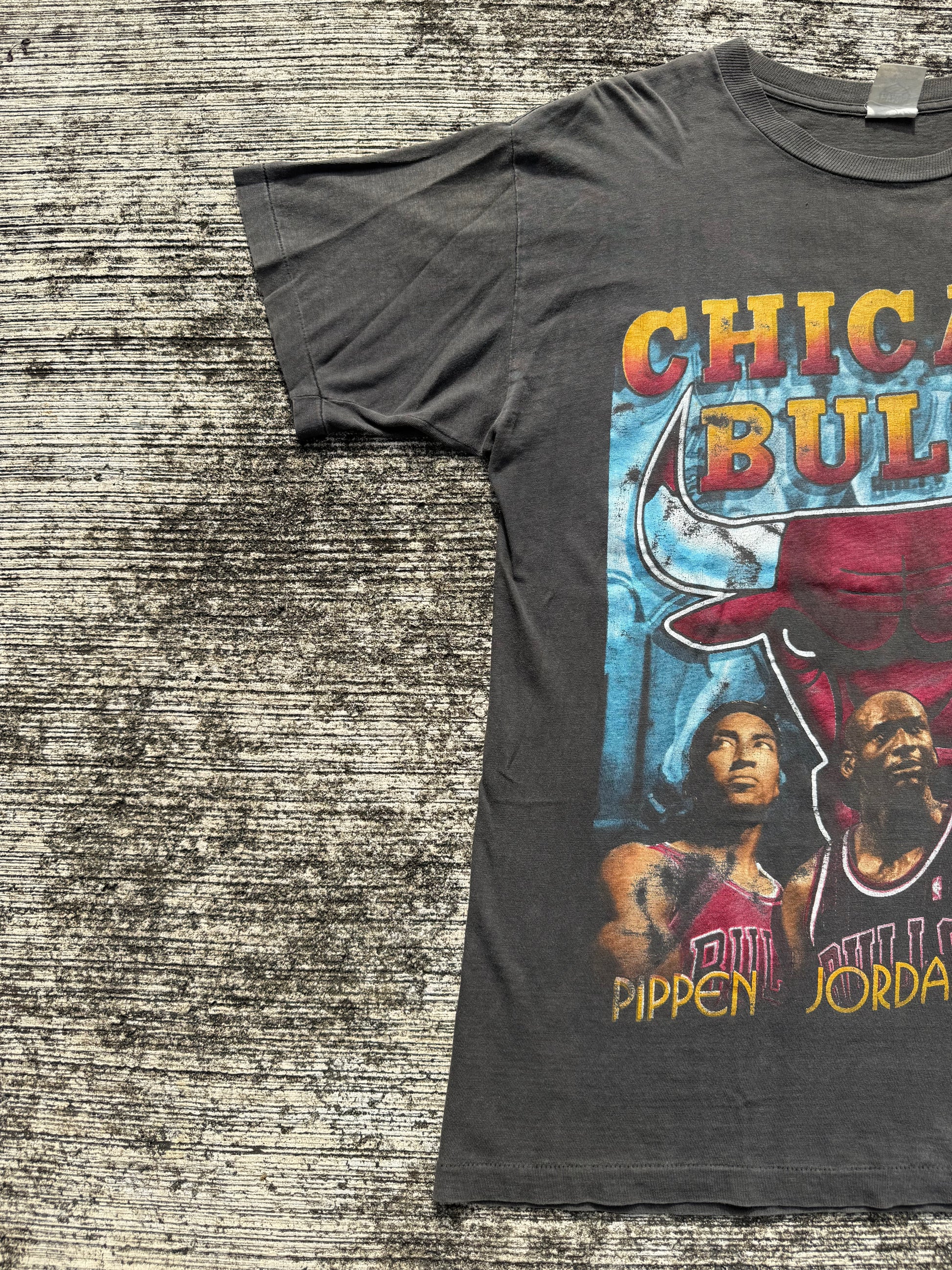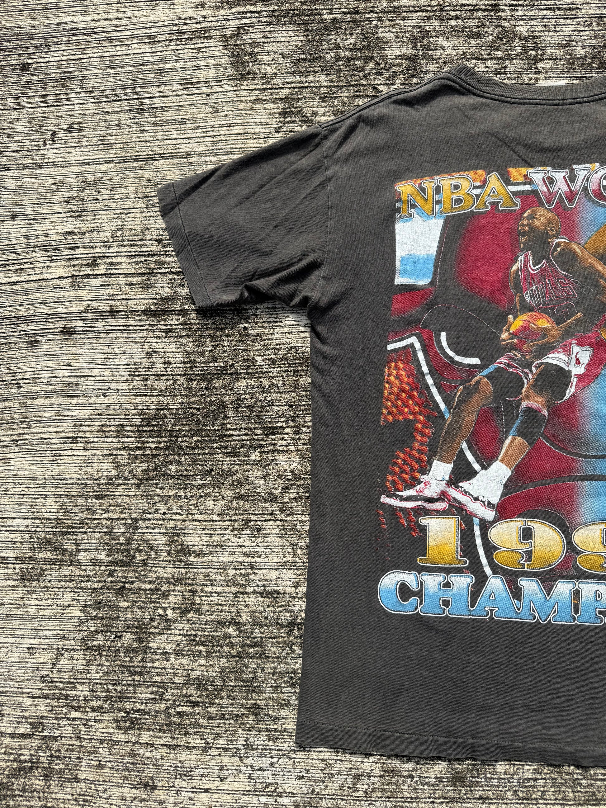 Original vintage Chicago Bulls 1996 NBA Champions t-shirt featuring Michael Jordan, Scottie Pippen, and Dennis Rodman. Double-sided graphic print with iconic Bulls logo and championship trophy. True 90s collectible for basketball fans and vintage sportswear collectors.