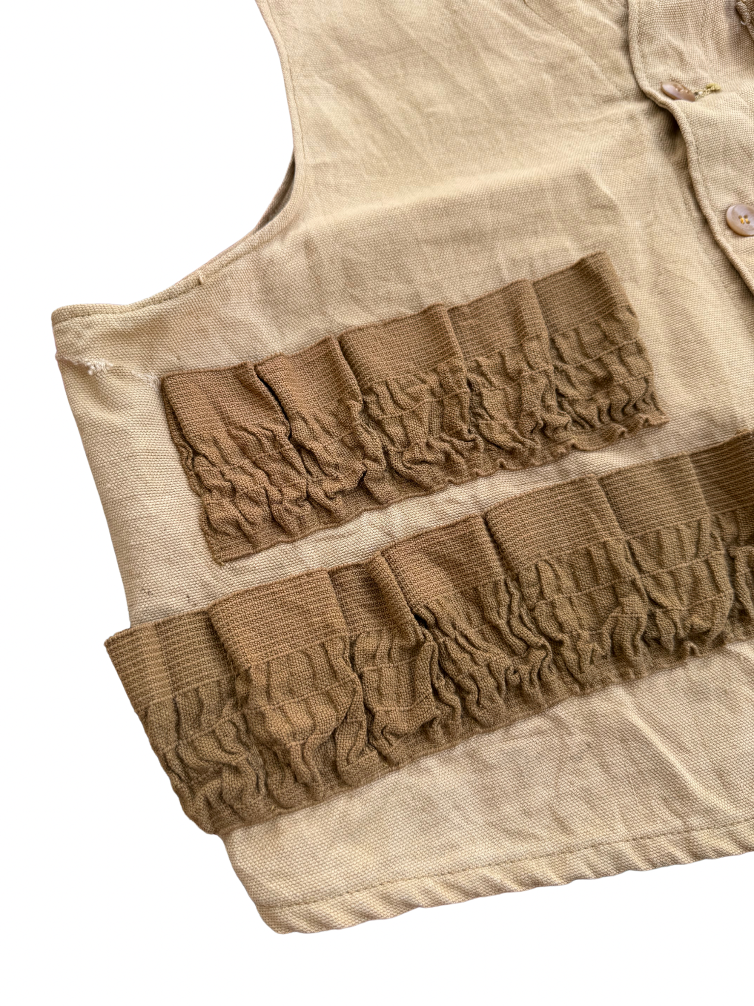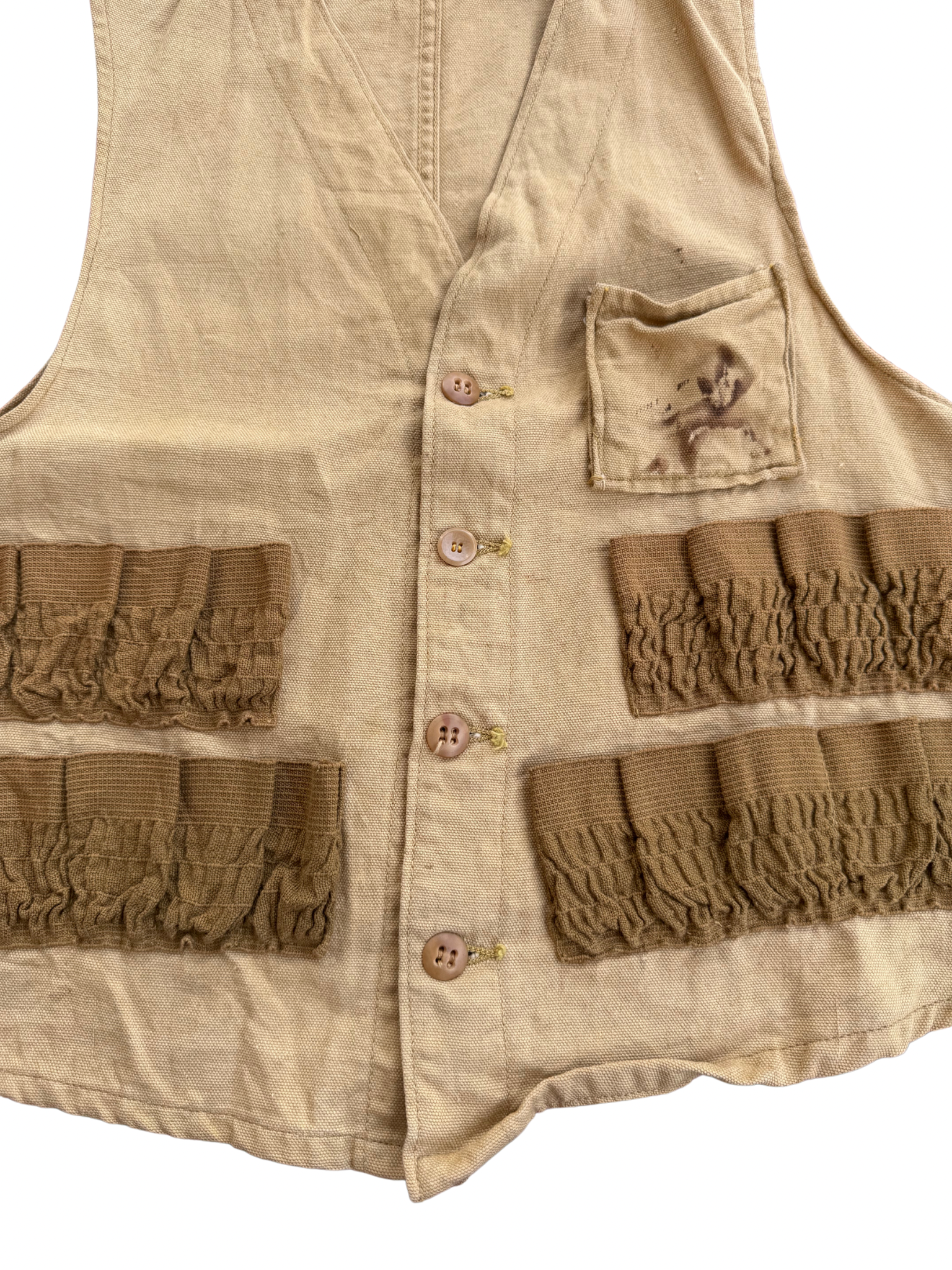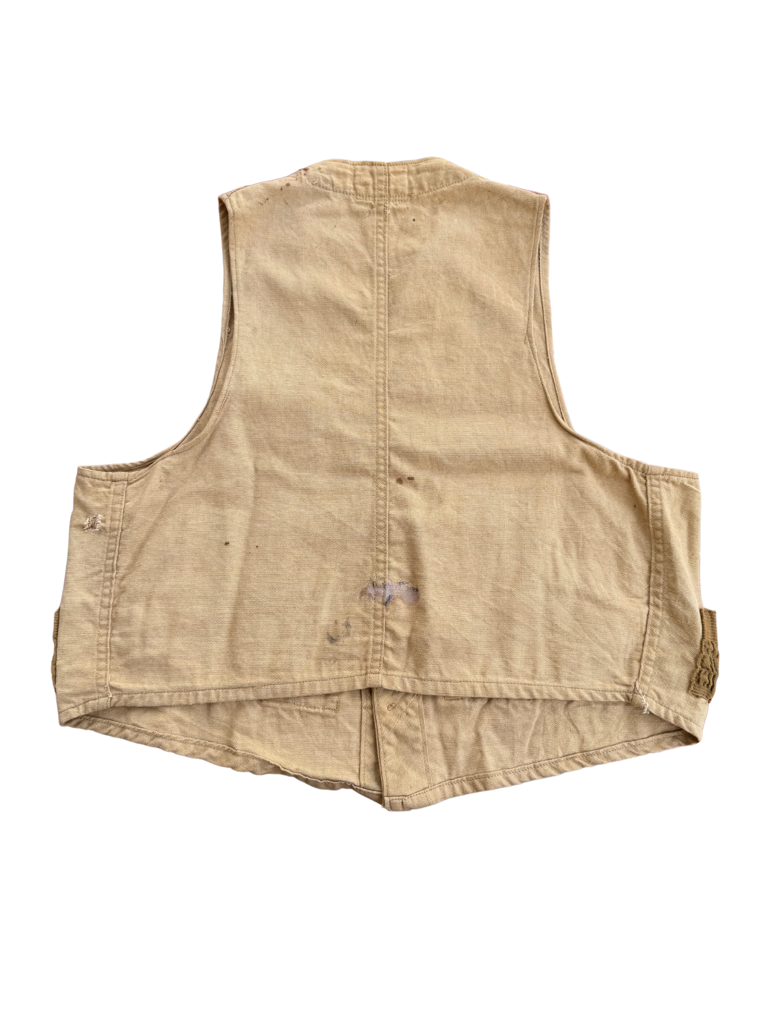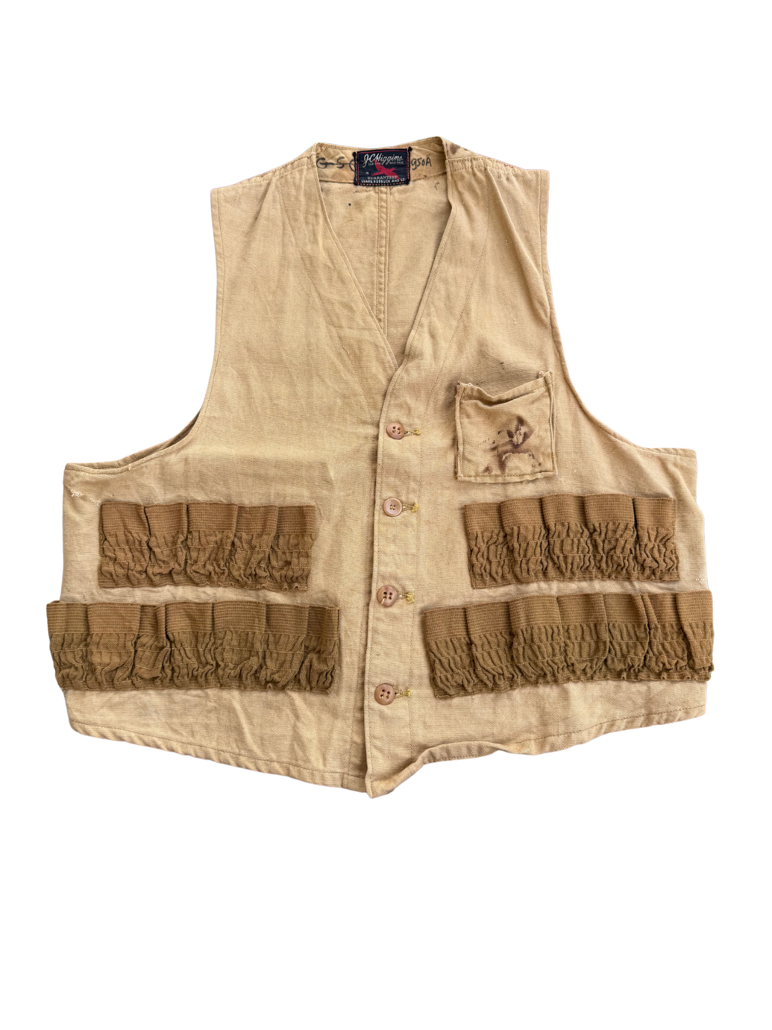 Original mid-century J.C. Higgins hunting vest, sold through Sears Roebuck & Co. Made in USA, featuring tan canvas body with brown elastic cartridge loops across the front. Classic utilitarian design built for field use, lightweight yet durable. Early J.C. Higgins woven label with red flying duck graphic (used circa 1940s–50s). Button-front closure, small chest pocket, and distinctive reinforced stitching typical of pre-war Sears outdoor garments. Shows authentic patina and wear consistent with age, visible stains and small holes add genuine character.