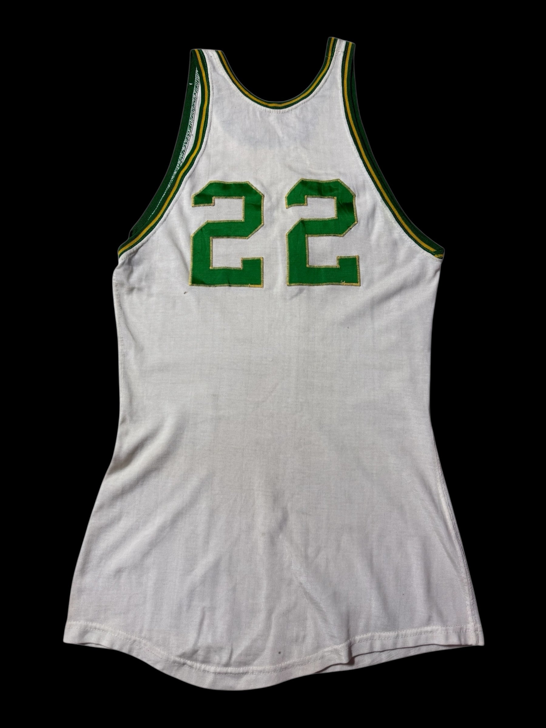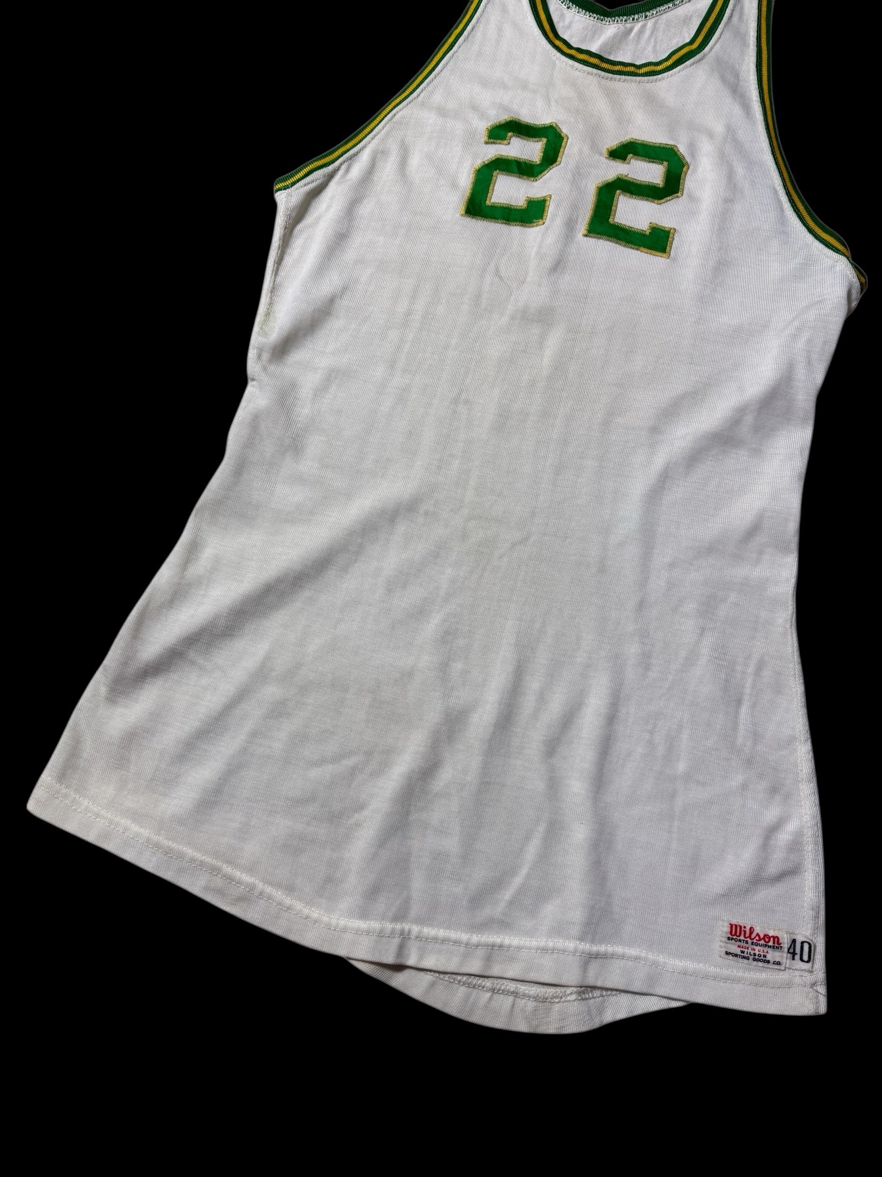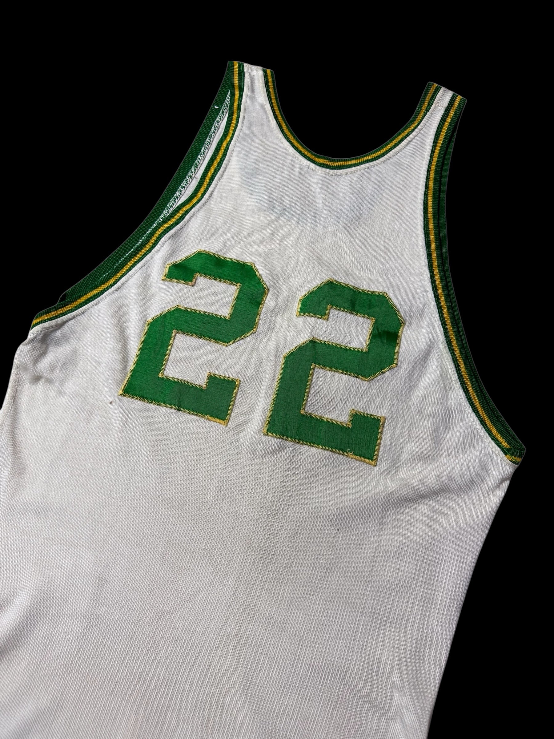 Authentic vintage basketball jersey by Wilson made in USA, dating to the late 1940s–1950s period. Classic early athletic construction with sleeveless cut, long length body, and stitched felt number 22 on front and back. Finished with green and yellow ribbed trim typical of mid-century basketball uniforms. A rare pre-NBA era sportswear piece suitable for archive collection or vintage styling.