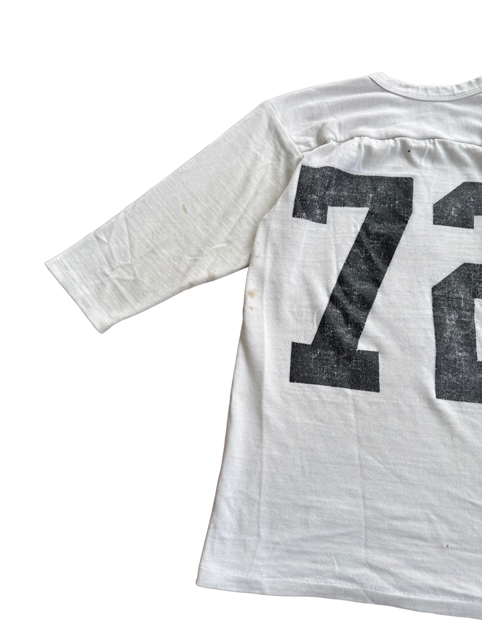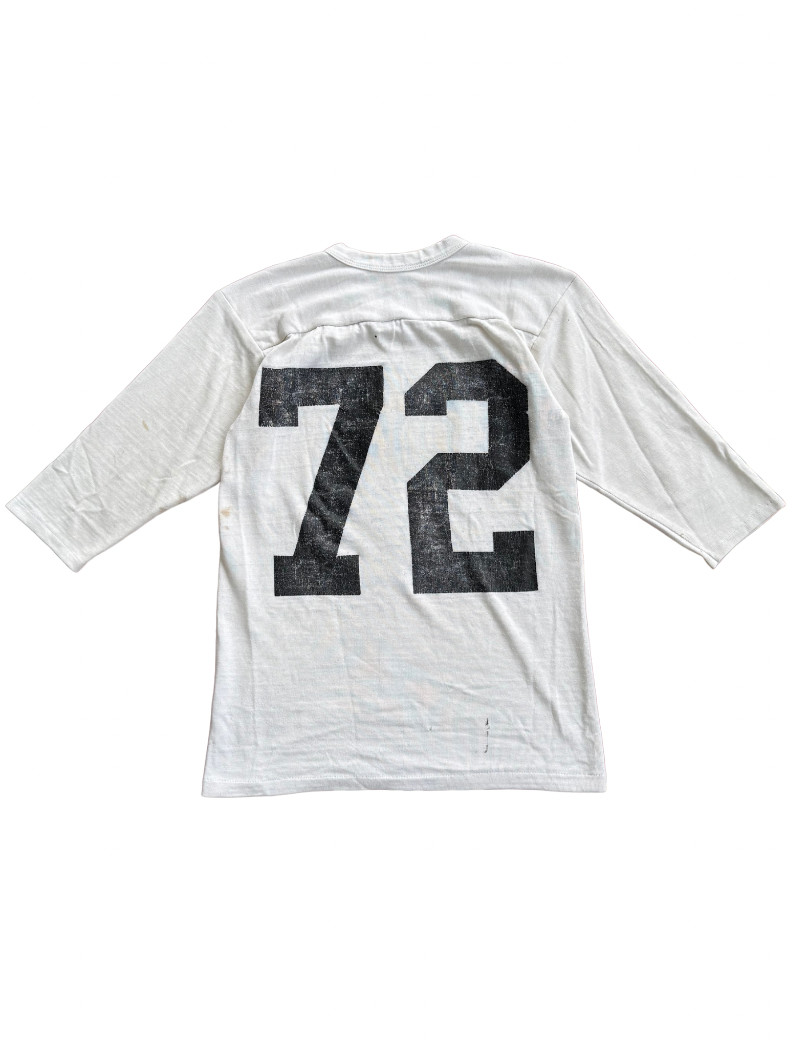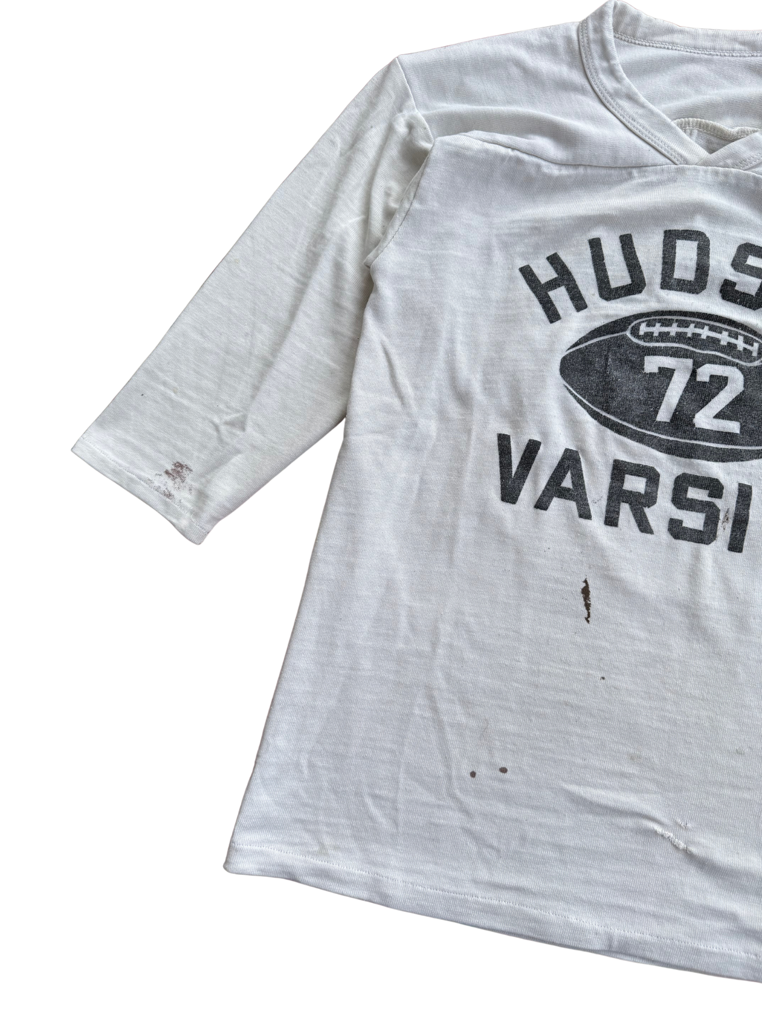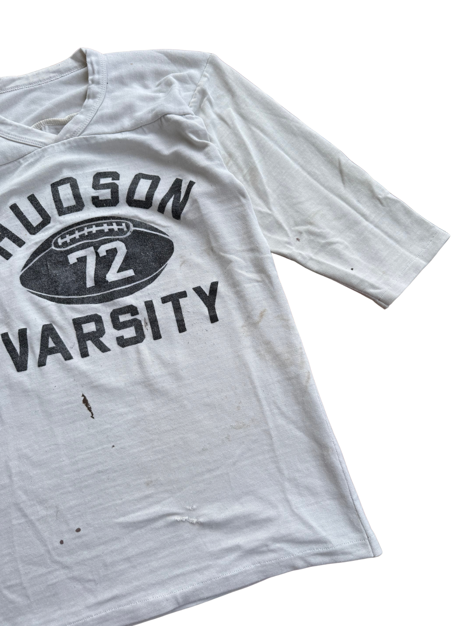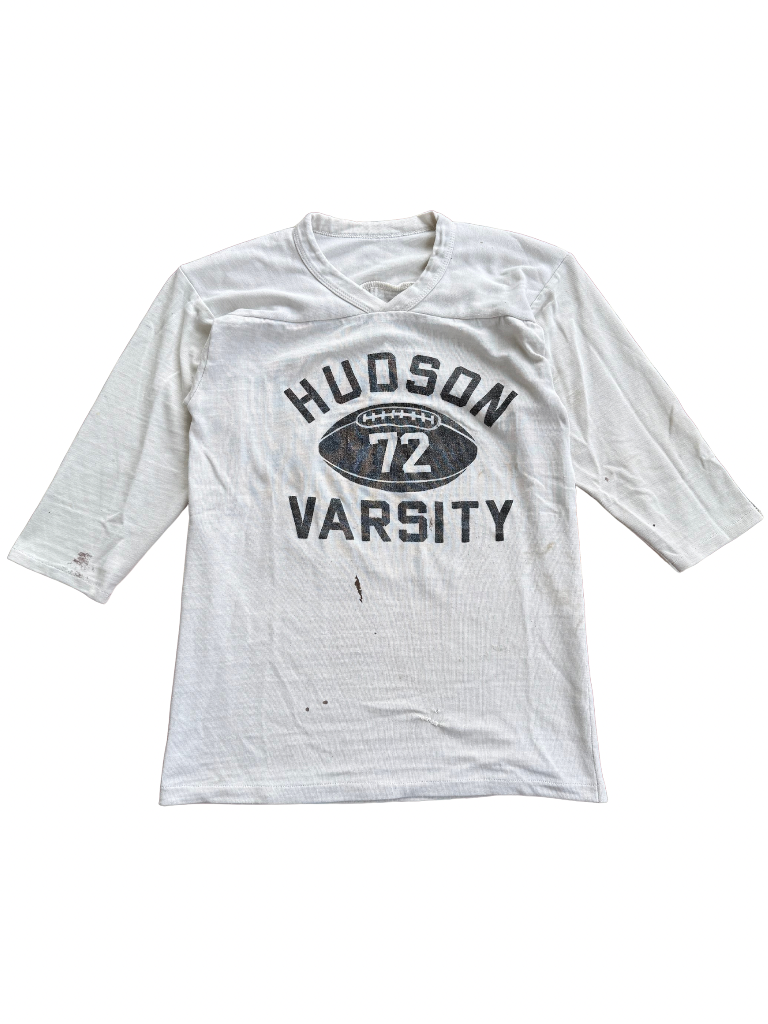 Original Hudson Varsity football practice tee from the 1950s–early 1960s, featuring bold “72” number print front and back with football motif graphic. Made in USA from midweight cotton jersey with classic 3/4 raglan sleeves and vintage V-neck insert panel construction typical of athletic wear from the period. A true piece of American sportswear history, these shirts were worn by local varsity teams and small colleges pre-polyester era, before mass-produced athletic gear became standard.