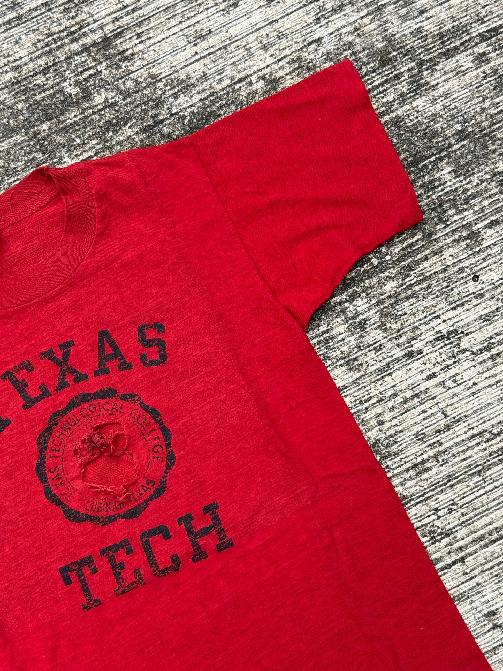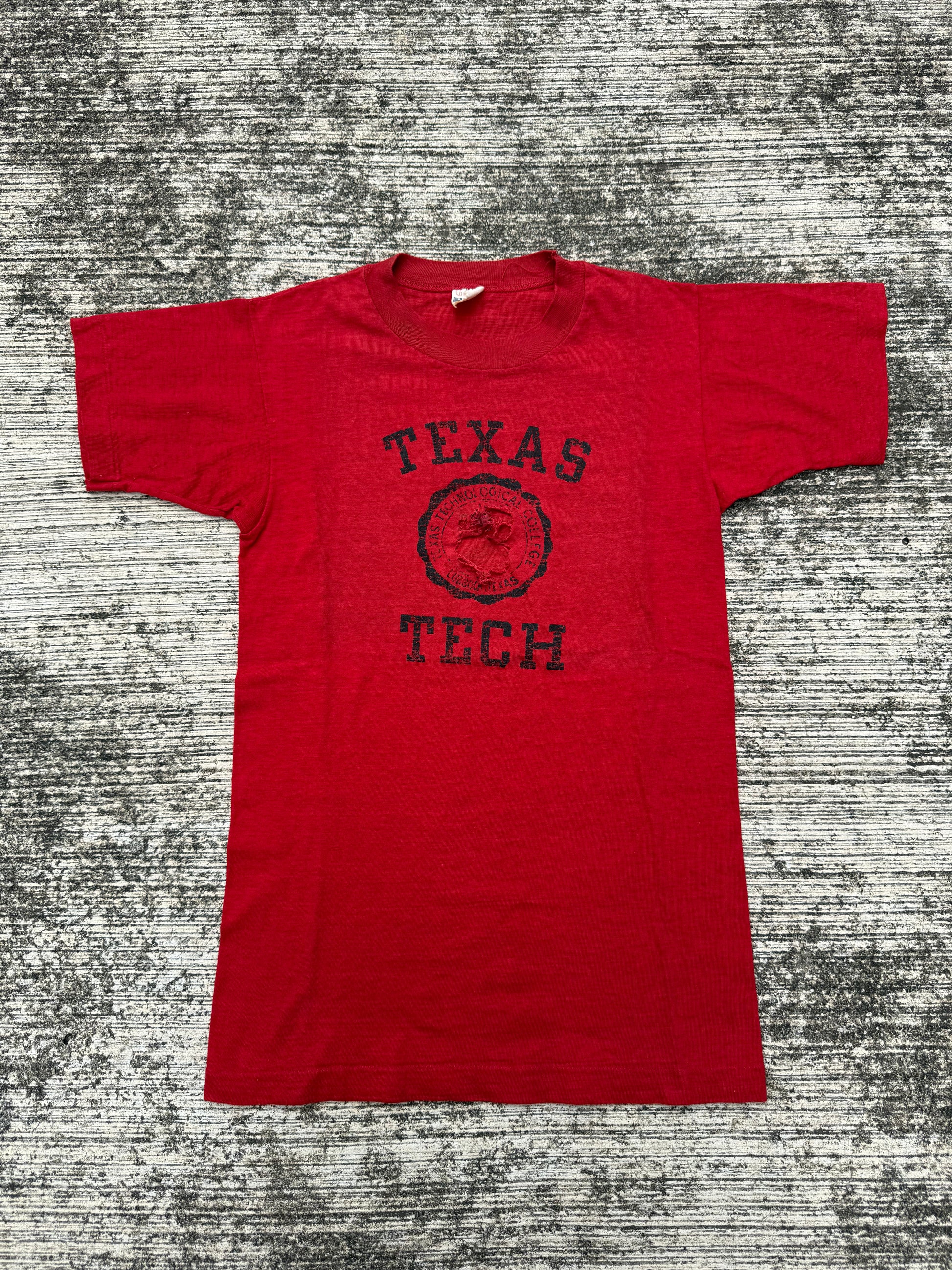 Constructed from soft red cotton with bold black collegiate print and central Texas Tech seal. Features single stitch construction with a slim, long vintage cut. A true piece of mid-century collegiate sportswear history and an iconic Champion collectible.
