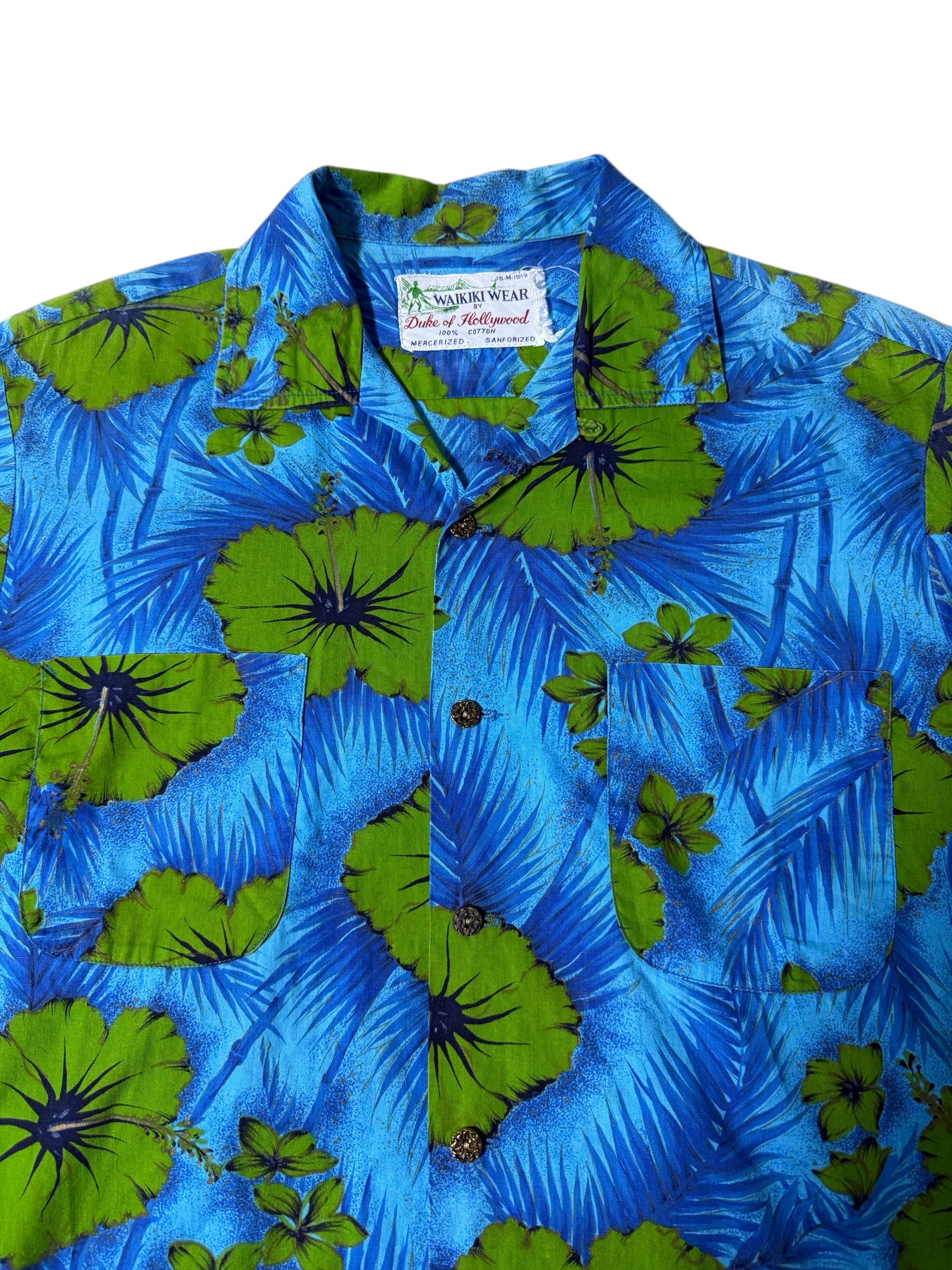 Original Waikiki Wear “Duke of Hollywood” Aloha shirt from the 1950s–60s. Beautiful blue + green hibiscus print on mercerized cotton. Classic early Hawaiian shirt construction with twin chest pockets and old-style textured buttons.